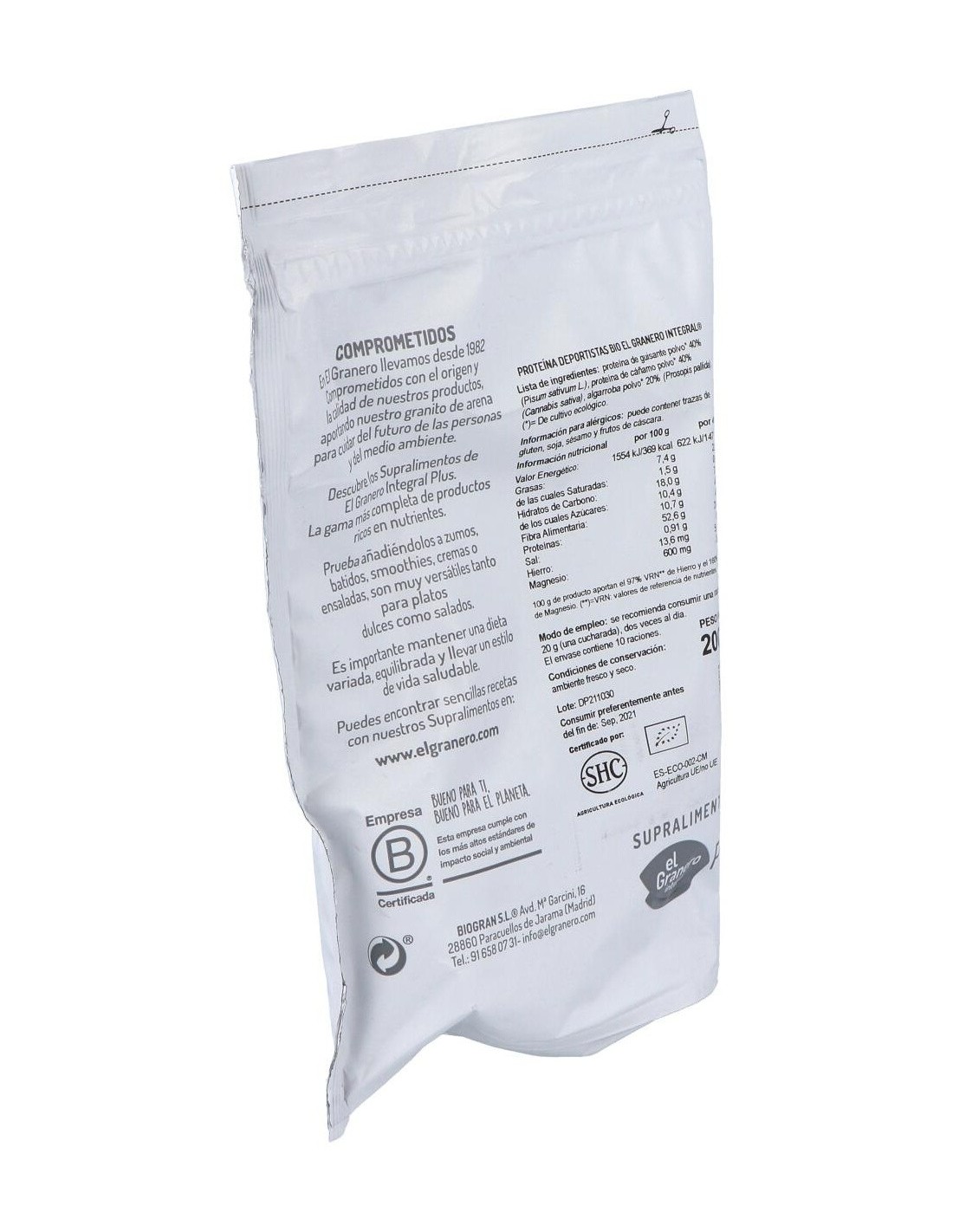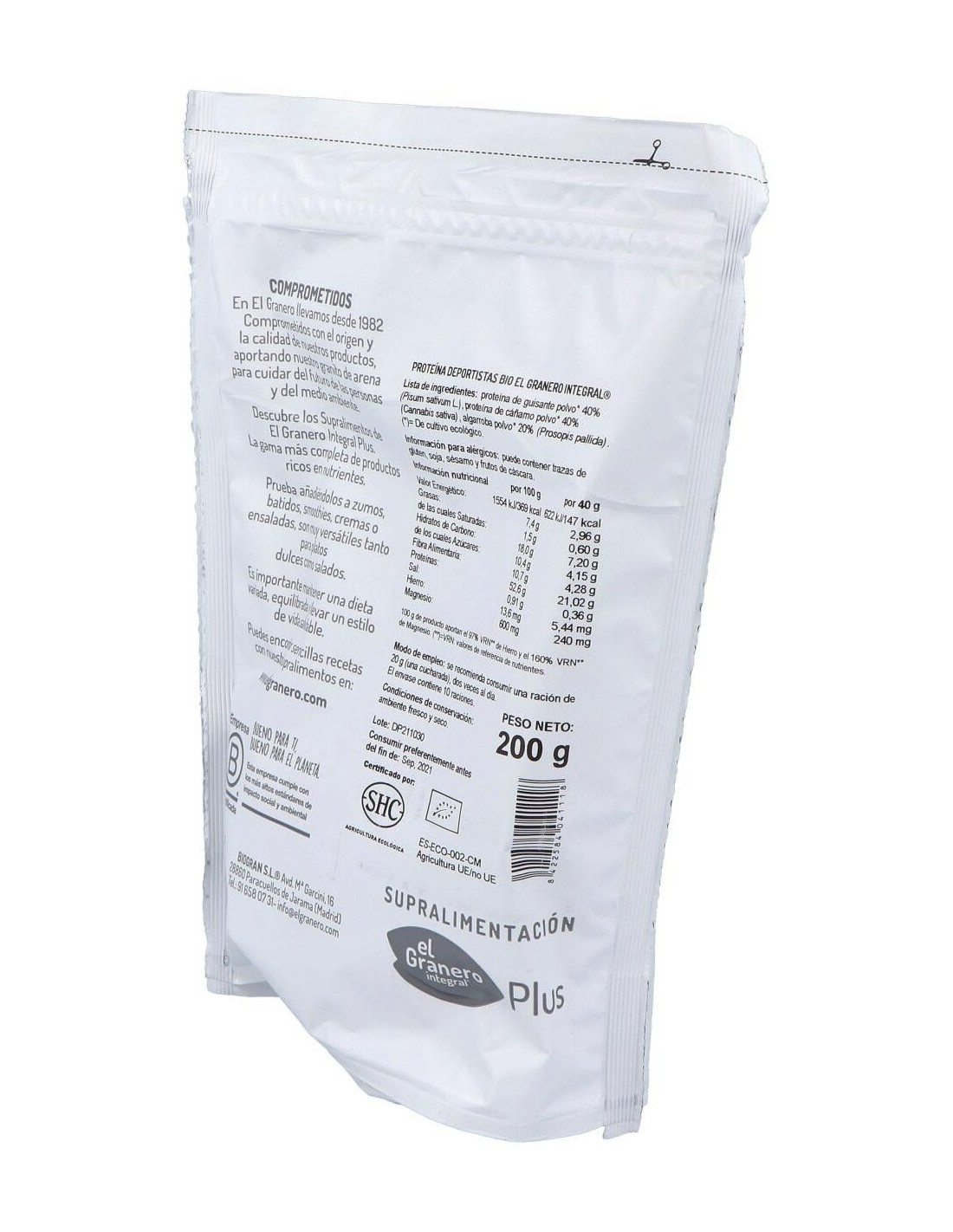 Proteína de guisante polvo* 40% (Pisum sativum L.), proteína de cáñamo polvo* 40% (Cannabis sativa), algarroba polvo* 20% (Prosopis pallida).