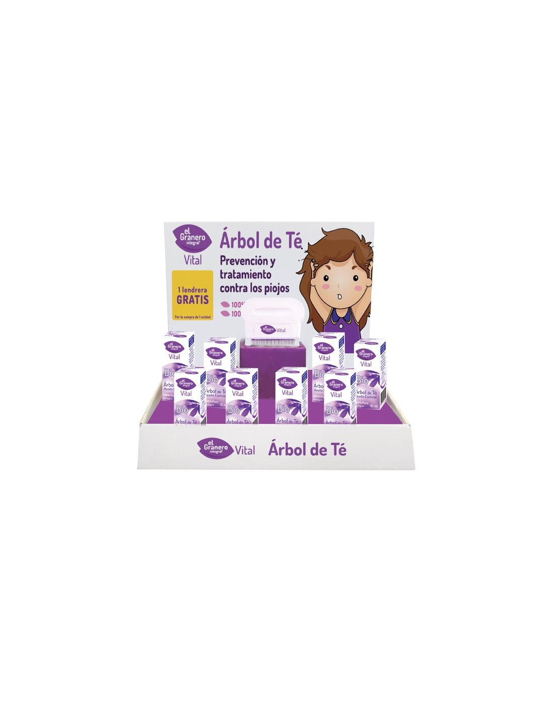 El expositor incluye 12 unidades de productos con aceite esencial de árbol de té, reconocido por sus propiedades antibacterianas y antifúngicas, ideales para combatir la caspa, la irritación y otros problemas del cuero cabelludo. Además, las 12 lendreras incluidas facilitan la eliminación de piojos y liendres de manera rápida y efectiva, sin necesidad de productos químicos agresivos.