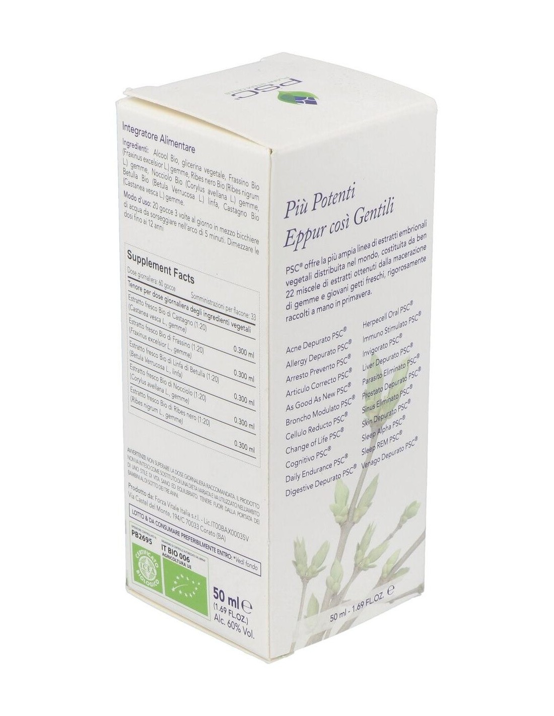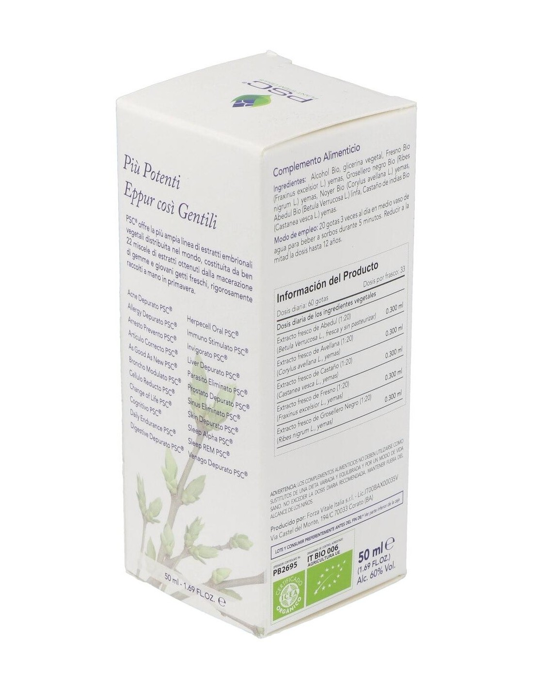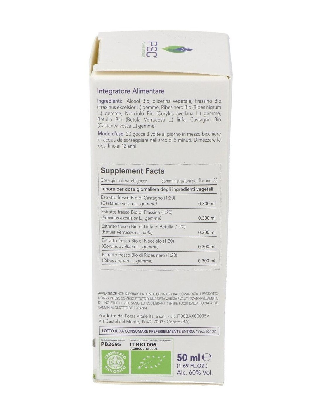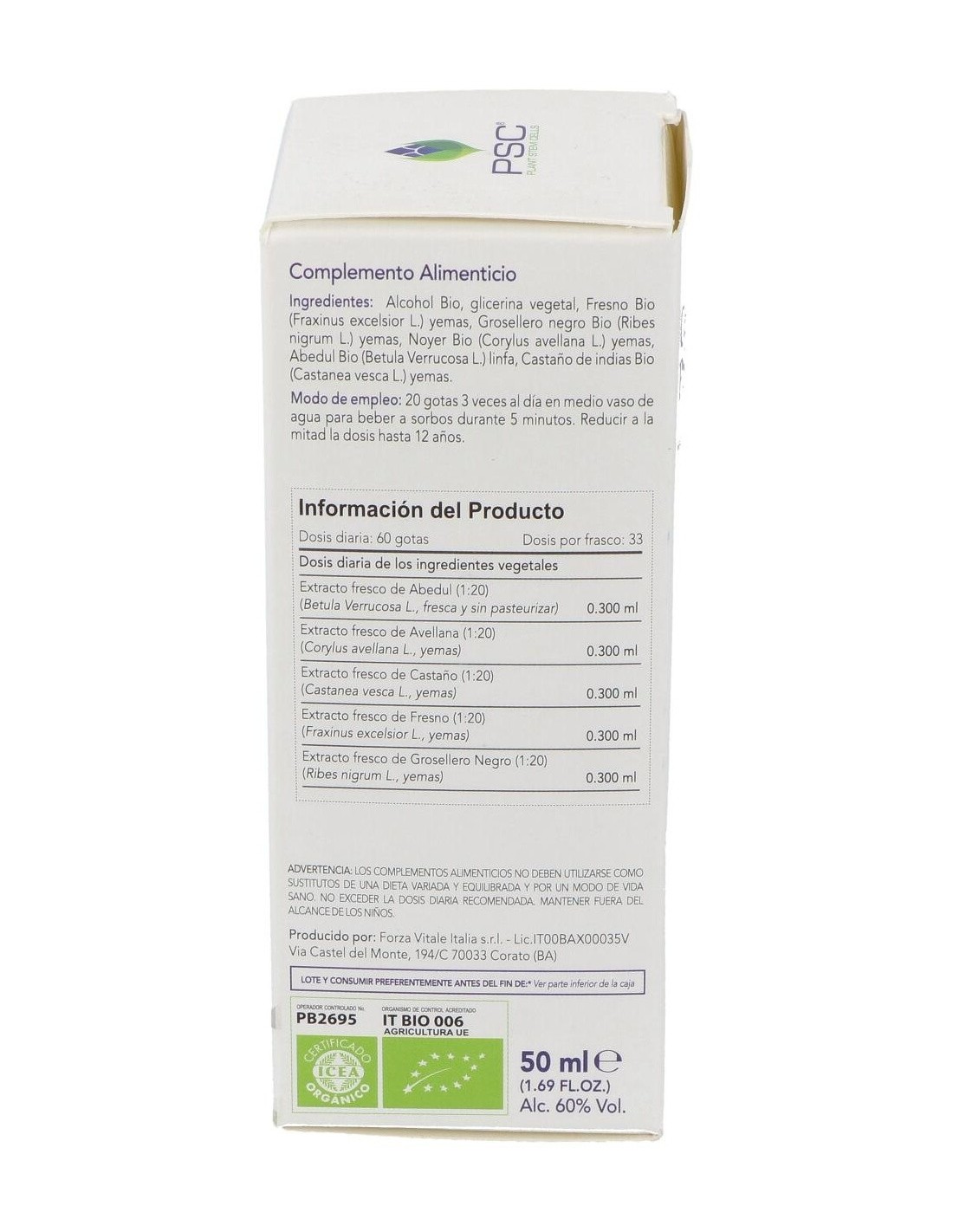 Ingredientes: Álcool orgânico, glicerol, linfa Bio PSC Bétula (Betula pendula var. verrucosa), botões orgânicos de groselha preta PSC (Ribes nigrum), botões orgânicos de cinza PSC (Fraxinus excelsior), botões orgânicos de castanha PSC (Castanea) vesca, avelã Bio PSC (Corylus) avellana) botões. *Células-tronco vegetais PSC (Células-Tronco Vegetais). Princípios ativos por dose diária (60 gotas):