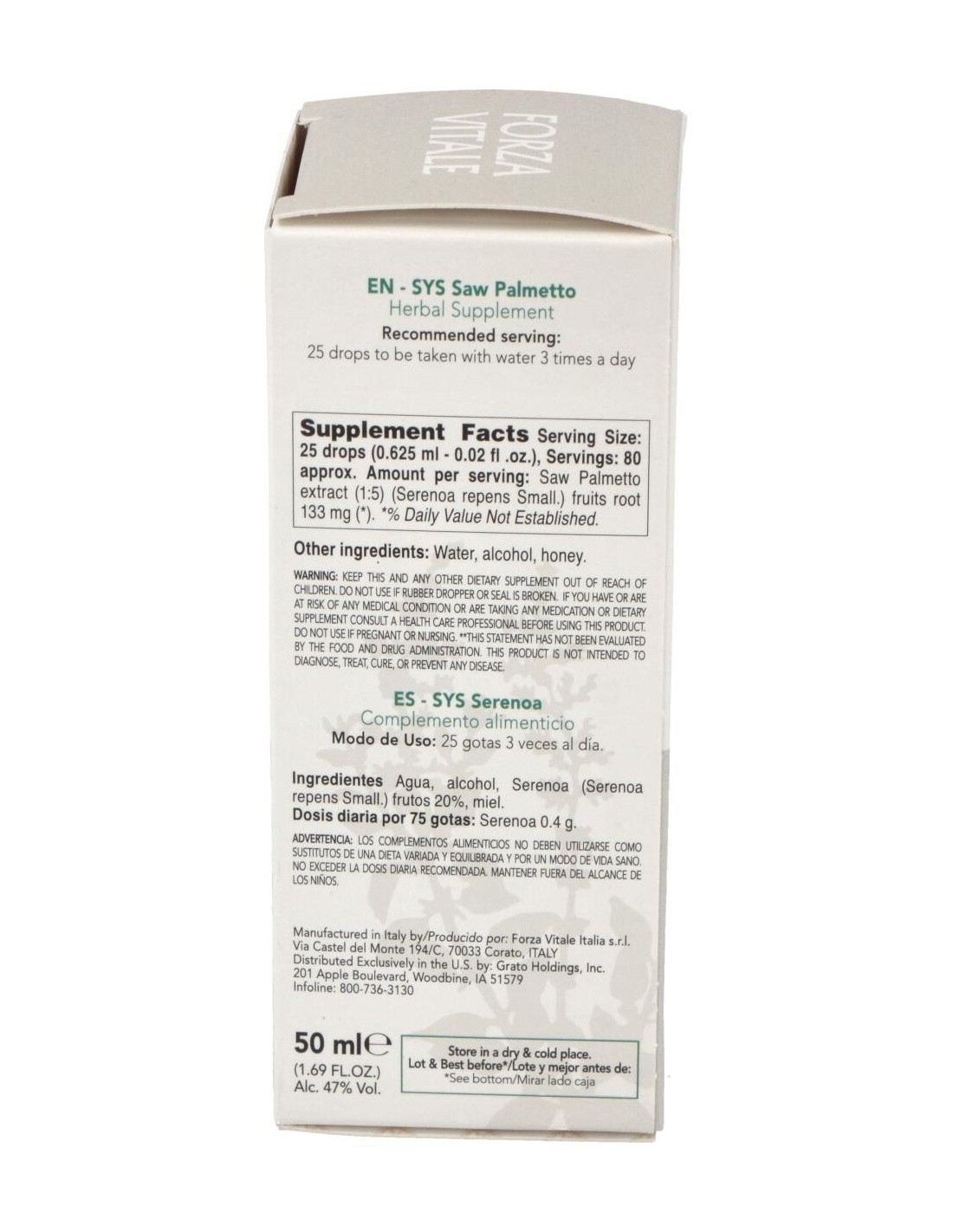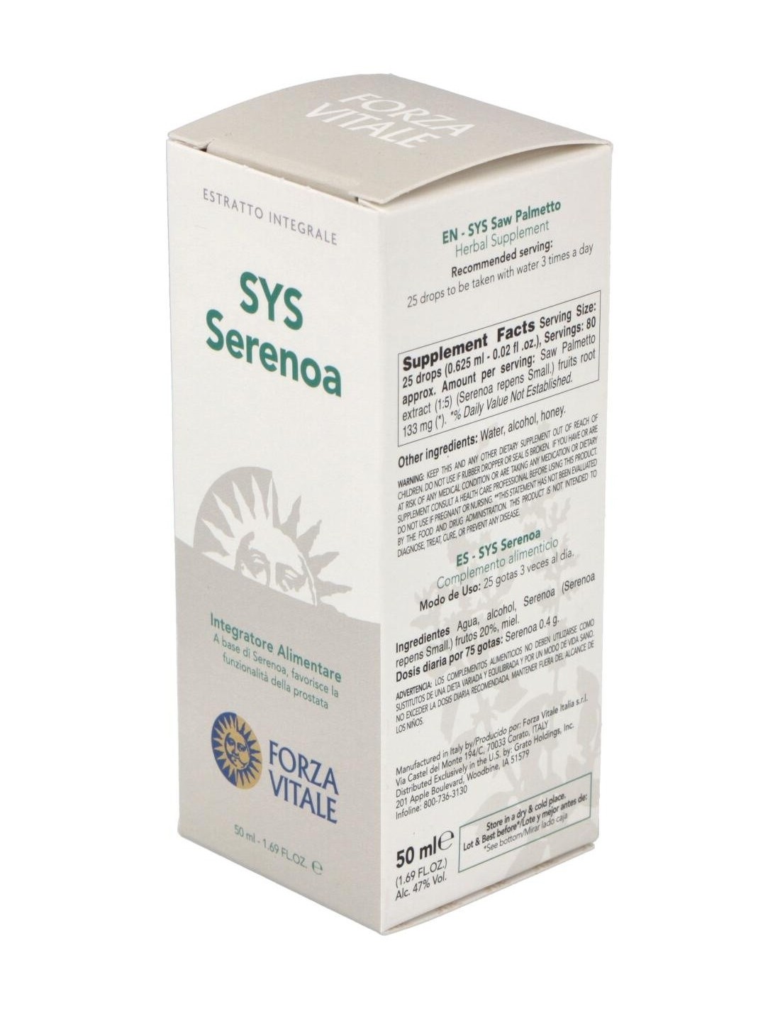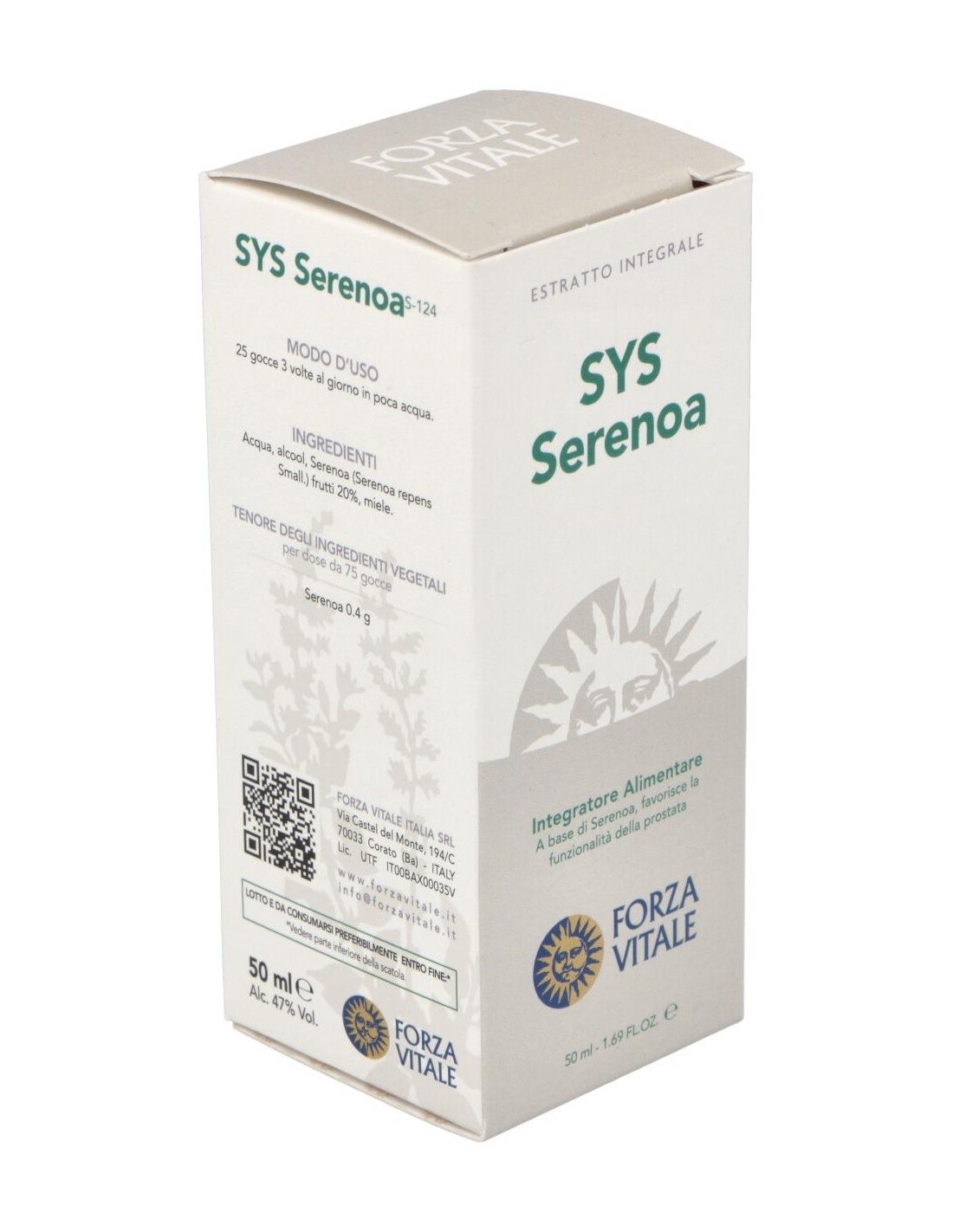 Los principales componentes de la Serenoa son los ácidos grasos libres con sus correspondientes esteros etílicos; los esteroles y los lípidos. Entre los ácidos grasos libres, encontramos los ácidos: oleico, láurico, mirística, palmítico, linoleico, cafóico, caprílico, palmitaleico, esteárico y linolénico. Los principales esteroles incluyen los a-sitosterol, el estigmasterol y el dancosterol. En las farmacopeas y en los sistemas de medicina tradicional, es utilizada como diurético y para tratamiento de la hipertrofia prostática. Estudios de farmacología experimental, han indicado actividad espasmolítica, antiinflamatoria, inmunoestimulantes. Los indios de Norteamérica producían desde los frutos, jugos fermentados que tomaban como bebidas afrodisíacas. Buenos resultados se obtendrán, alternándolo con Epilobio. Los tratamientos con frutos de serenoa, no producen efecto colateral alguno. Ingredientes:Agua, Alcohol, Serenoa (Serenoa repens) frutos 20%, miel. Ingredientes activos por dosis diaria (2 ml):0,4 gramos de serenoa. Modo de empleo:Adultos: Tomar 25 gotas 3 veces al día en poca agua o vía sublingual.Niños hasta 12 años: Tomar 10 gotas 3 veces al día en poca agua o en zumo de fruta. Presentación:Frasco de 50 ml.