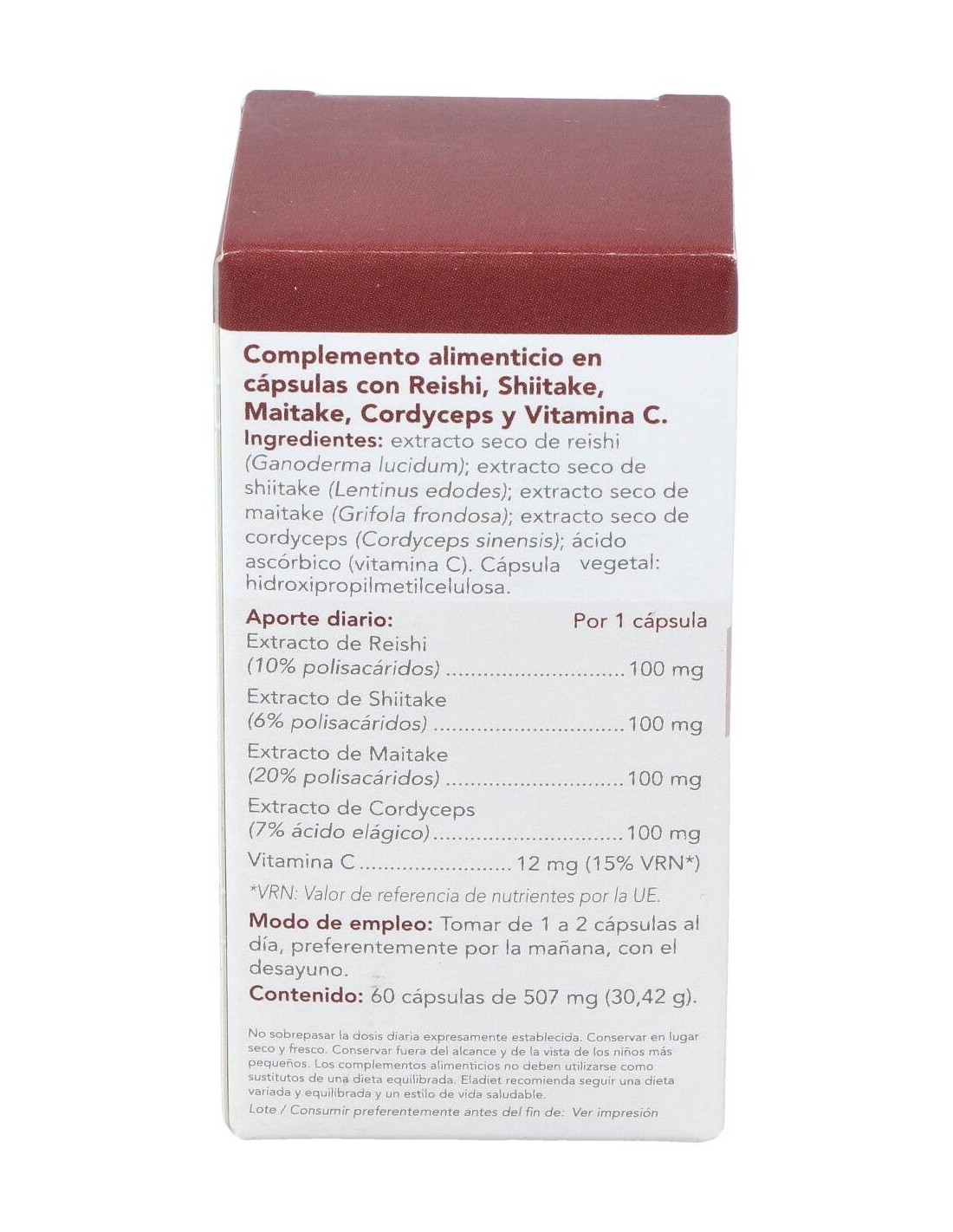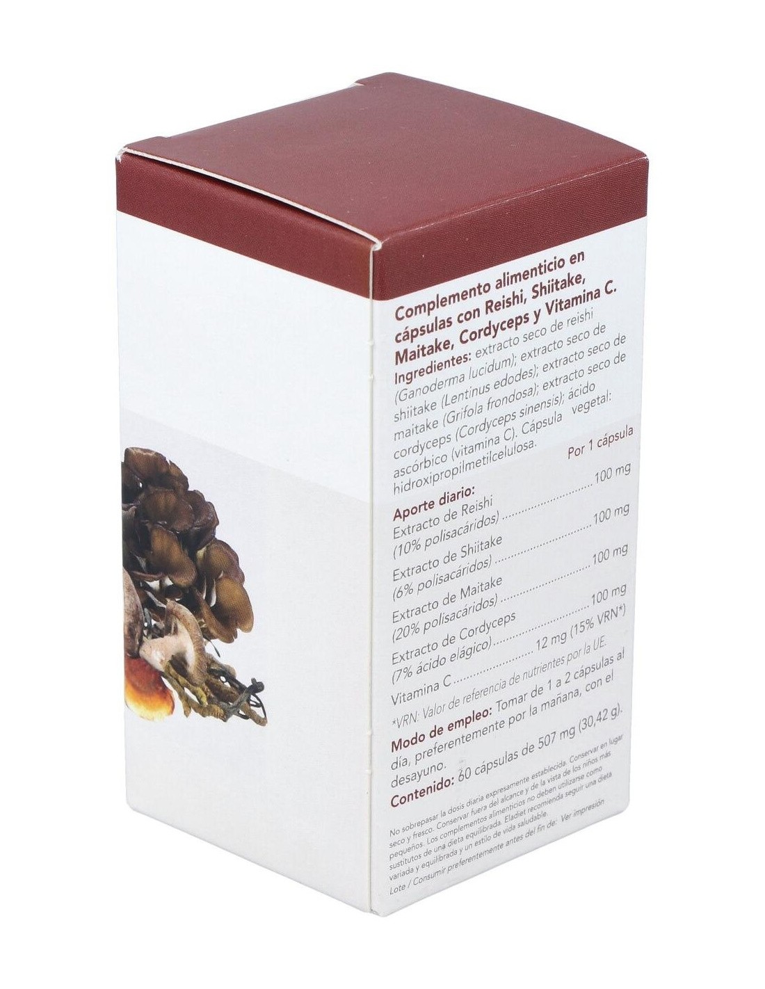 Este complemento regula el sistema inmunitario gracias a la sinergia de extractos puros de maitake, seishi, shiitake y cordyceps. La micoterapia tiene su origen en la medicina tradicional oriental y durante siglos la Medicina tradicional China ha recurrido a los hongos para el mantenimiento de la salud así como para el tratamiento de patologías. Los hongos destacan por su elevada concentración en compuestos bioactivos útiles para el organismo. Composición por dosis diaria recomendada (2 cápsulas):