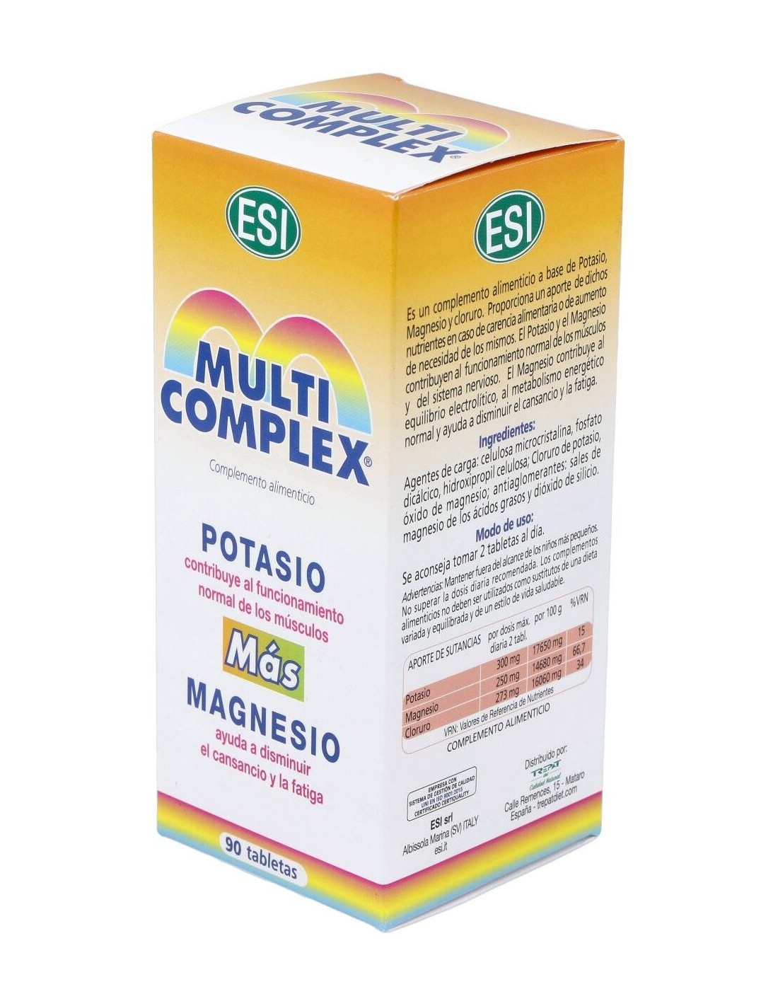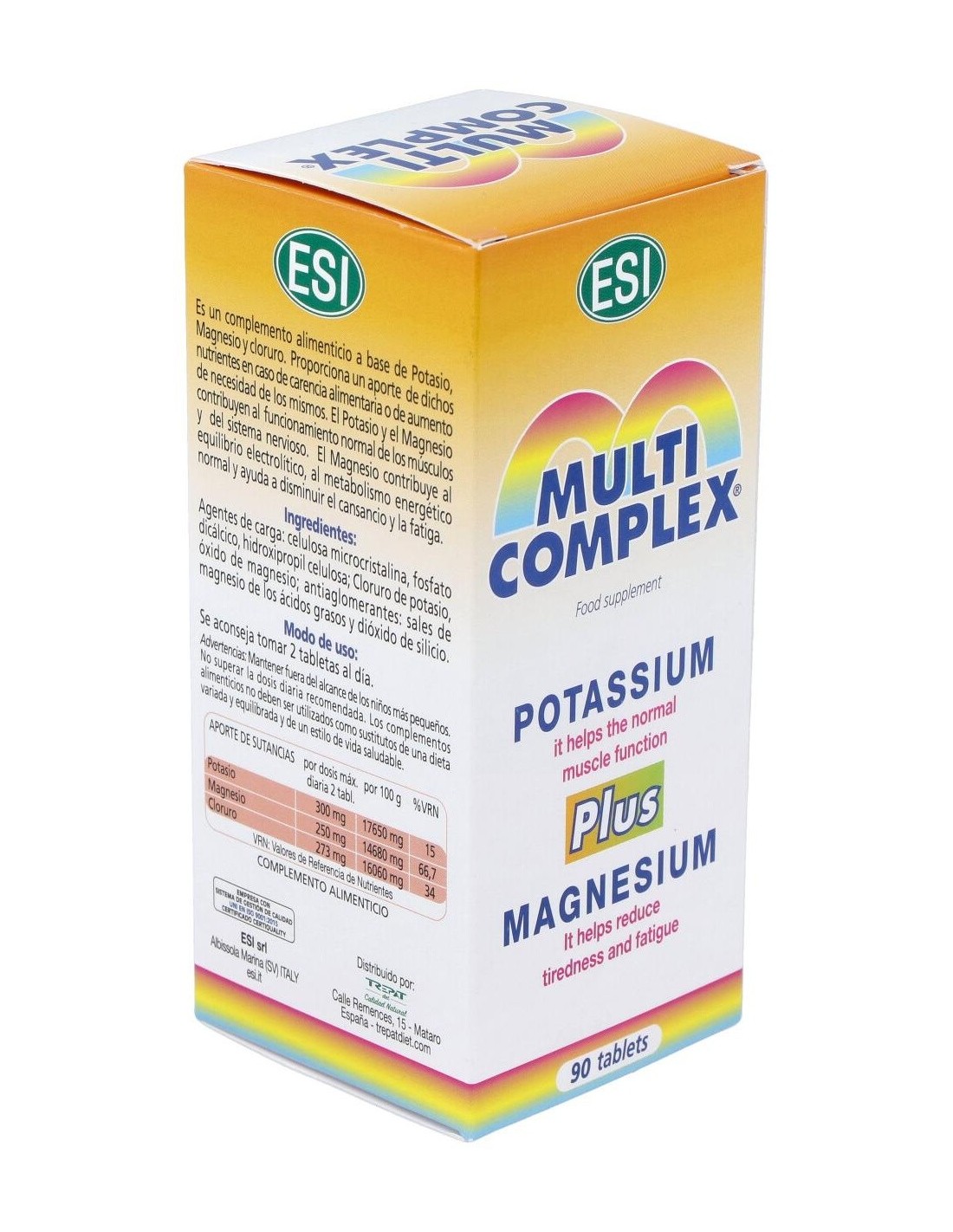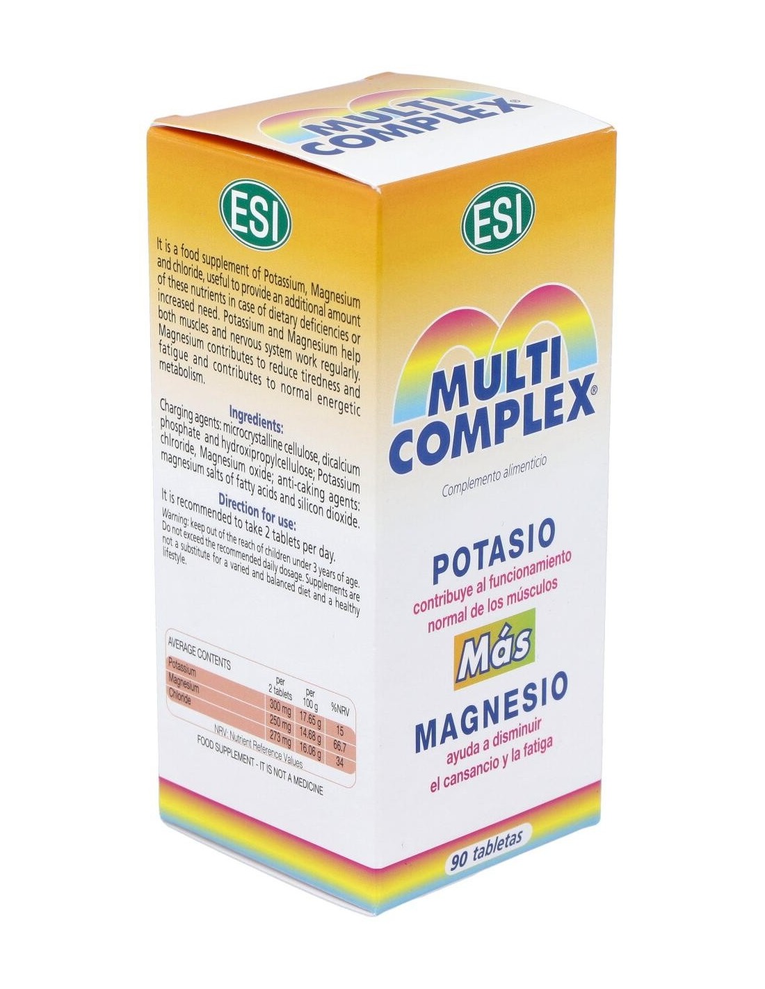 Multicomplex Potasio + Magnesio de ESI es un un complemento alimenticio a base de Potasio, Magnesio y cloruro, útil para aportar un suplemento de estos nutrientes en caso de carencias alimentarias o de aumento de las necesidades.El Potasio y el Magnesio contribuyen al funcionamiento normal del sistema muscular y del sistema nervioso. El Magnesio contribuye a reducir el cansancio y la fatiga y a normalizar el metabolismo energético.Las Vitaminas y los Sales Minerales son elementos muy importantes en nuestra dieta, imprescindibles para el correcto funcionamiento de muchos procesos orgánicos, como el metabolismo energético, la regeneración celular y el correcto funcionamiento del sistema inmunológico.Composición activa por 2 comprimidos: