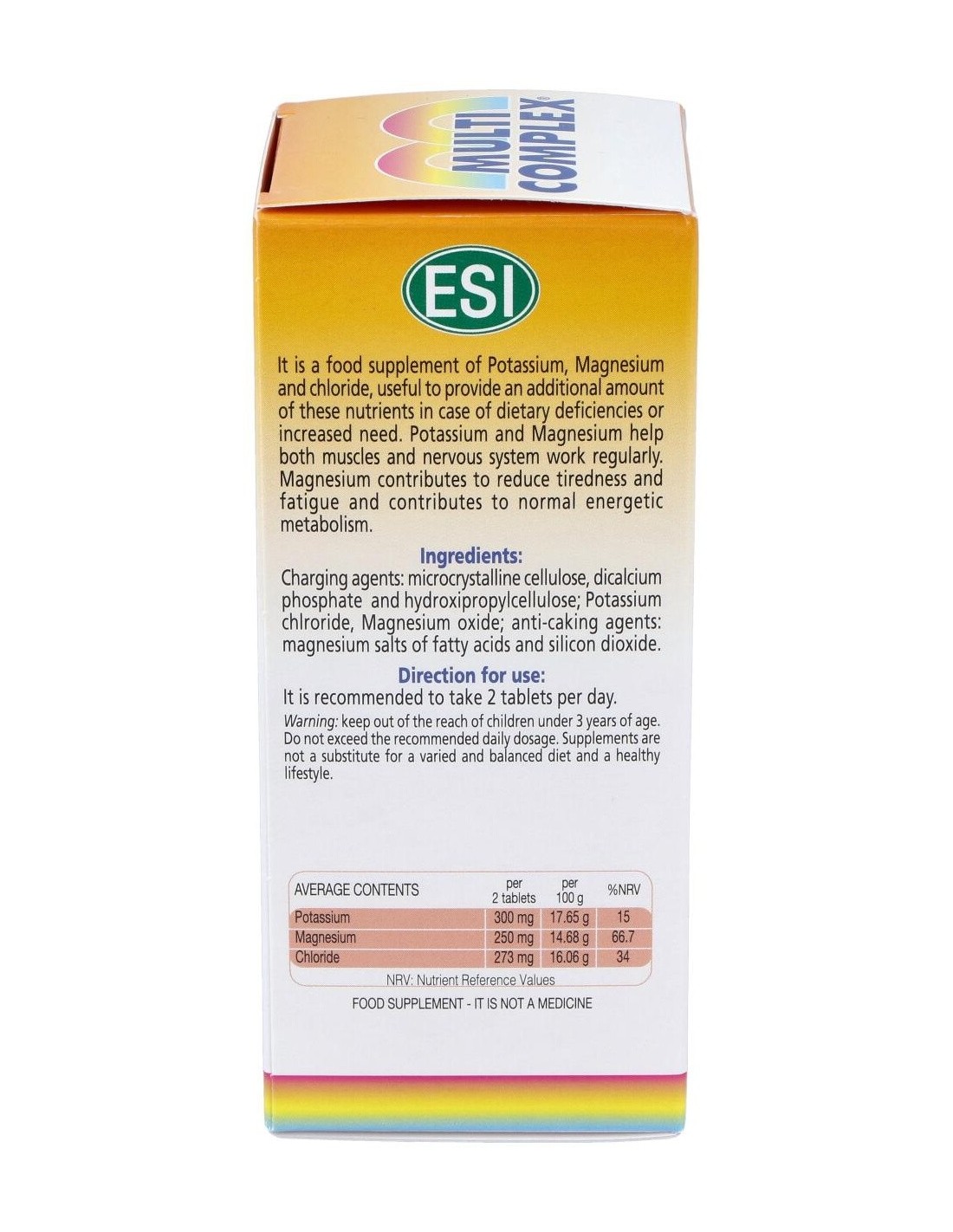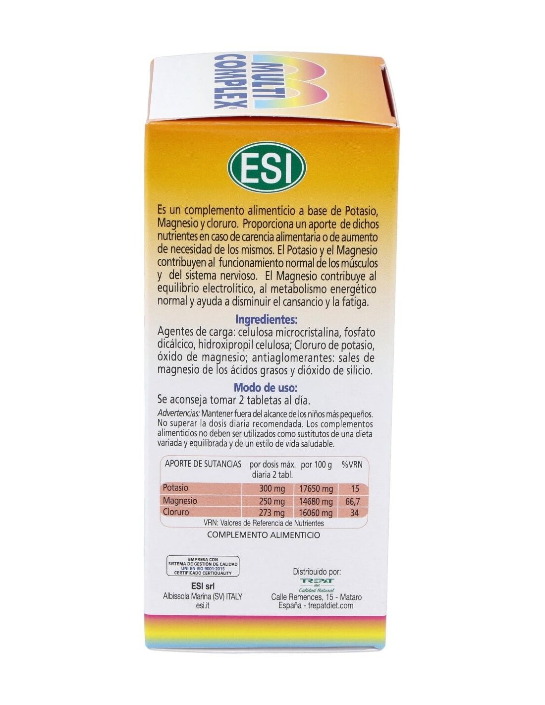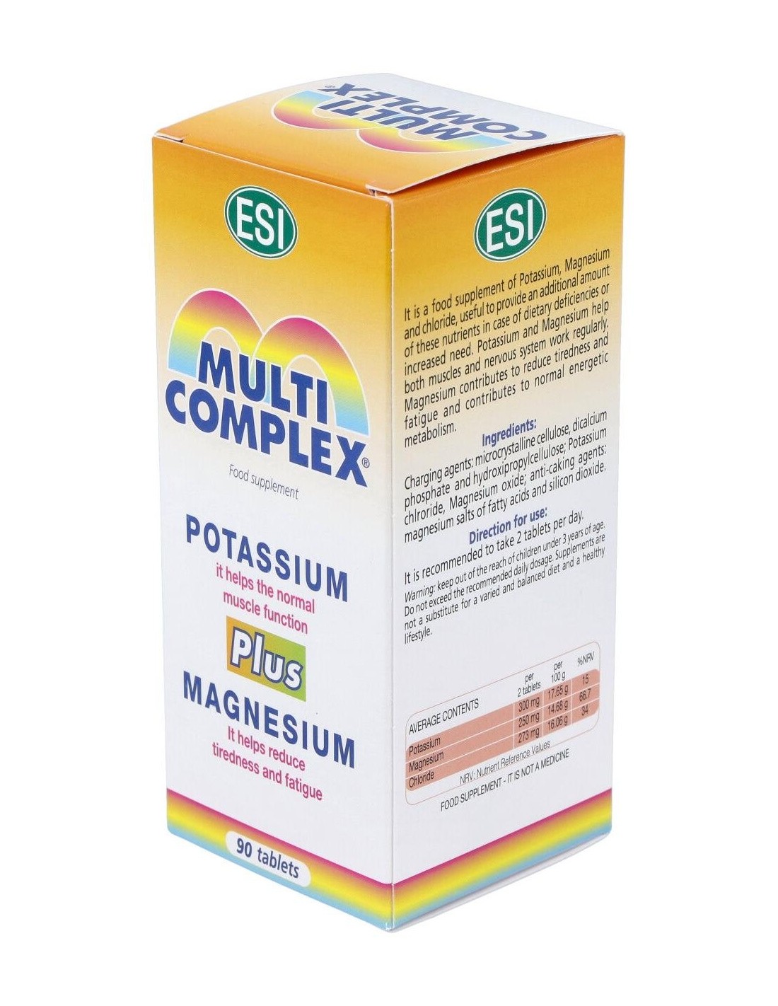 Multicomplex Potasio + Magnesio de ESI es un un complemento alimenticio a base de Potasio, Magnesio y cloruro, útil para aportar un suplemento de estos nutrientes en caso de carencias alimentarias o de aumento de las necesidades.El Potasio y el Magnesio contribuyen al funcionamiento normal del sistema muscular y del sistema nervioso. El Magnesio contribuye a reducir el cansancio y la fatiga y a normalizar el metabolismo energético.Las Vitaminas y los Sales Minerales son elementos muy importantes en nuestra dieta, imprescindibles para el correcto funcionamiento de muchos procesos orgánicos, como el metabolismo energético, la regeneración celular y el correcto funcionamiento del sistema inmunológico.Composición activa por 2 comprimidos: