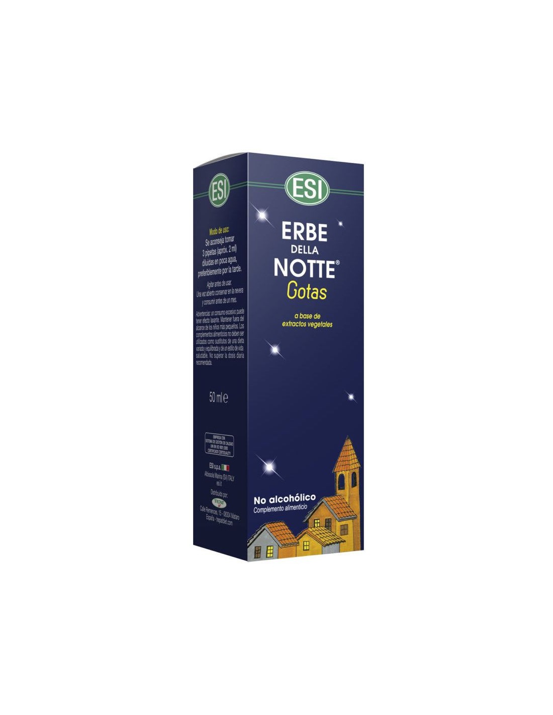 Erbe Della Notte Gotas de ESI es un complemento alimenticio a base de principios vegetales como la Escolcia, la Pasiflora, la Manzanilla, el Tilo o la Valeriana, útiles para favorecer la relajación mental y el sueño.El Espino y la Pasiflora favorecen la relajación y el bienestar mental; la Escolcia, la Valeriana y la Pasiflora son útiles en caso de estrés, para promover la relajación y el sueño.Composición activa por 2 ml: