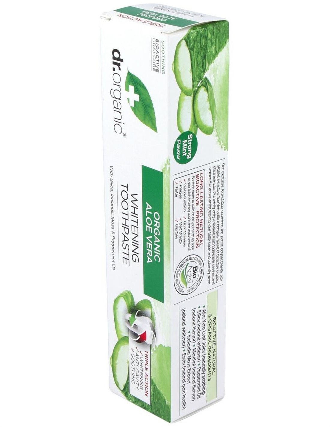Esta pasta de dientes de triple acción, está formulada con Aloe Vera orgánica, sílice, musgo islandés, castaño de Indias y árbol de té. Gracias a sus propiedades calmantes, blanqueadoras y anti-bacterianas, el cepillado regular con este dentífrico ayuda a calmar y restaurar las encías, protege de las bacterias, una de las principales causas de la placa y el sarro.
