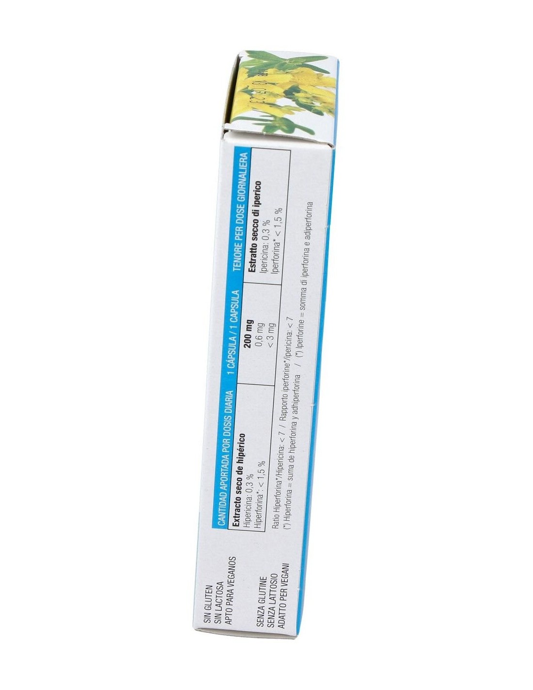 200 mg de extracto seco de hiperico al 0,3% en hipericina (0,6 mg de hipericina, < 3 mg de Hiperforina, ratio hiperforina/Hipericina < 7. suma de (Hiperforina = hiperforina + adhiperforina)