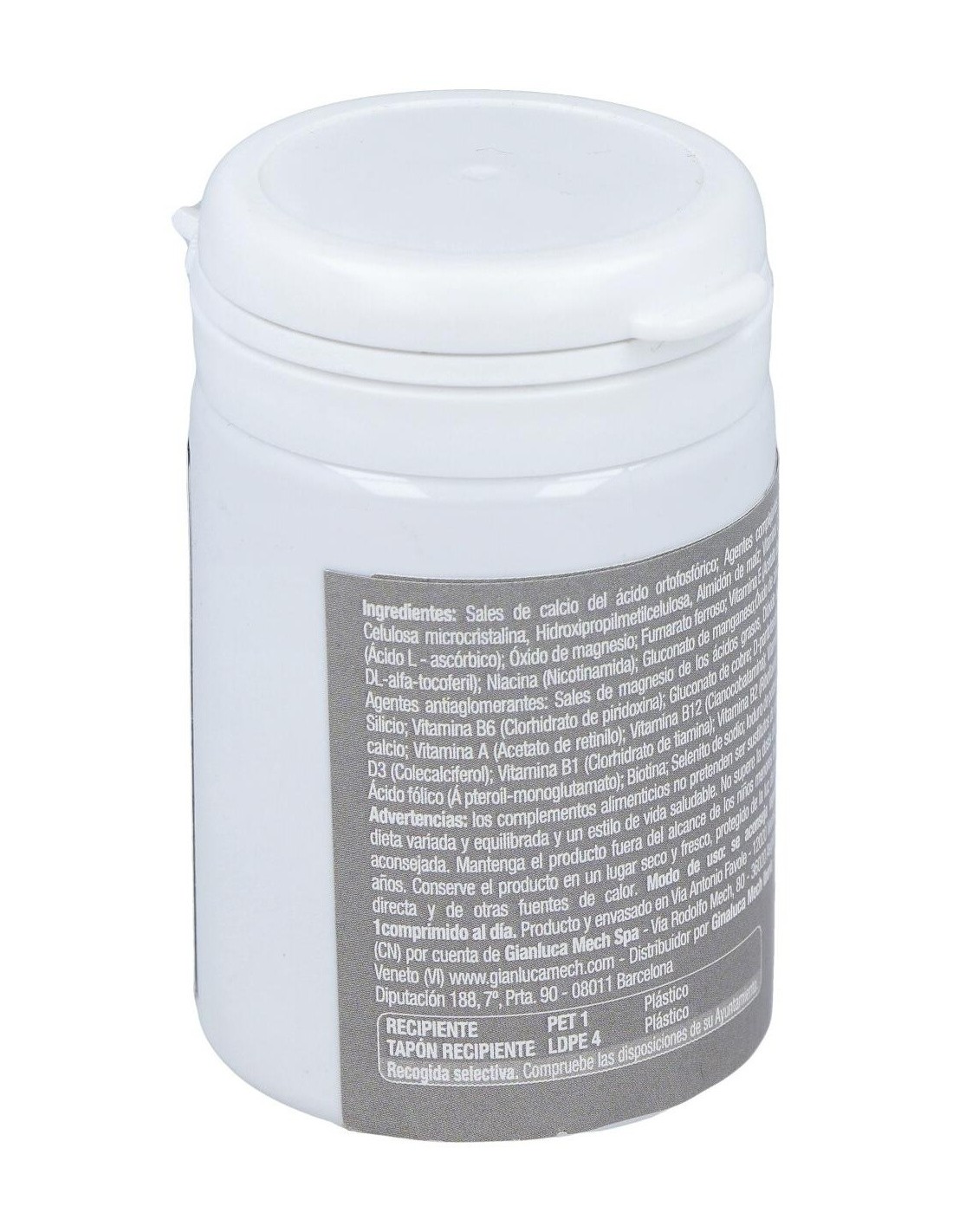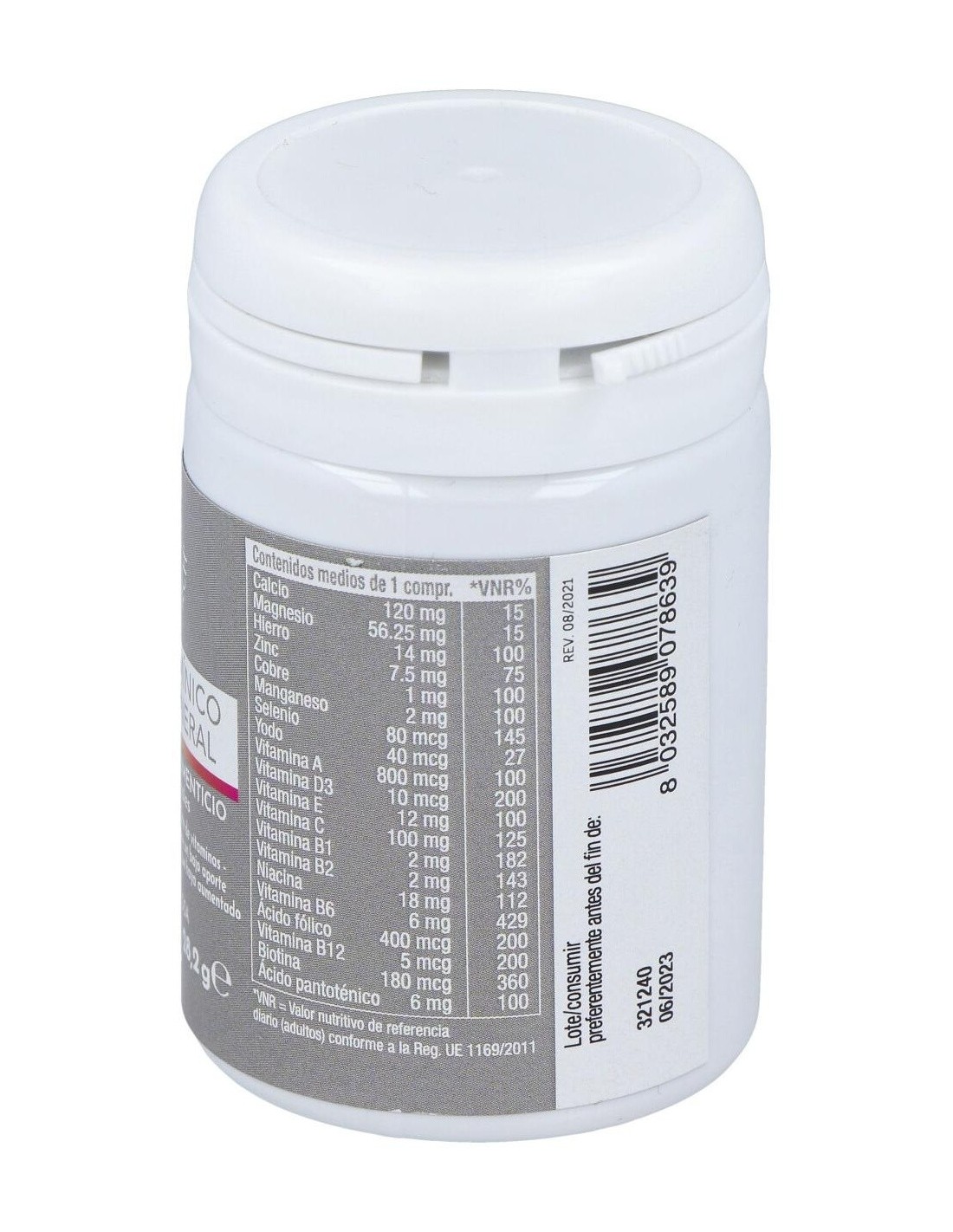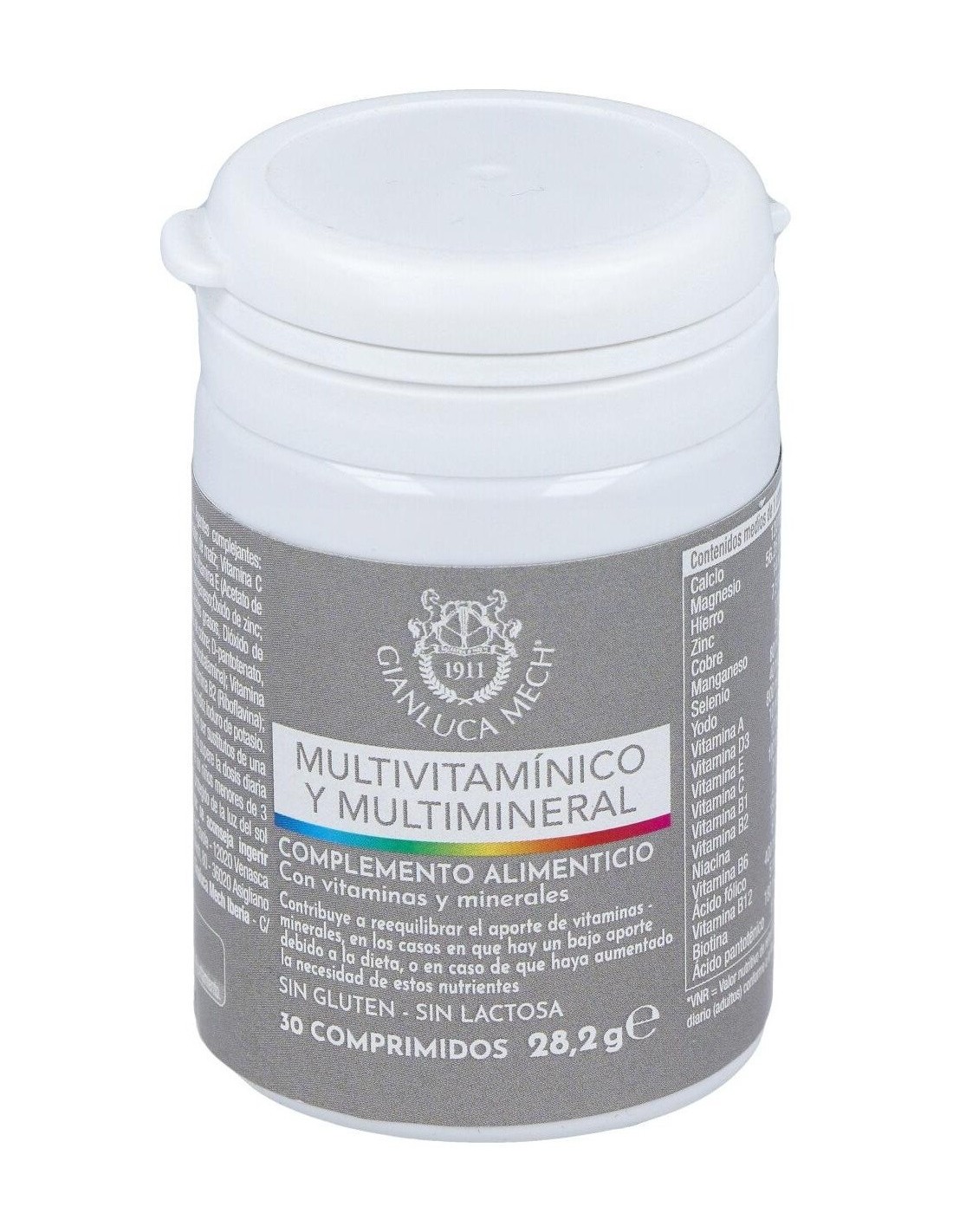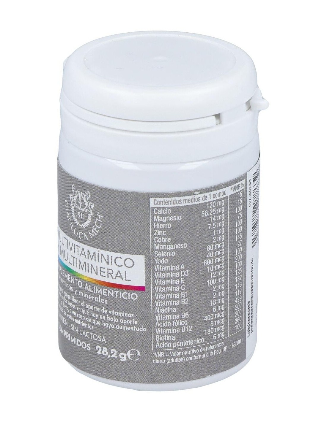 Ingredientes:Sales de calcio de ácido ortofosfórico; Agentes de carga: Celulosa microcristalina, Hidroxipropilcelulosa, Almidón de maíz; Vitamina C (Ácido L - ascórbico); Óxido de magnesio; fumarato de hierro; vitamina E (acetato de tocoferilo DL-alfa); niacina (nicotinamida); gluconato de manganeso; Óxido de zinc; Antiaglomerantes: Sales magnésicas de ácidos grasos, Dióxido de Silicio; vitamina B6 (clorhidrato de piridoxina); gluconato de cobre; D-pantotenato; calcio ; vitamina A (acetato de retinilo); vitamina B12 (cianocobalamina); vitamina D3 (colecalciferol); vitamina B1 (clorhidrato de tiamina); vitamina B2 (Riboflavina); ácido fólico (ácido pteroil-monoglutámico); biotina; de selenito sodio; Yoduro de potasio.Modo de empleo:Se aconseja ingerir 1 comprimido masticable al día.Presentación:Envase de 30 comprimidos.Recomendaciones y advertencias:No contiene gluten ni lactosa.