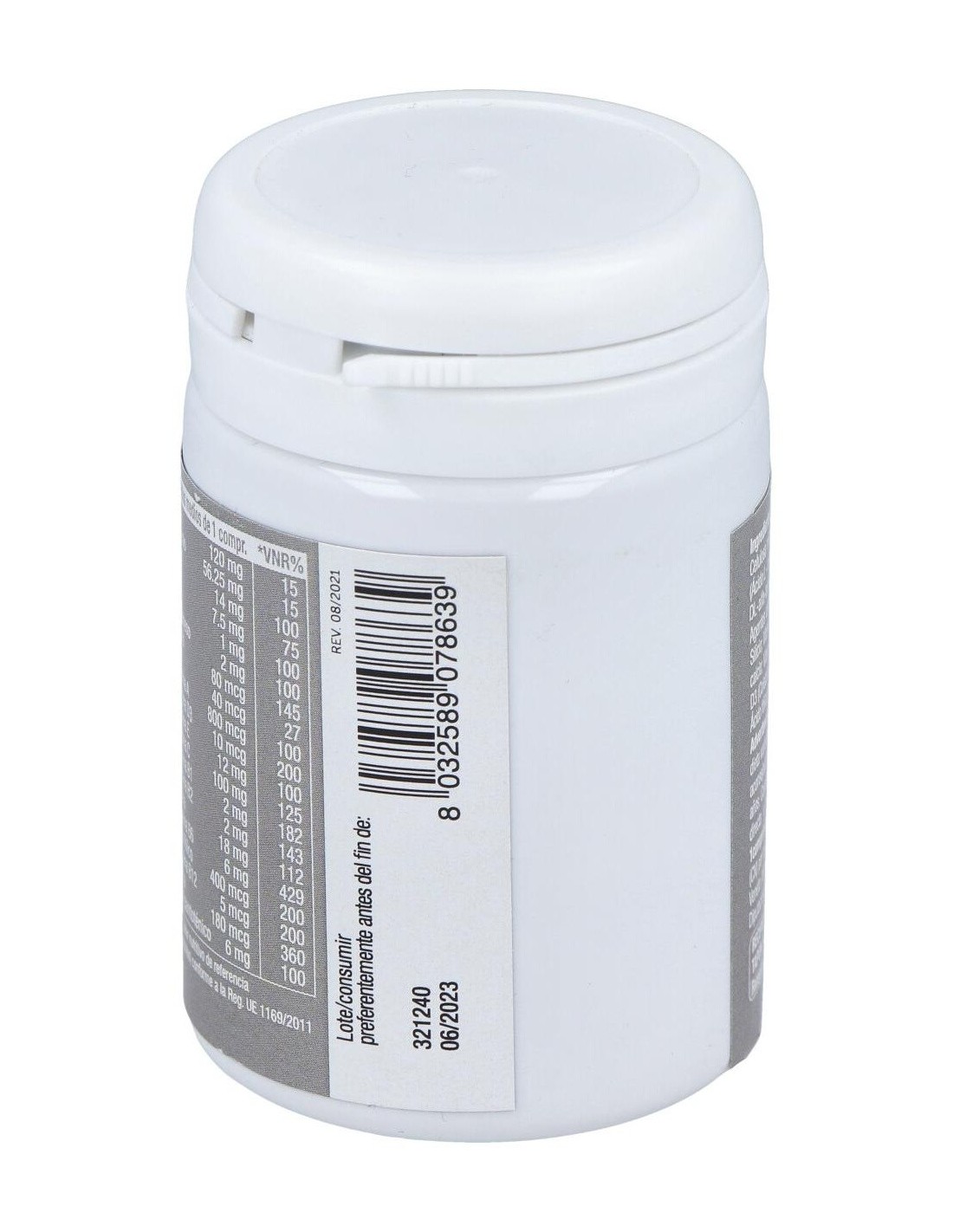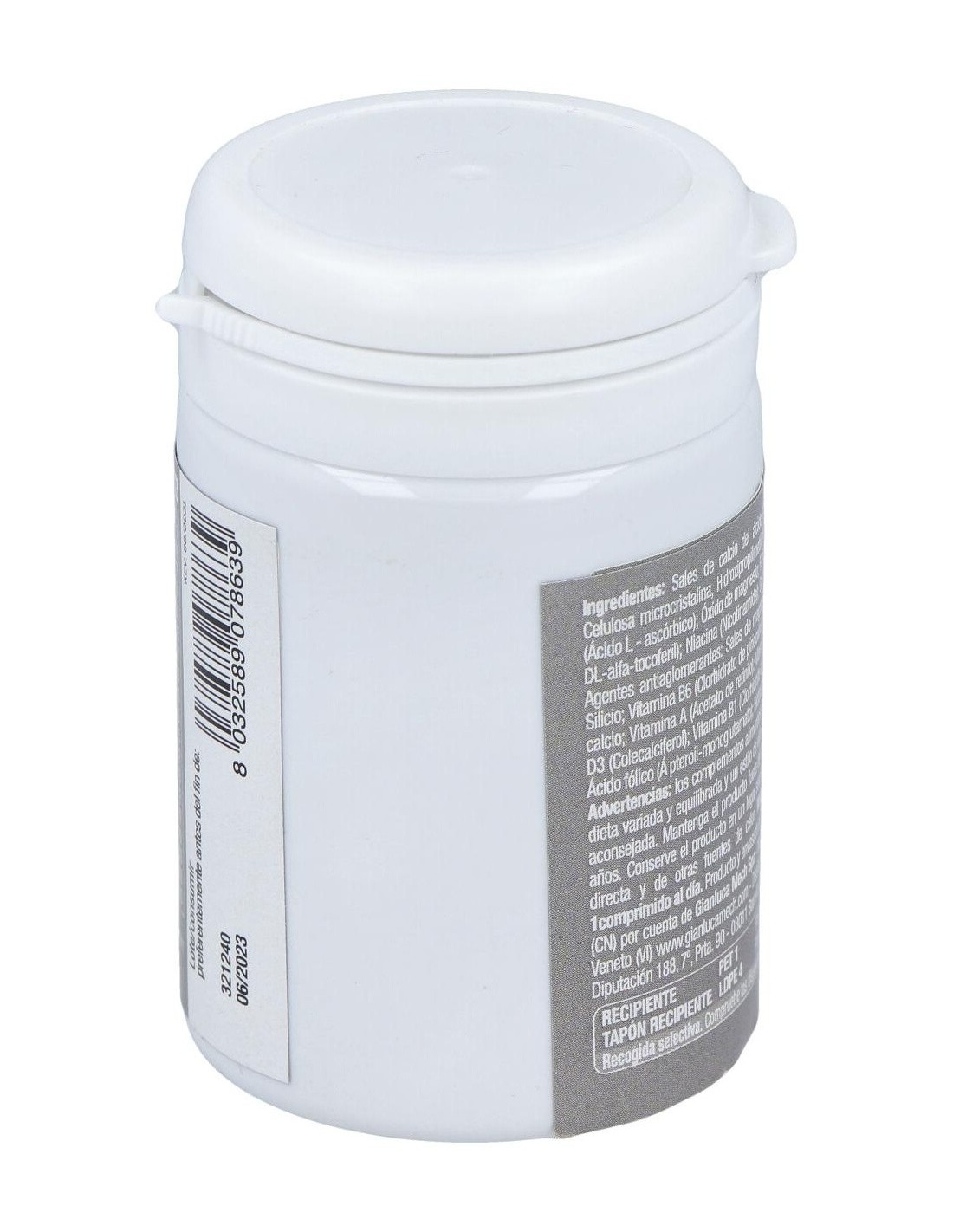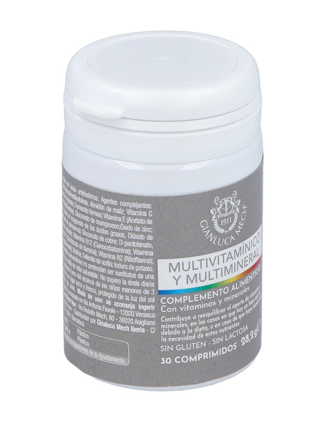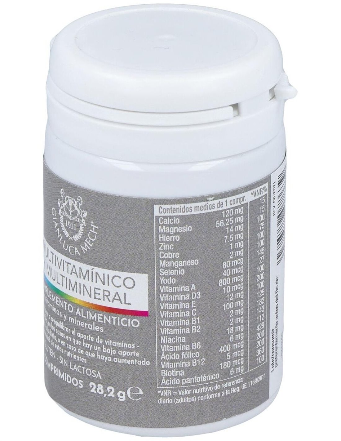 Ingredientes:Sales de calcio de ácido ortofosfórico; Agentes de carga: Celulosa microcristalina, Hidroxipropilcelulosa, Almidón de maíz; Vitamina C (Ácido L - ascórbico); Óxido de magnesio; fumarato de hierro; vitamina E (acetato de tocoferilo DL-alfa); niacina (nicotinamida); gluconato de manganeso; Óxido de zinc; Antiaglomerantes: Sales magnésicas de ácidos grasos, Dióxido de Silicio; vitamina B6 (clorhidrato de piridoxina); gluconato de cobre; D-pantotenato; calcio ; vitamina A (acetato de retinilo); vitamina B12 (cianocobalamina); vitamina D3 (colecalciferol); vitamina B1 (clorhidrato de tiamina); vitamina B2 (Riboflavina); ácido fólico (ácido pteroil-monoglutámico); biotina; de selenito sodio; Yoduro de potasio.Modo de empleo:Se aconseja ingerir 1 comprimido masticable al día.Presentación:Envase de 30 comprimidos.Recomendaciones y advertencias:No contiene gluten ni lactosa.