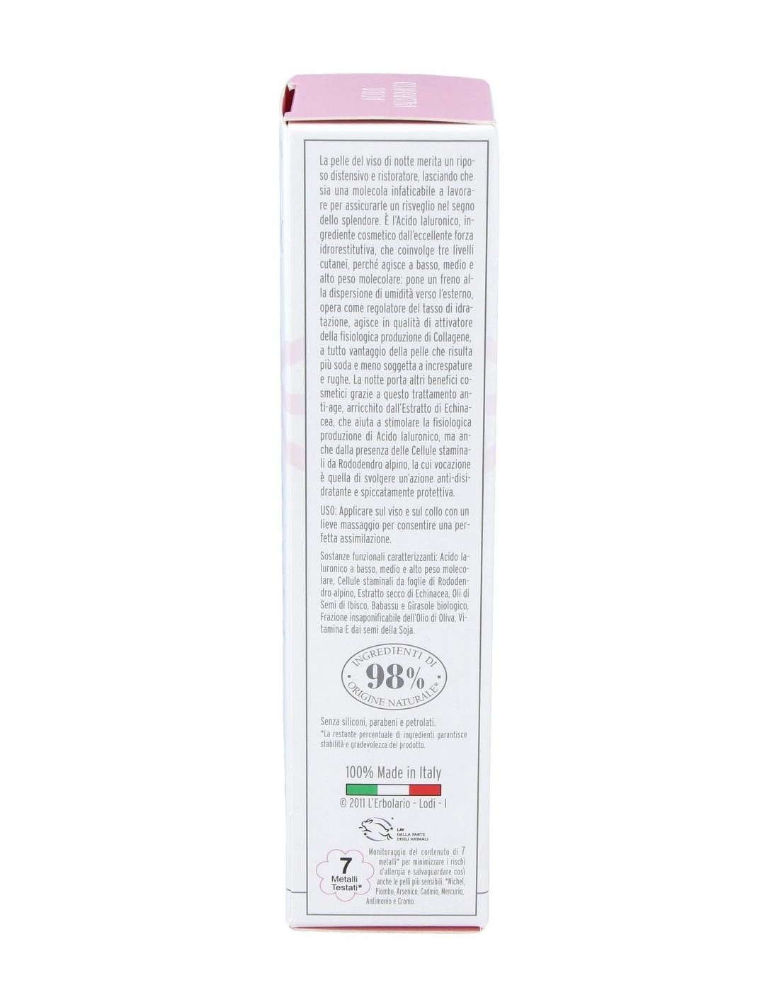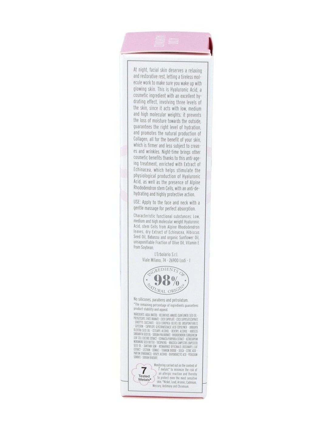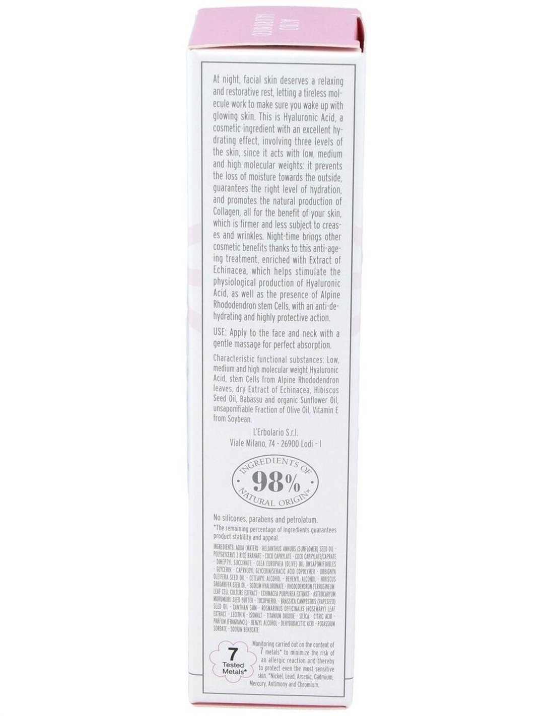 Ácido hialurônico de baixo, médio e alto peso molecular, células-tronco de folhas de rododendro alpino, extrato seco de equinácea, óleo de semente de hibisco, óleo de babaçu, óleo de girassol orgânico, fração insaponificável de azeite, vitamina E de soja. insaponificáveis de óleo europaea (azeitona), glicerina, copolímero de capriloil glicerina / ácido sebácico, óleo de semente de Orbignya oleifera, álcool cetearílico, álcool behenílico, óleo de semente de Hibiscus sabdariffa, hialuronato de sódio, extrato de cultura de células de folhas de Rhododendron ferrugineum, extrato de Echinacea purpurea, manteiga de semente de Astrocaryum murumuru, tocoferol, Brassica campestris Óleo de semente (colza), />Distribuir no rosto e pescoço após a limpeza noturna. Uma leve massagem é suficiente para uma perfeita assimilação.
