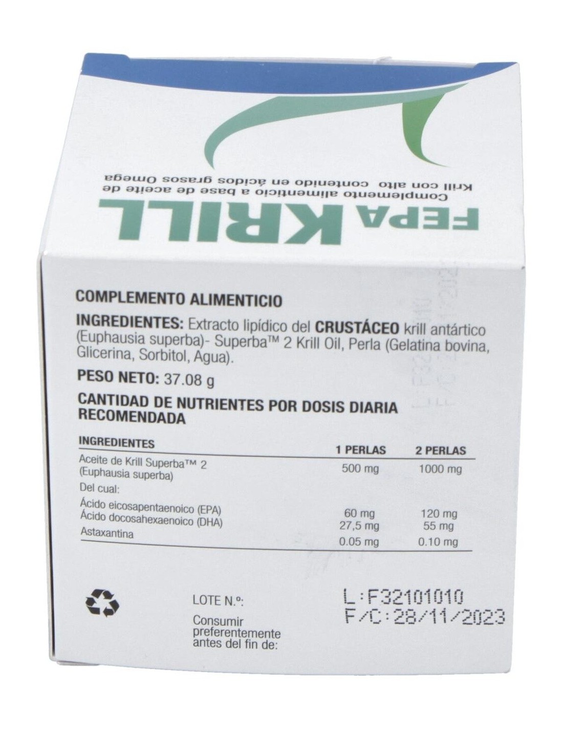 110 mg. de Omega 3. EPA 60 mg, DHA 27,5 mg, 15 mg de Omega 6, Astaxantina 0,05 mg.