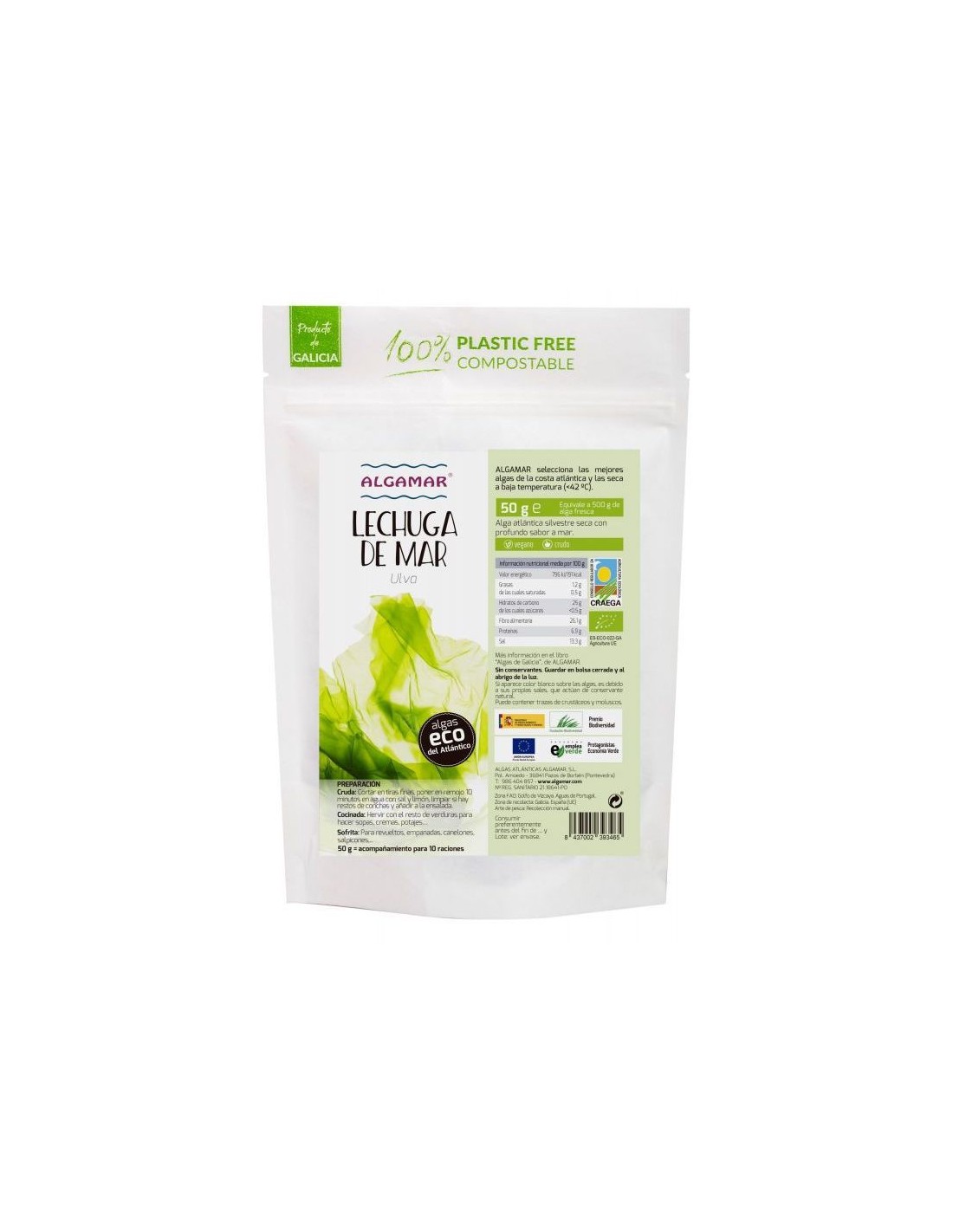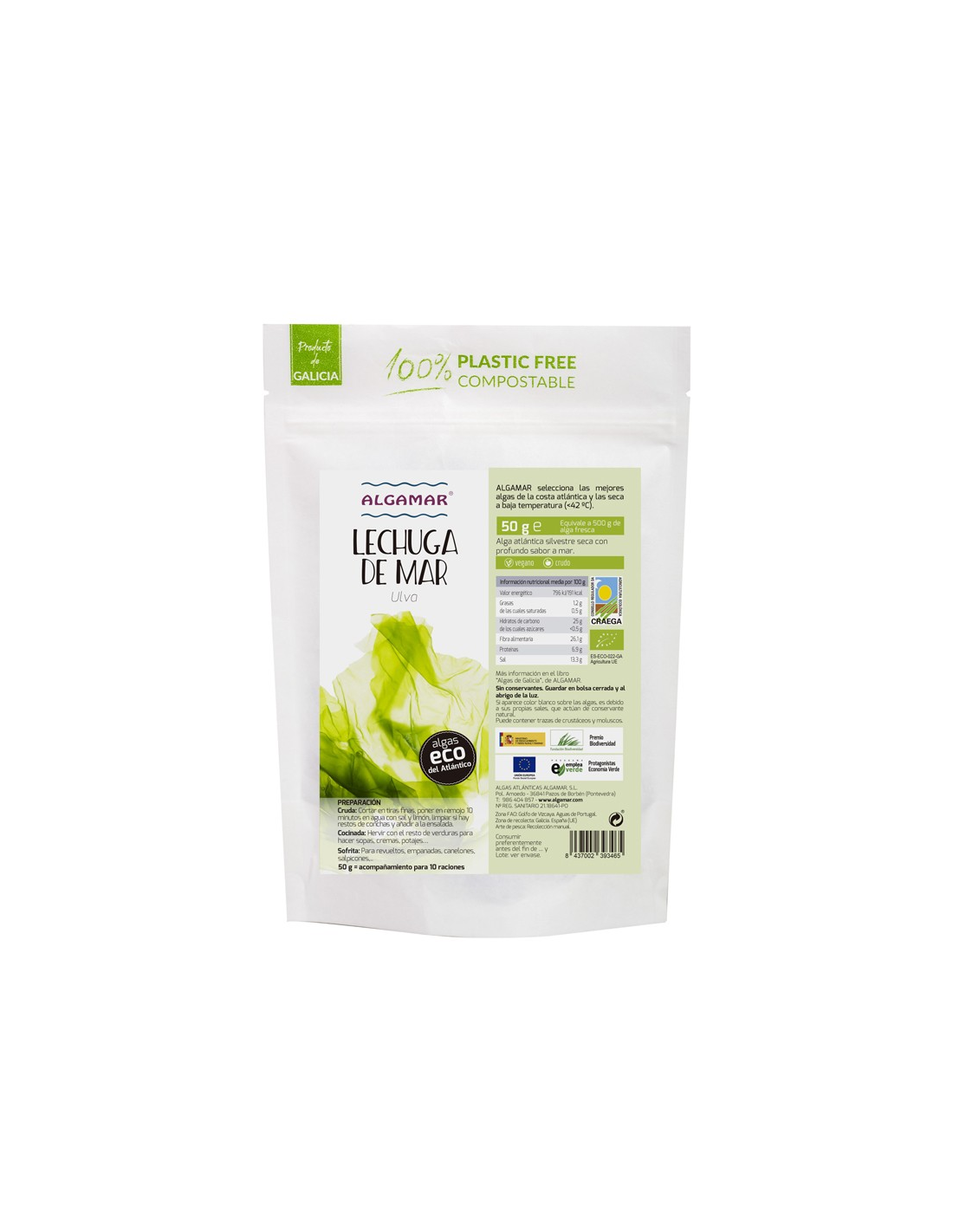 Ingredientes:Alga atlántica silvestre seca con profundo sabor a mar.Valor nutricional por 100 gramos: