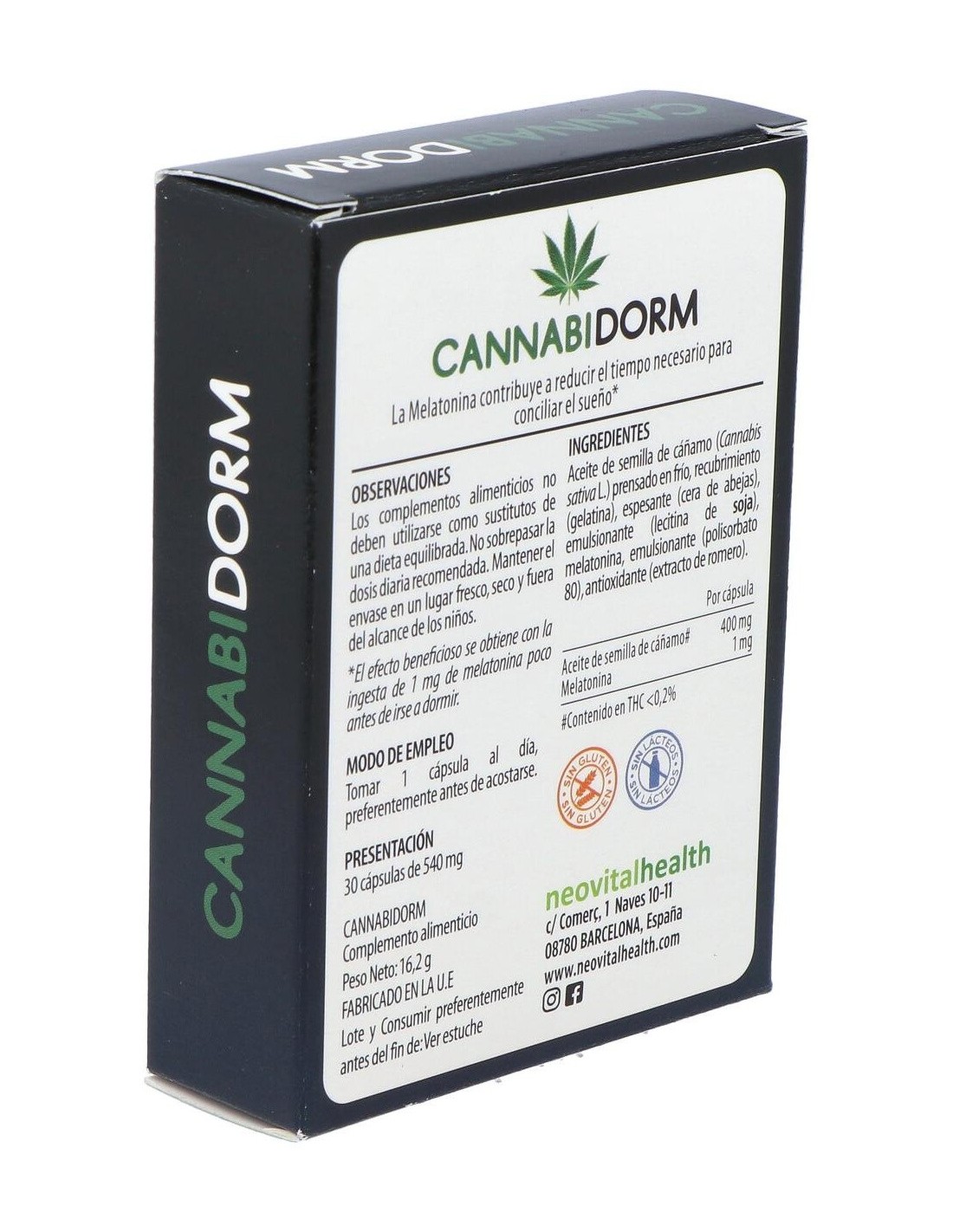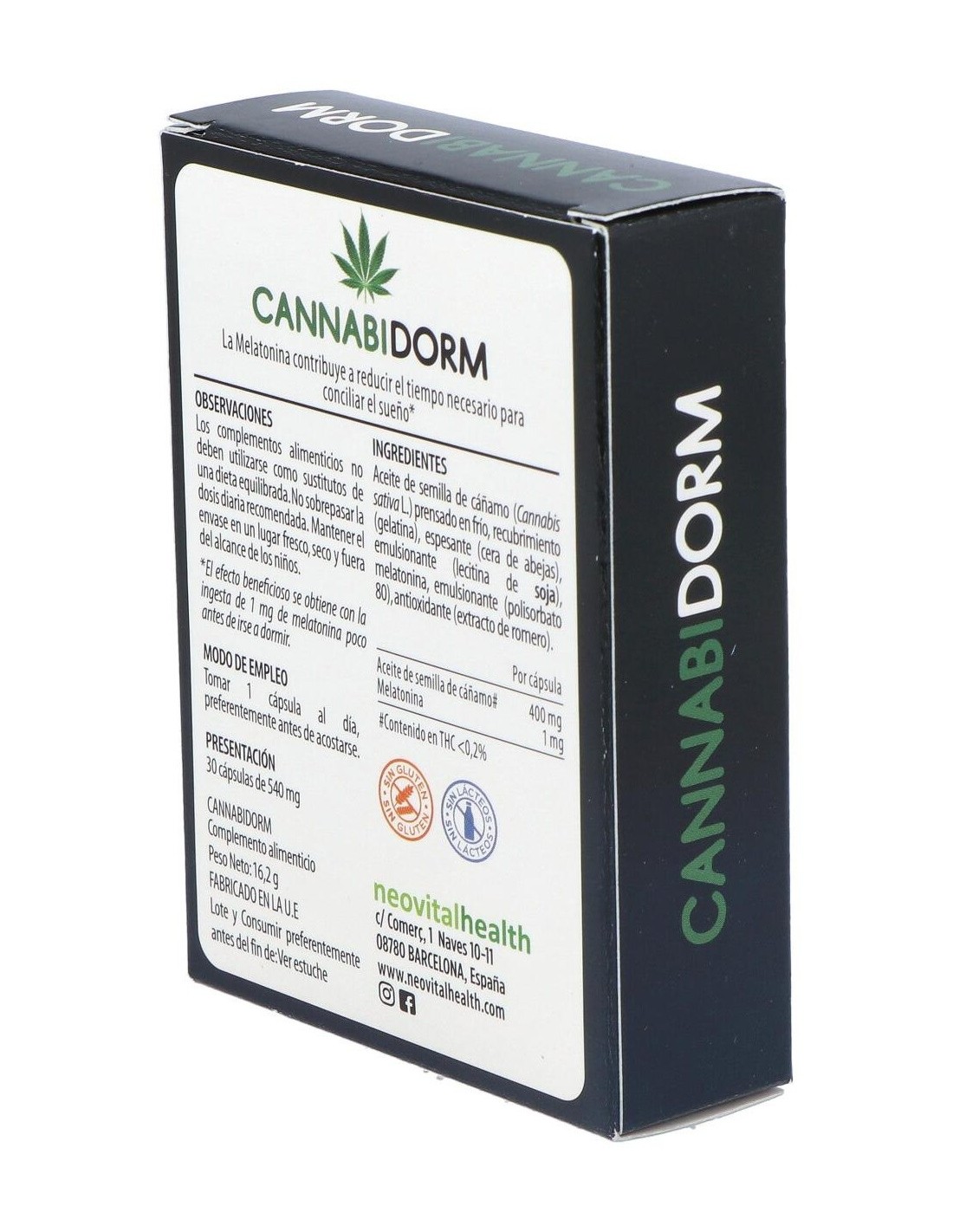 Aceite de semilla de cáñamo (Cannabis sativa L.) prensado en frío*, gelatina, cera de abejas, lecitina de soja, melatonina, polisorbato 80, extracto de romero.