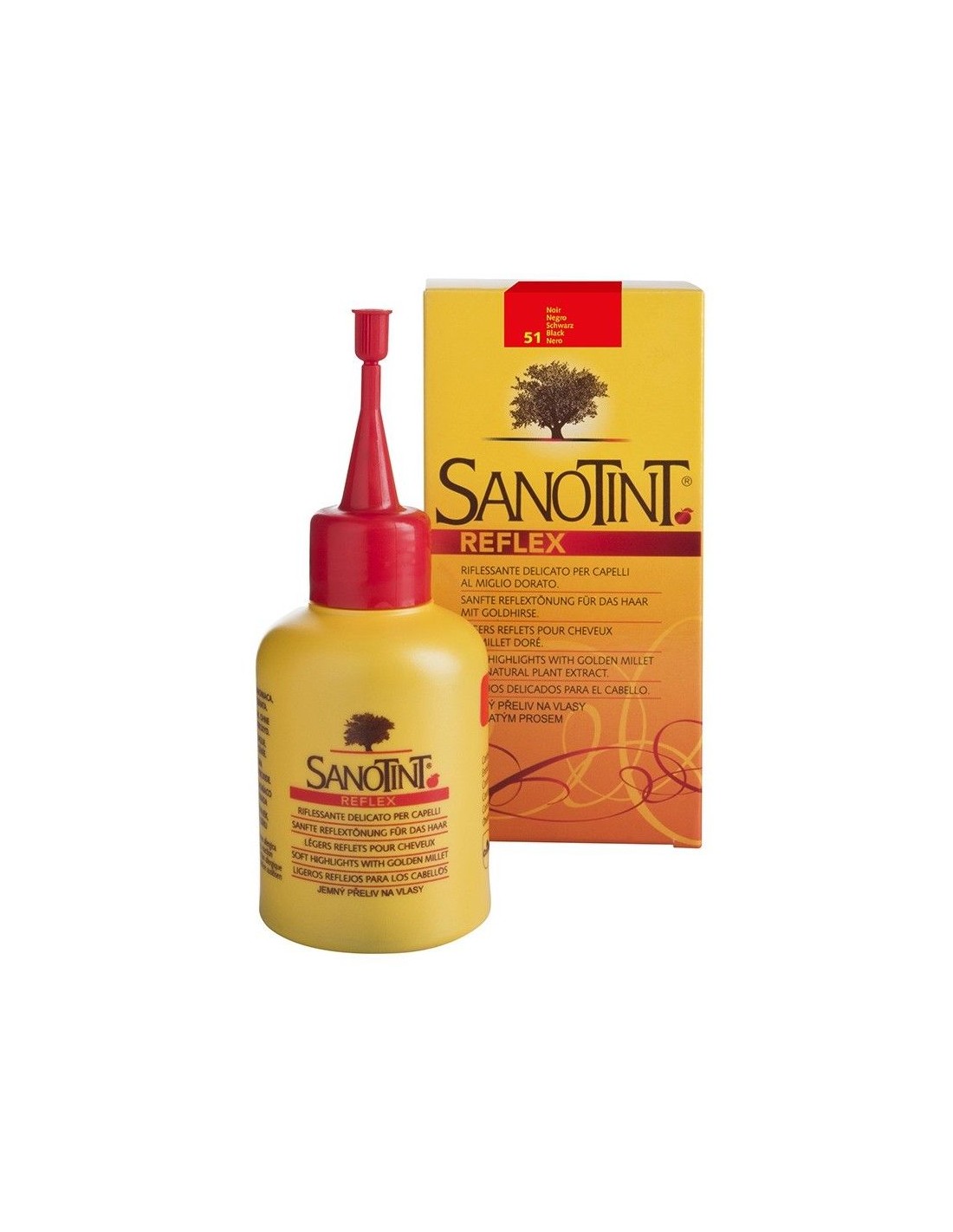 Sanotint Reflex es un producto a base de plantas con extractos de manzanilla, quino, hojas de olivo y mijo dorado que interactúan entre sí y dan reflejos brillantes y vivos al cabello creando diferentes tonos desde el negro hasta el rojo intenso cálido. Al no ser un tinte, los pigmentos del reflejo no penetran en el cabello, sino que solo recubren la parte externa del mismo, por lo que el color se elimina gradualmente en 5 a 6 lavados.Sanotint Reflex cubre delicadamente el cabello blanco, pero no de manera permanentemente como un tinte. Sanotint Reflex está listo para usar. No es necesario mezclar los componentes antes de la aplicación.Ingredientes (INCI):Extractos vegetales de camomila, mijo dorado, hoja de olivo (aguamarina, metoxiisopropanol, cocamidopropil betaína, hidroxietilcelulosa, parfum, laurdimonio, hidroxipropilo, proteína de trigo hidrolizada, poliquaternium-22, propilenglicol, hidróxido de sodio, extracto de acetato de pantóxido, pantóxido de pantopropileno, extracto de acetato de pantóxido de pantodio, extractor de sodio, extracto de acetato de pacóxido de sodio, extracto de pantoruro de sodio y ácido clorhídrico. Extracto de hoja de Olea europaea, extracto de Cinchona, extracto de Chamomilla recutita, butilparabeno, etilparabeno, propilparabeno, metilparabeno, fenoxietanol, ácido sórbico, caprilil glicol, linalool).Modo de empleo:Seguir atentamente las instrucciones que encontrará en el interior.Presentación:El envase contiene: