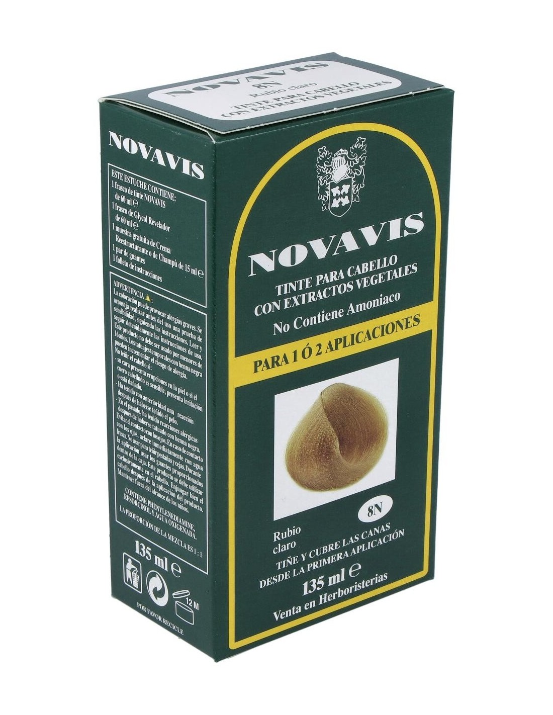 Tinte para cabello con extractos vegetales libre de amoníaco. Tiñe y cubre las canas desde la primera aplicación. Contiene: 1 frasco de tinte 60 ml, 1 frasco de Glycol Revelador 60 ml, 1 muestra gratuita de Crema Reestructurante o de Champú de 15 ml, 1 par de guantes y 1 folleto de instrucciones.