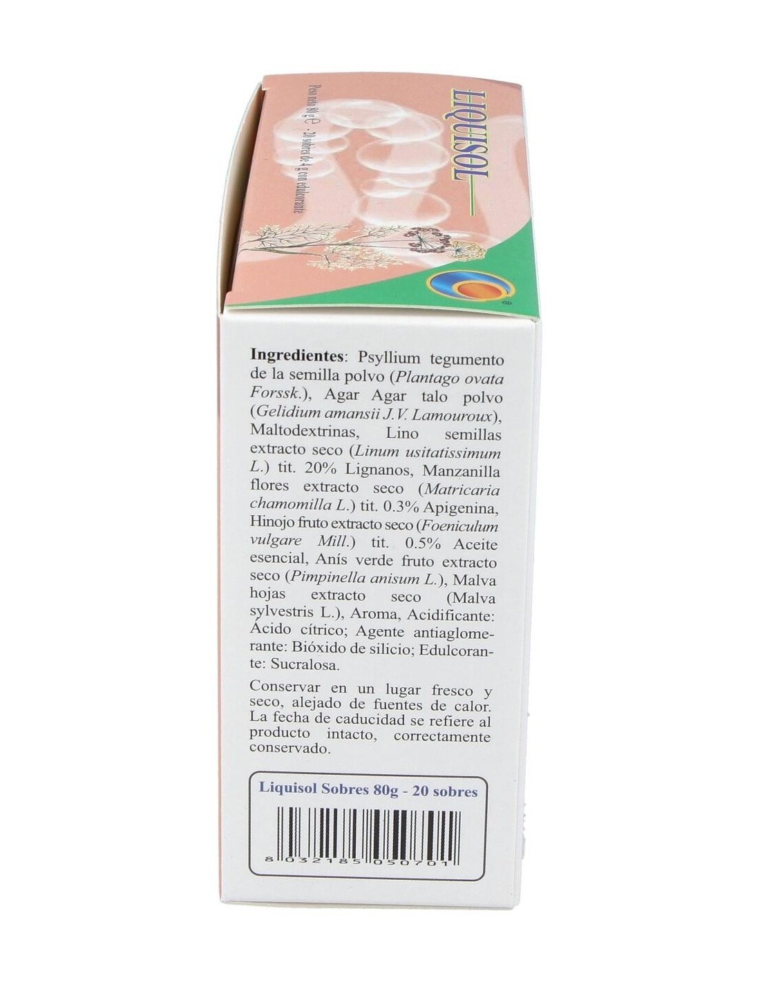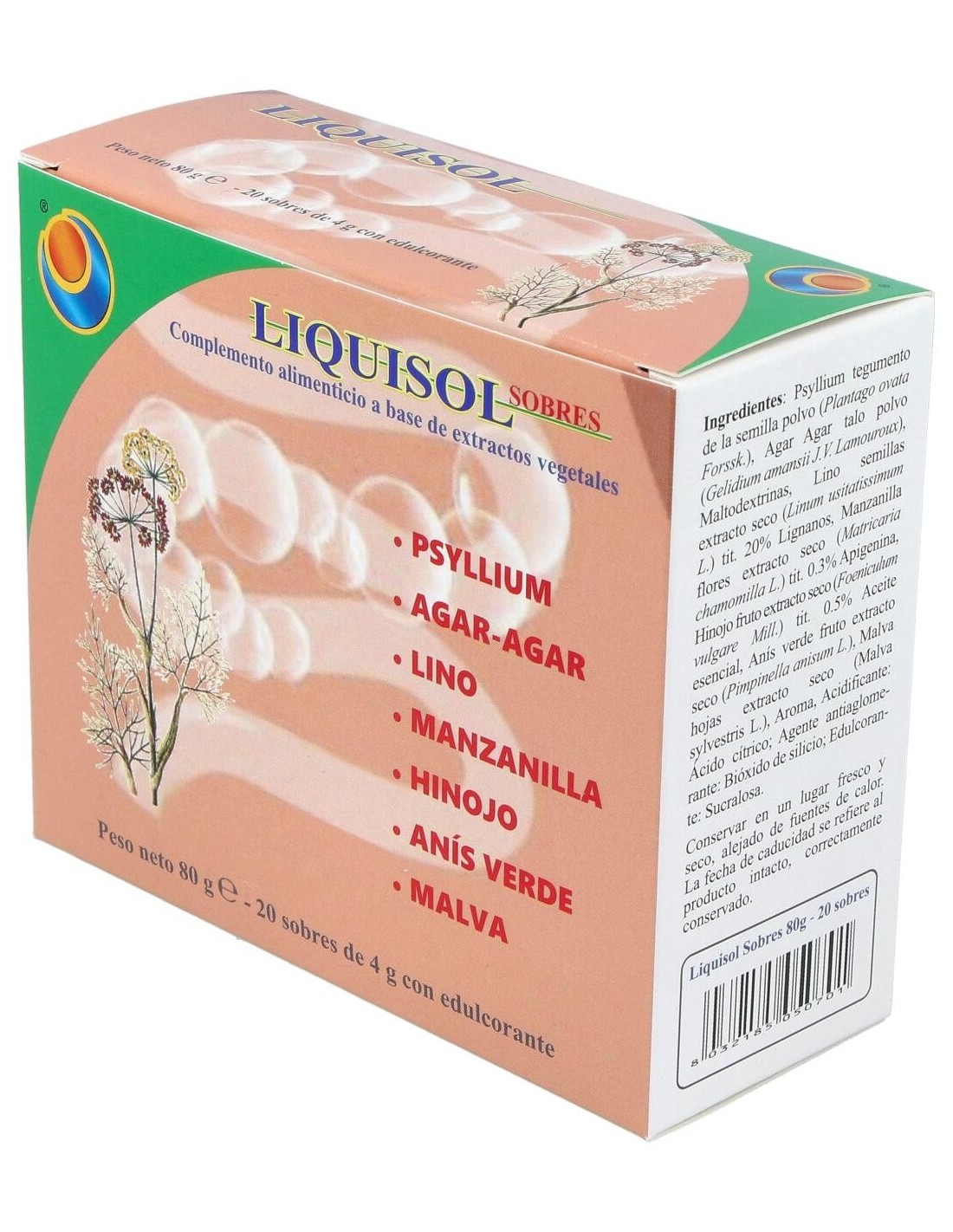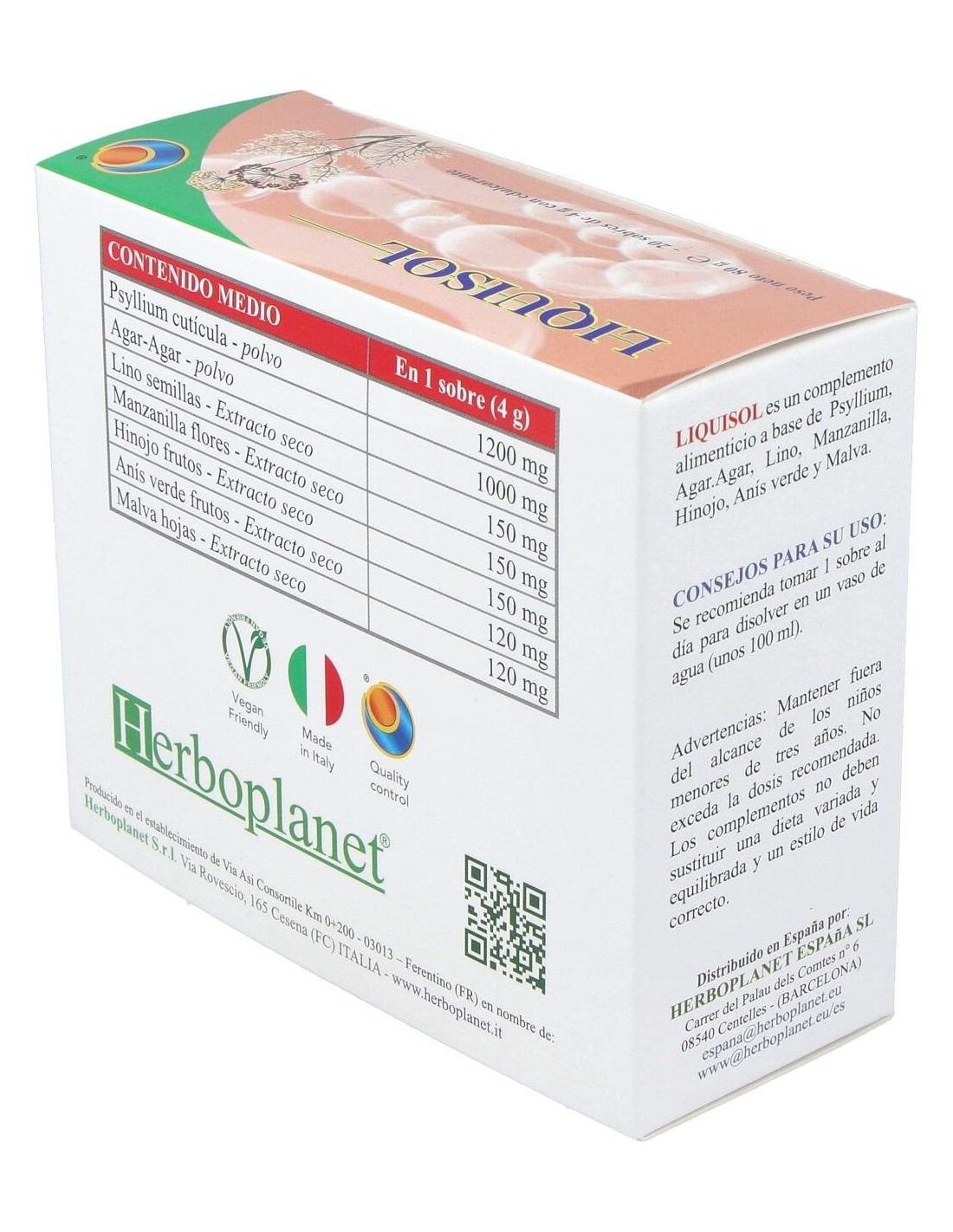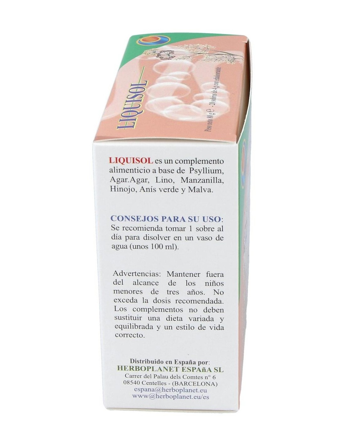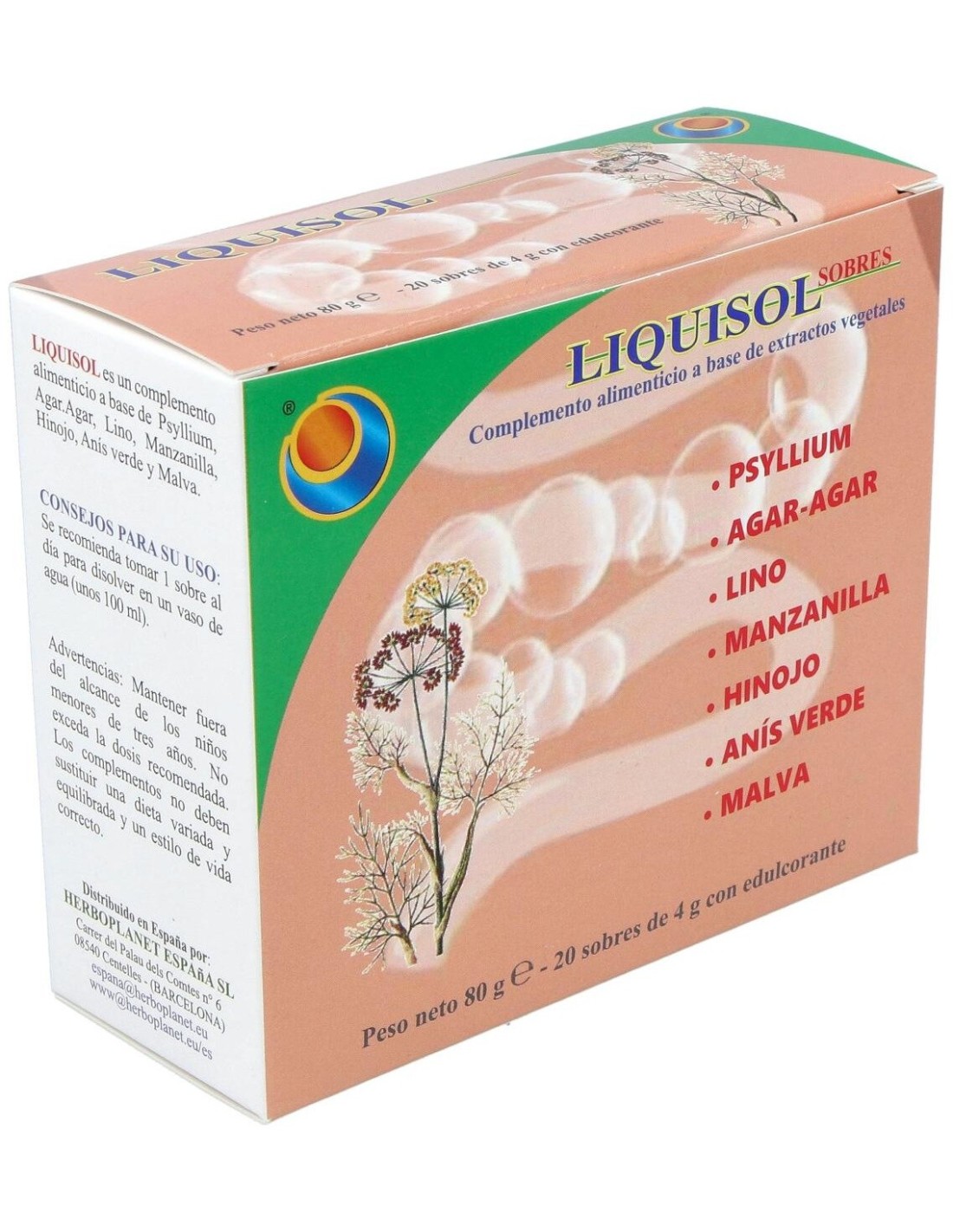 Liquisol é um suplemento alimentar à base de extratos vegetais com efeito prebiótico. Contribui para o volume e consistência normais das fezes, para a regularidade do trânsito intestinal, para a ação emoliente e suavizante: para o funcionamento regular do aparelho digestivo, para a motilidade gastrointestinal regular e para a eliminação de gases e função digestiva. Liquisol de Herboplanet é um suplemento alimentar que limpa divertículos, prisão de ventre por cólicas, meteorismo, disbiose. Regulador intestinal. Ingredientes por saqueta: Psyllium cutícula em pó (Plantago ovata Forsk.) 1,2 g, Agar-Agar (Gelidium amansii J.V. Lamouroux) talo em pó 1 g. Maltodextrinas. Extrato seco de sementes de linho (Linum usitatissimum L.) titulado para 20% em Lignanos 150 mg, extrato seco de flores de camomila (Matricaria chamomilla L.) titulado para 0,3% em Apigenina 150 mg, extrato seco de frutas de erva-doce (Foeniculum vulgare Mill.) titulado para 0,5% em óleo essencial, 150 mg, frutas de anis verde (Pimpinella anisum L.) extrato seco 120 mg, extrato seco de folhas de Malva (Malva sylvestris L.) 120 mg. Aroma, Acidificante: Ácido cítrico; Agente antiaglomerante: Dióxido de silício; Adoçante: Sucralose. Conselhos de utilização: Tomar 1 saqueta por dia para dissolver num copo de água (cerca de 100 ml). Apresentação: Embalagem com 20 sachês de 4 gramas.