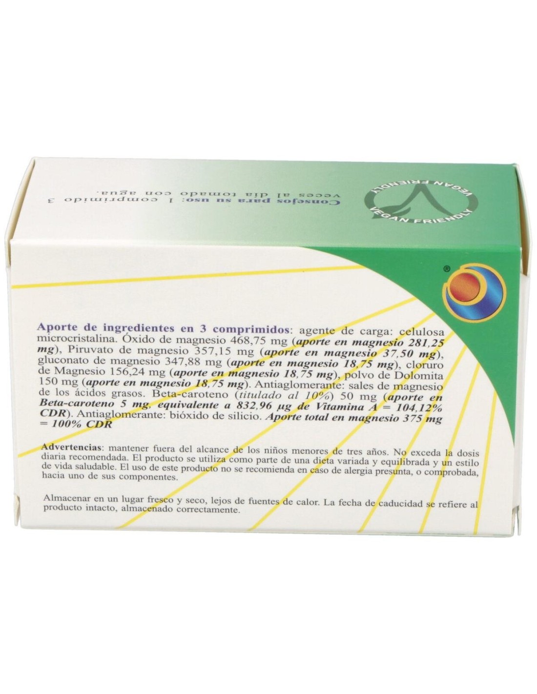 Magsol 5 Plus da Herboplanet é um suplemento alimentar à base de magnésio e beta-caroteno. Ajuda a reduzir o cansaço e a fadiga, contribui para o normal funcionamento do sistema nervoso, para a normal função psicológica e para a normal função muscular. A vitamina A contribui para a manutenção da pele em condições normais, a manutenção da visão em condições normais e o funcionamento normal do sistema imunitário. Magsol 5 Plus de Herboplanet é recomendado em casos de espasmos, distúrbios cardiovasculares, extra-sístole, taquicardia, angina de peito, tremores senis, cãibras musculares, osteoporose, fadiga crônica, colite e colecistite, psoríase, urticária, coceira de vários tipos, estresse, hipertensão arterial, síndrome pré-menstrual, depressão. Ingredientes para 3 comprimidos: Agente de volume: celulose microcristalina. Óxido de magnésio 468,75 mg (contribuição de magnésio 281,25 mg), Piruvato de magnésio 281,25 mg (contribuição de magnésio 37,5 mg), Gluconato de magnésio 347,88 mg (contribuição de magnésio 18,75 mg), Cloreto de magnésio 156,24 mg (contribuição de magnésio 18,75 mg), Dolomita em pó 150 mg (contribuição de magnésio 18,75 mg). Agente antiaglomerante: sais de magnésio de ácidos graxos. Beta-caroteno (titulado a 10%) 50 mg (contribuição em beta-caroteno 5 mg, equivalente a 104,12% VNR de Vitamina A). Agente antiaglomerante: dióxido de silício. Conselhos de utilização: Tomar 2-3 comprimidos por dia. Apresentação: Embalagem com 60 comprimidos.