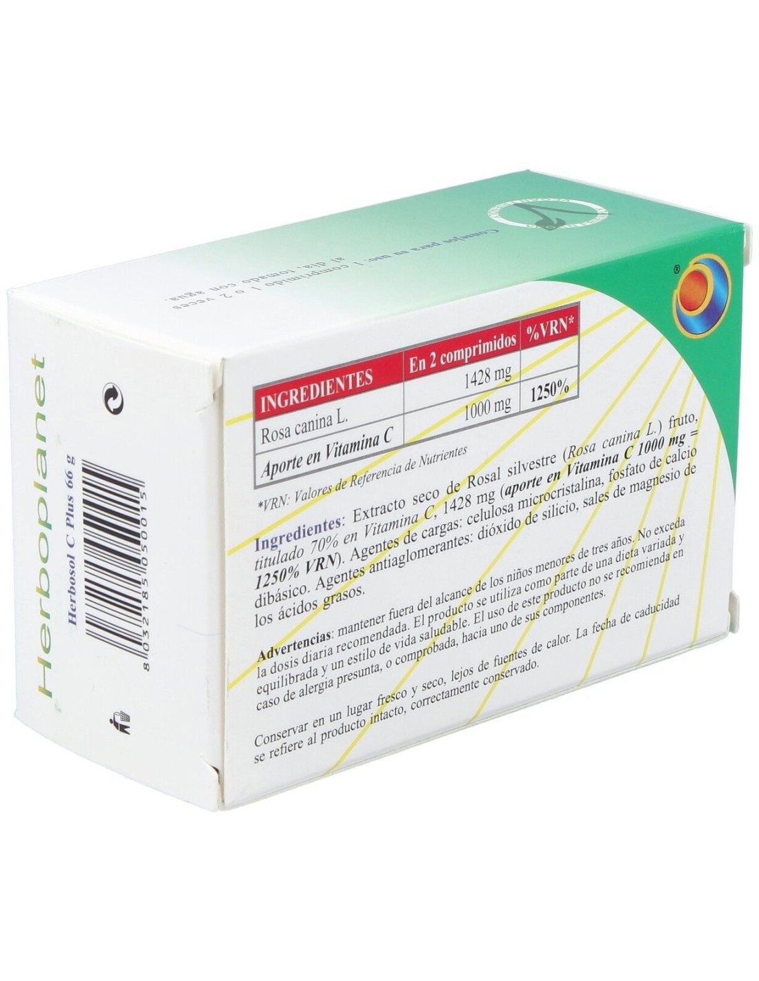 Herbosol C Plus da Herboplanet é um suplemento alimentar à base de Rosa canina e Vitamina C. A vitamina C contribui para a formação normal de colágeno para o funcionamento normal dos vasos sanguíneos, cartilagens, ossos e pele, bem como para o funcionamento normal do sistema imunológico e a proteção das células contra danos oxidativos. Herbosol C Plus da Herboplanet é um produto com ação antioxidante, neutraliza o estresse oxidativo, promove a absorção de cálcio e ferro, promove a formação de colágeno para cartilagem e pele. Fortalece as paredes das artérias e capilares. Restaurador. Suporta o sistema imunológico. Ingredientes para 2 comprimidos: Extrato seco de frutos de Rosa Selvagem (Rosa canina), titulado a 70% em vitamina C 1428 mg (contribuição em Vitamina C natural 1000 mg). Agentes de volume: celulose microcristalina, fosfato de cálcio dibásico. Agentes antiaglomerantes: sais de magnésio de ácidos graxos, dióxido de silício. Conselhos de utilização: Tomar 1 comprimido, uma ou duas vezes por dia. Apresentação: Embalagem com 60 comprimidos.