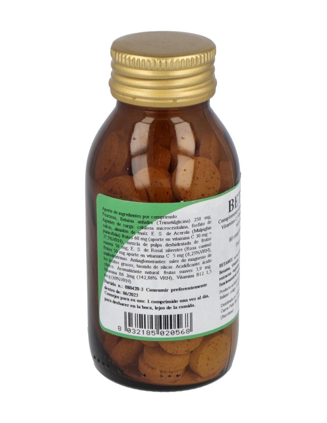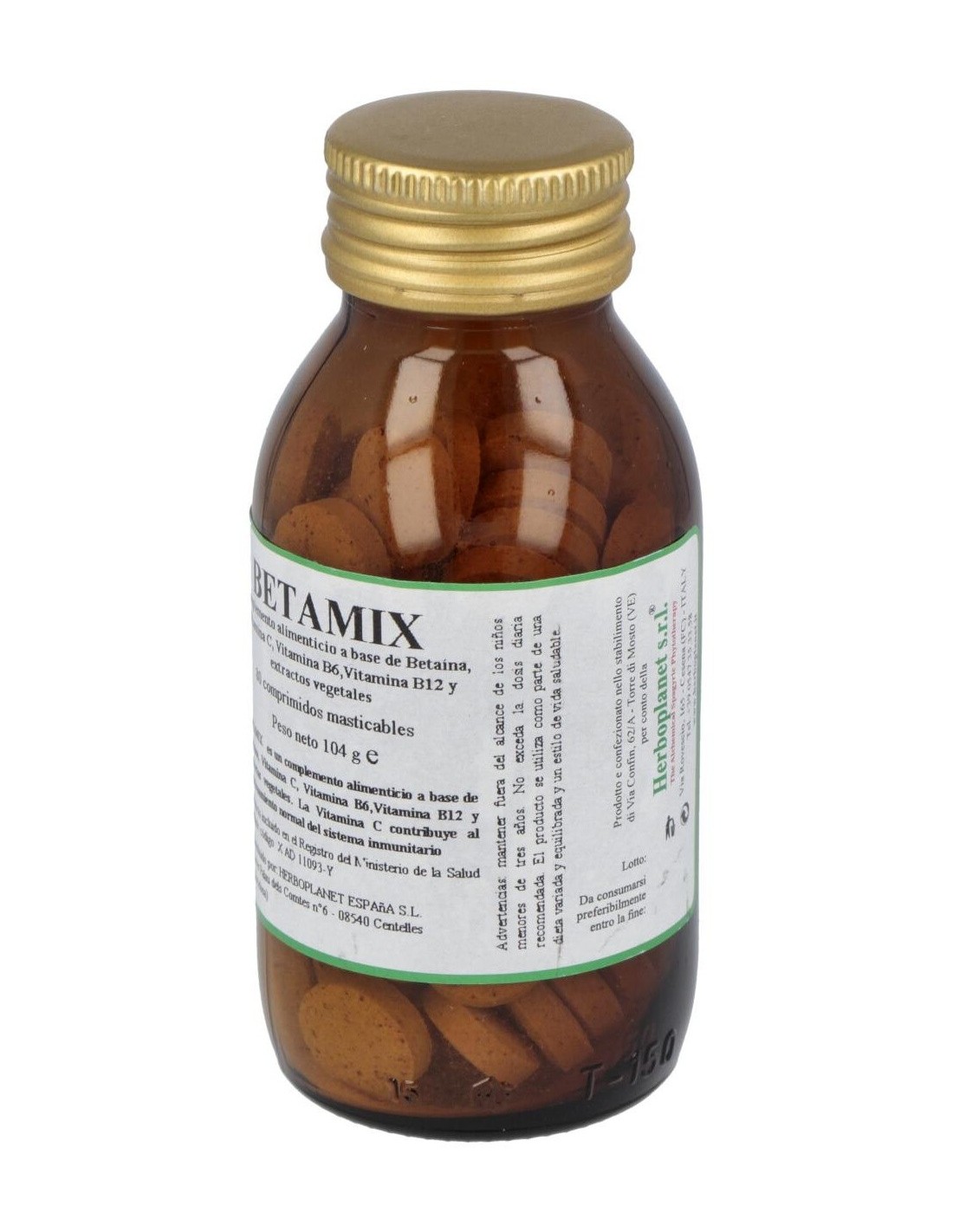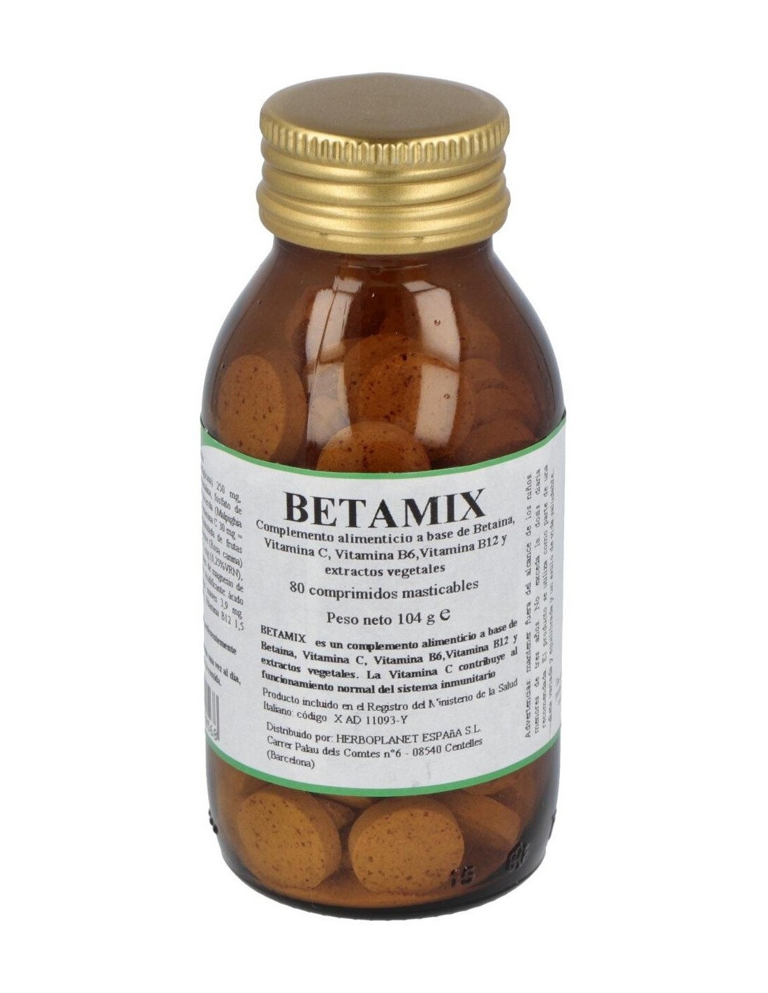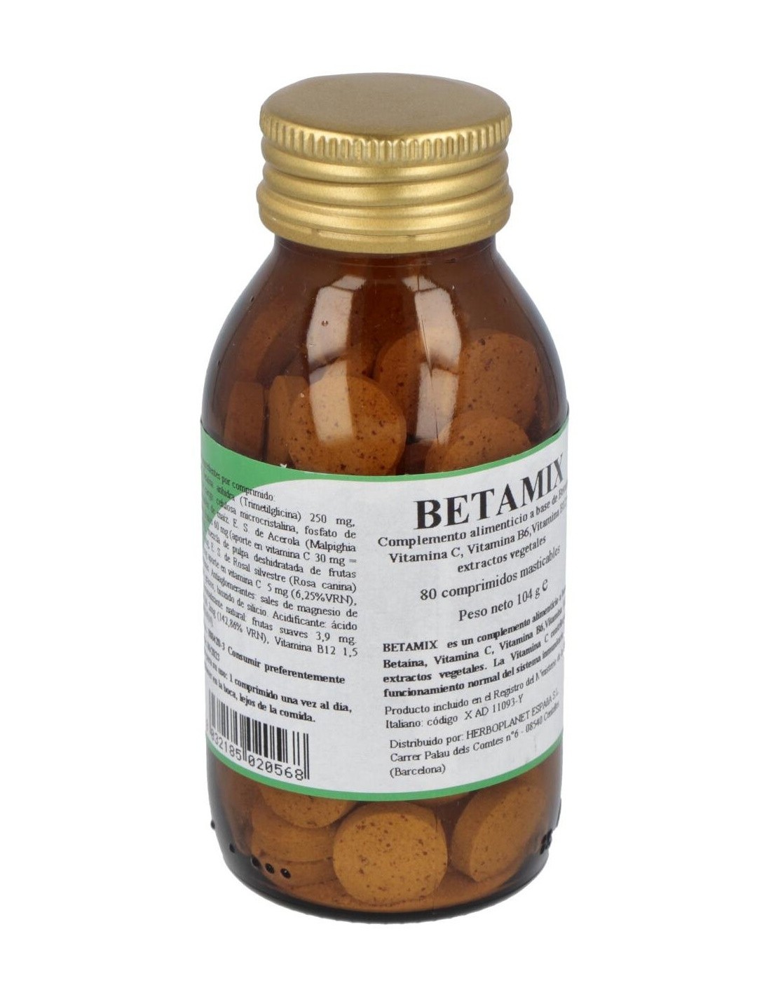 Complemento alimenticio a base de Betaína, extractos de plantas y vitaminas. La Vitamina C contribuye a la protección de las células del estrés oxidativo. La Vitamina B6 contribuye a la normal función del sistema inmunitario. La Vitamina B12 contribuye al normal metabolismo de la homocisteína. La Vitamina B2 (Riboflavina) contribuye al mantenimiento de la normal capacidad visual. El Folato contribuye al crecimiento de los tejidos maternos en el embarazo. Comprimidos masticables.