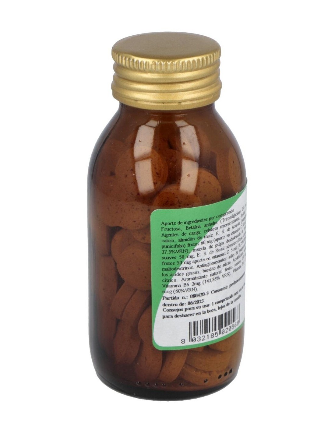 Betaína citrato 250 mg. Edulcorantes: Isomalt, Sucralosa, Glucósidos esteviolicos, Neoesperidina Extracto seco de Acerola (Malpighia punicifolia) frutos 60 mg titulada al 50% (aporte en vitamina C 30 mg = 37,5% VRN). Aroma. Extracto seco de Rosal silvestre (Rosa canina) frutos 50 mg titulada al 70% en vitamina C (aporte en vitamina C 35 mg = 43,75% VRN). Hidroxipropilcelulosa. Antiaglomerantes: sales de magnesio de los ácidos grasos, dióxido de silicio. Vitamina B2 (Riboflavina) 2,04 mg (145 % VRN), Vitamina B6 (Piridoxina HCl) 2 mg (143%VRN), Vitamina B12 (Metilcobalamina) 1mg (40000% VRN). Folmidable® (Sal de Calcio del 5-metil tetrahidrofolato ) Folato 0,4 mg (200% VRN). Aporte total en Vitamina C 65 mg
