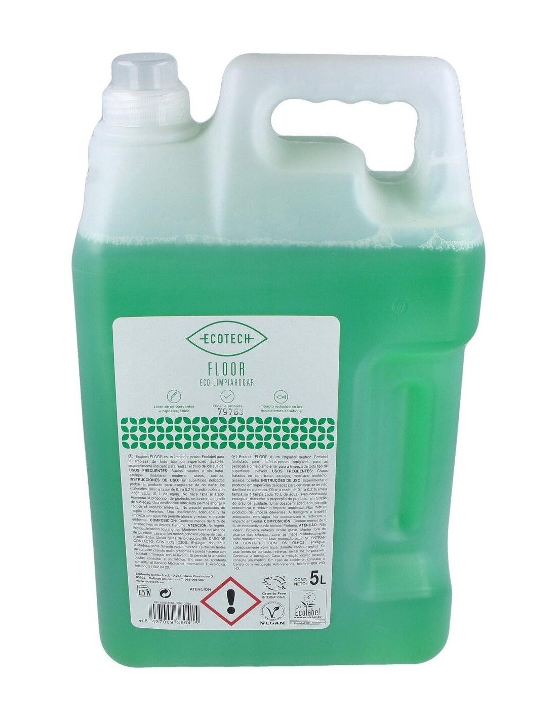 Limpiador neutro ecológico agradablemente perfumado indicado para la limpieza con resultados brillantes y sin velos de todo tipo de suelos y superficies lavables. Apto para la industria alimentaria. No incluye en su fórmula sales de amonio cuaternario, ni fósforo ni sustancias o compuestos con una clasificación de peligro indicada por la reglamentación Ecolabel de la Unión Europea. No contiene más de un 6% de compuestos orgánicos volátiles.