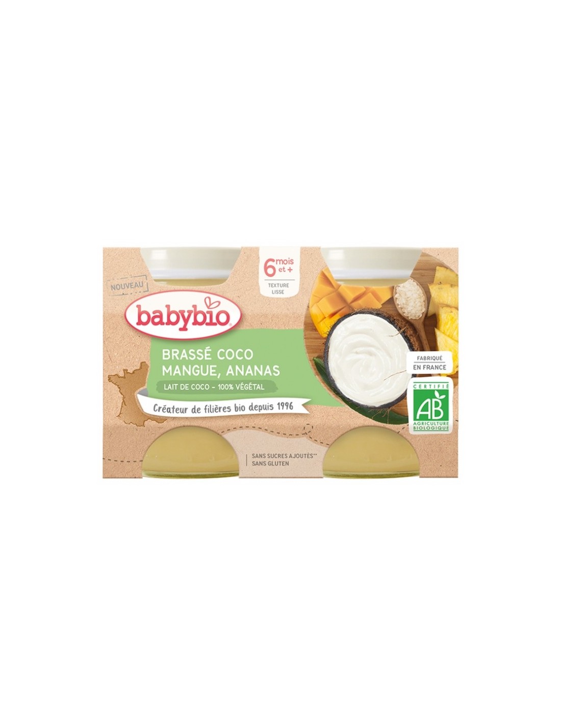 A cerveja vegetal orgânica de coco, manga e abacaxi Babybio 6 meses e + 2 potes de 130 g é uma infusão de textura macia feita com leite de coco, manga, maçã New Aquitaine e arroz Camargo.