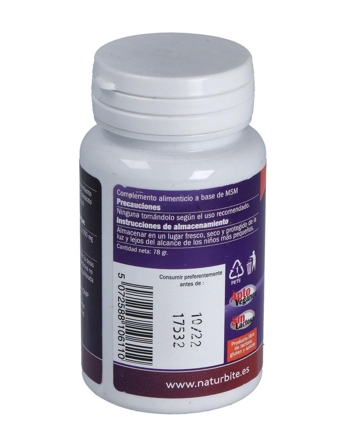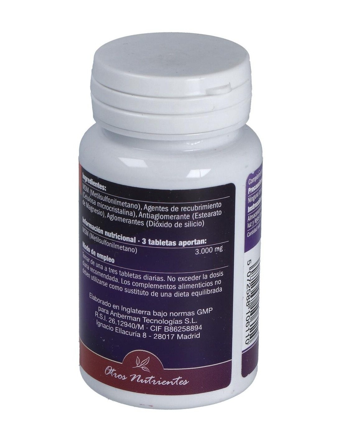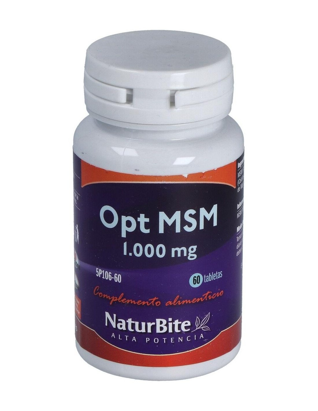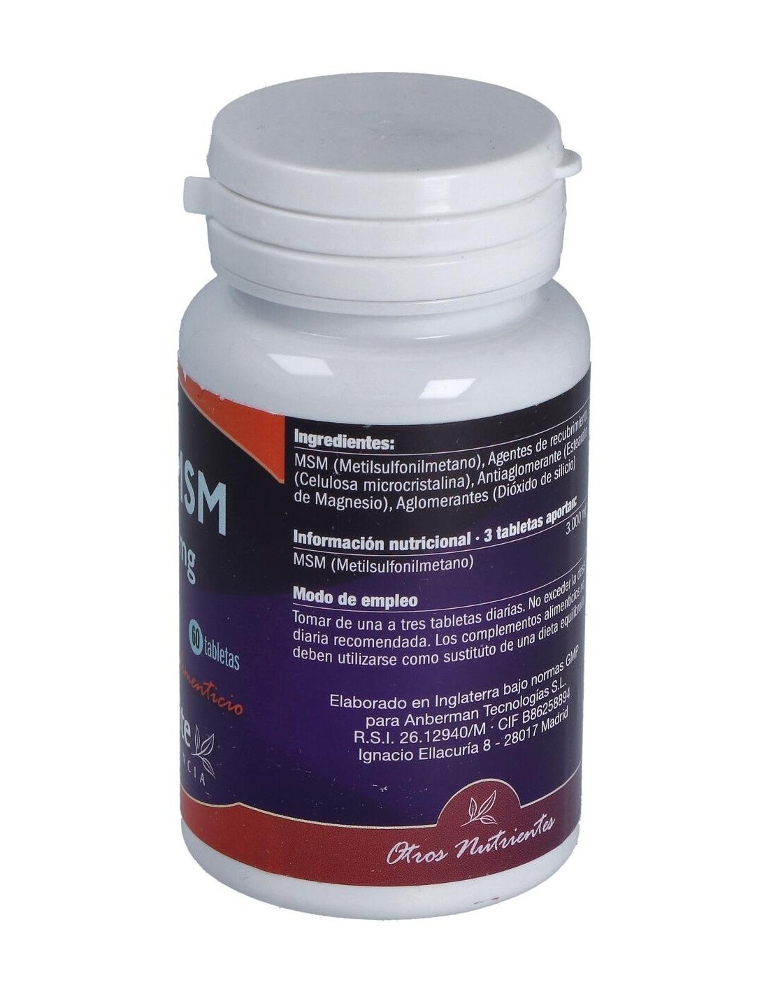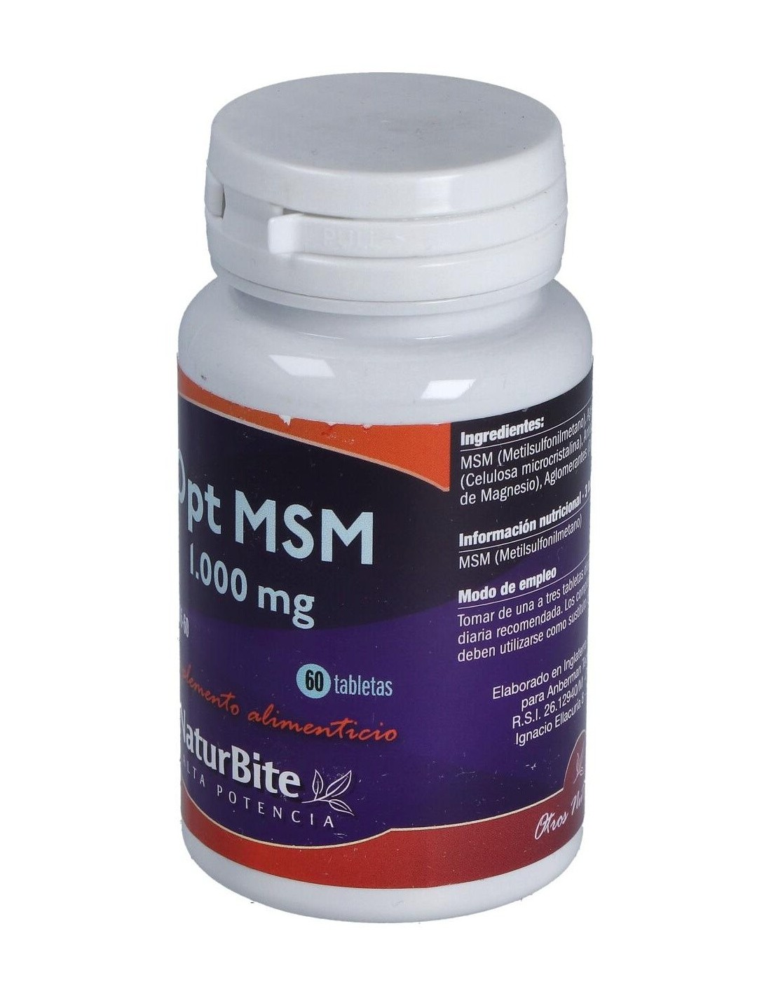 Por 1 comprimido: MSM (Metilsulfonilmetano) 1.000 mg, Celulosa microcristalina, Estearato de magnesio, Dióxido de silicio.