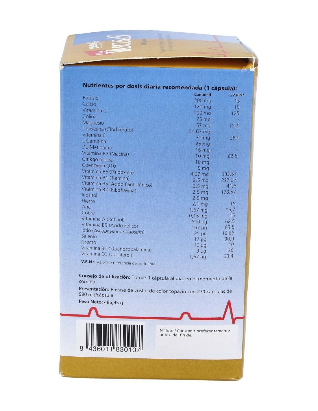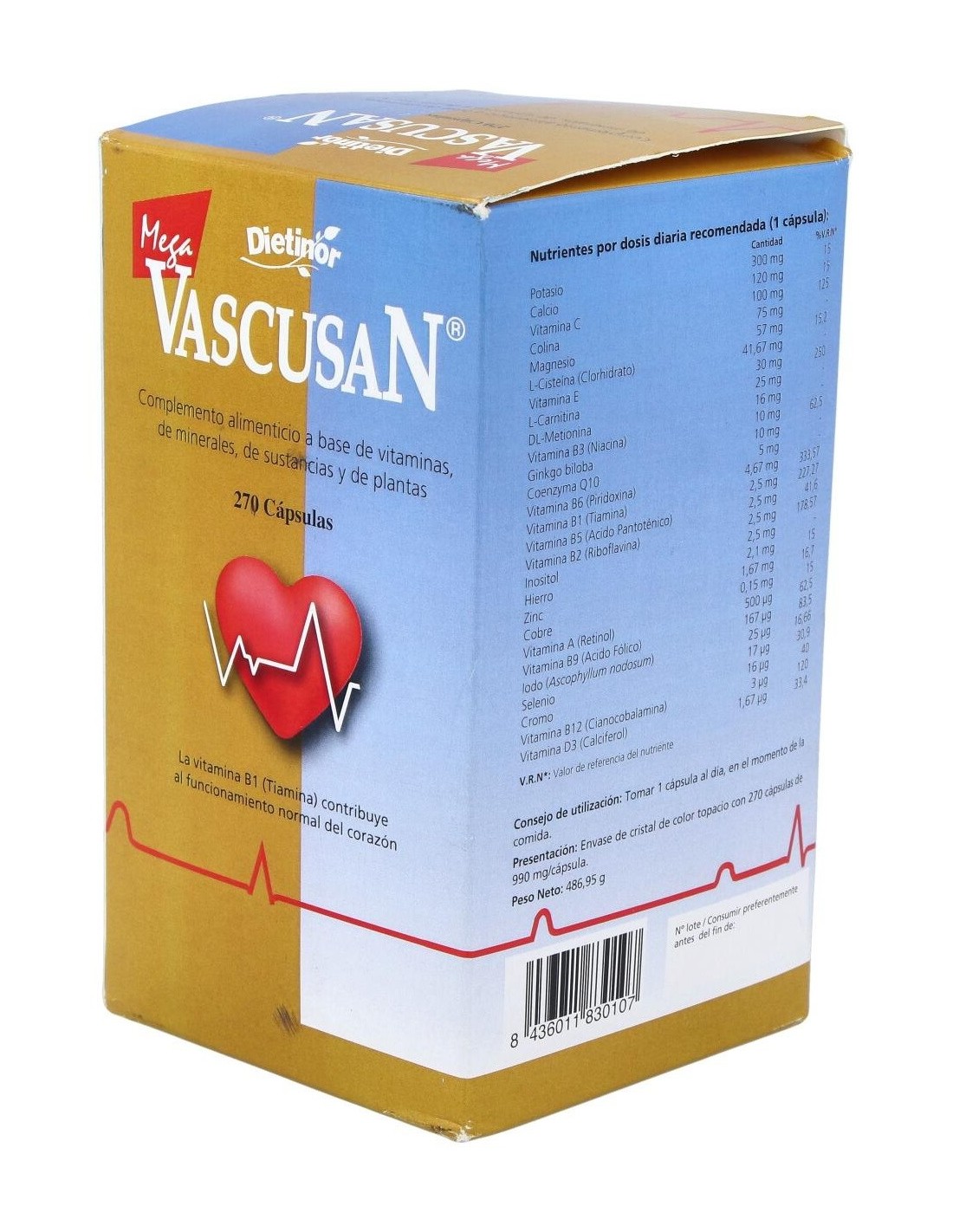 Mega Vascusan 270 cápsulas de Dietinor es un suplemento para adultos que apoya el bienestar general, formulado con ingredientes seleccionados para contribuir al equilibrio corporal y mental.