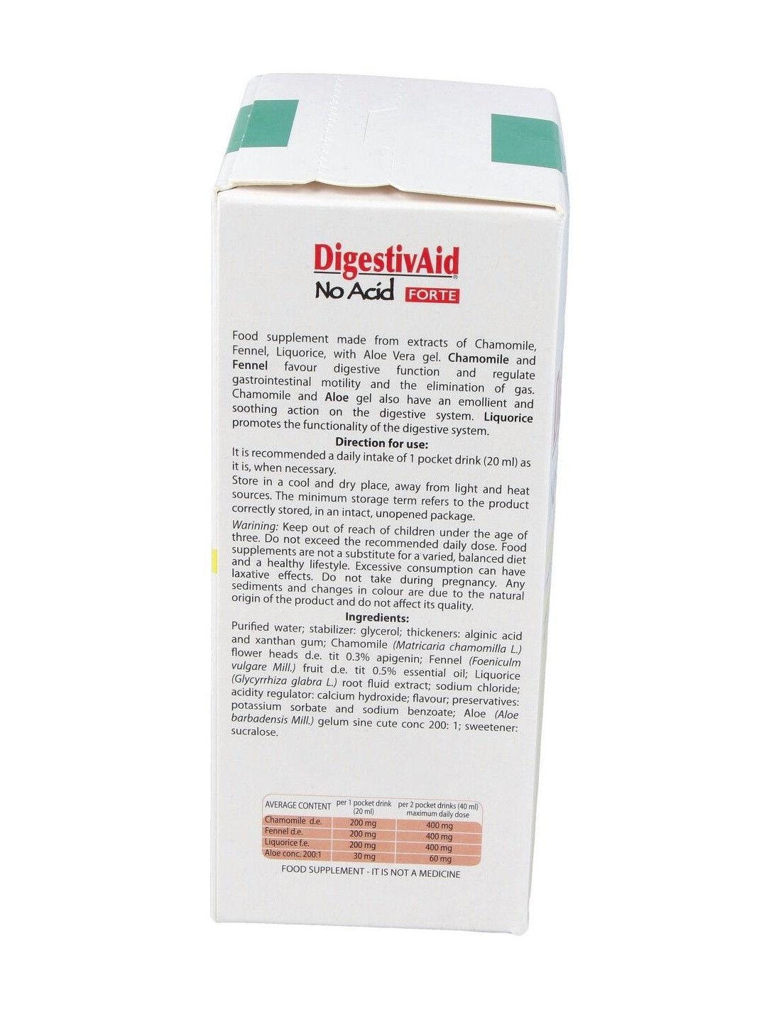 Complemento dietético a base de extractos concentrados vegetales de manzanilla e hinojo, los cuales apoyan una normal función digestiva y pueden ser útiles en caso de ardor, reflujo y pesadez de estómago. El producto contiene flavonoides (Regaliz y Manzanilla) y polisacáridos naturales obtenidos del Aloe vera y de algas marinas que ayudan a crear una barrera sobre el contenido del estómago para impedir el reflujo y a su vez proteger la mucosa gástrica. Sabor regaliz.