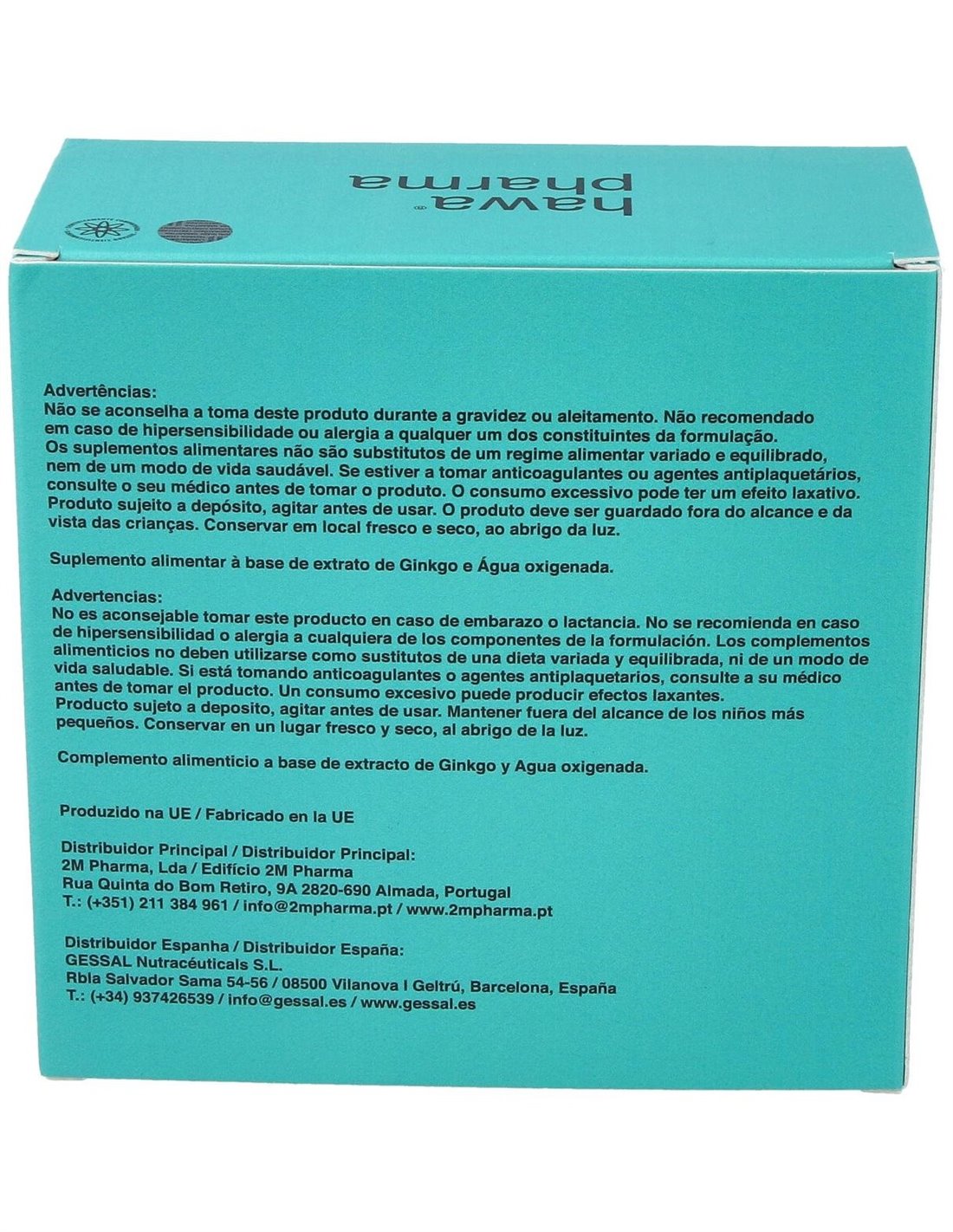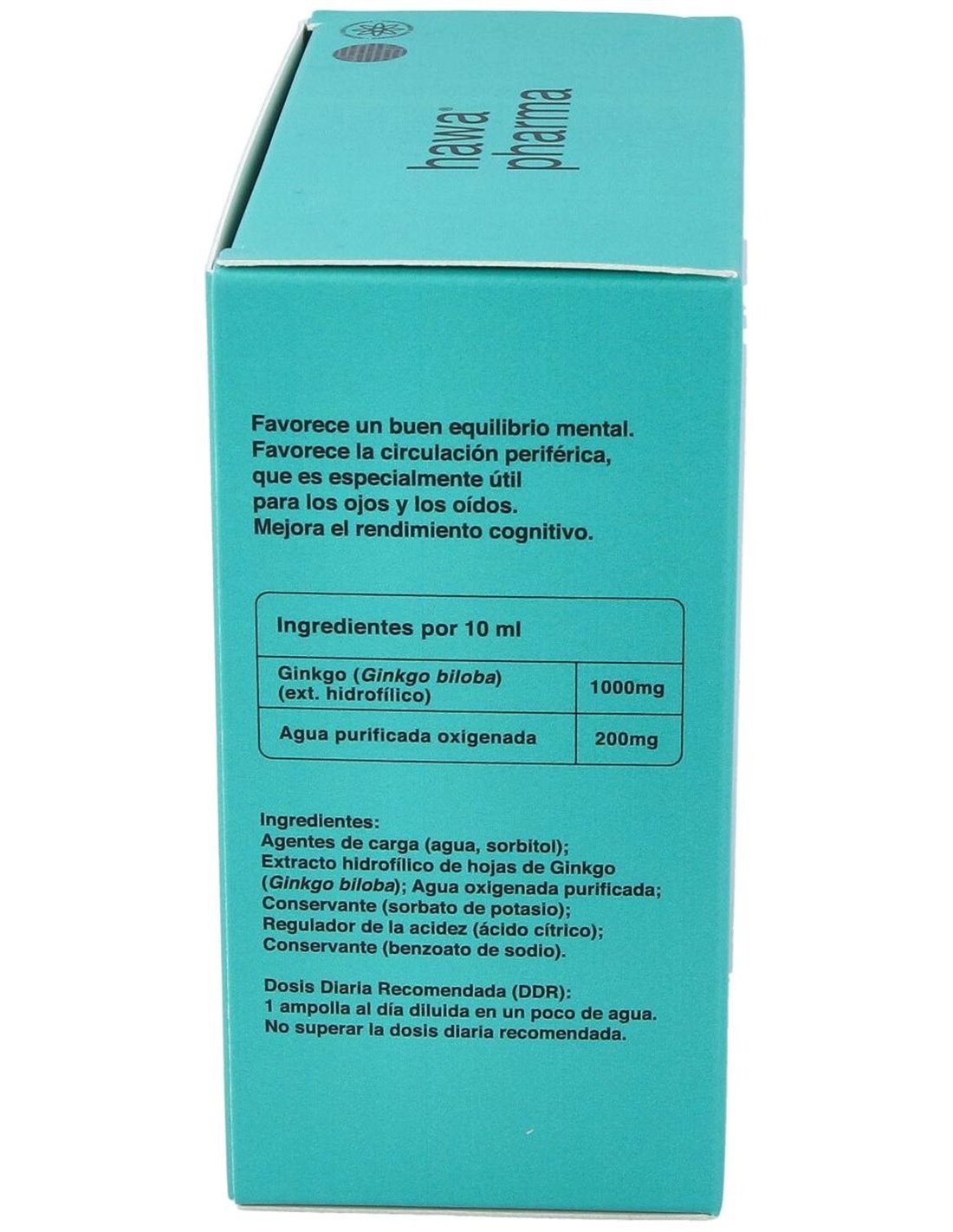 Agentes de carga (agua, sorbitol): Extracto hidrofílico de hojas de Ginkgo (Ginkgo biloba): Agua oxigenada purificada: Conservante (sorbato de potasio): Regulador de la acidez (ácido cítrico): Conservante (benzoato de sodio).