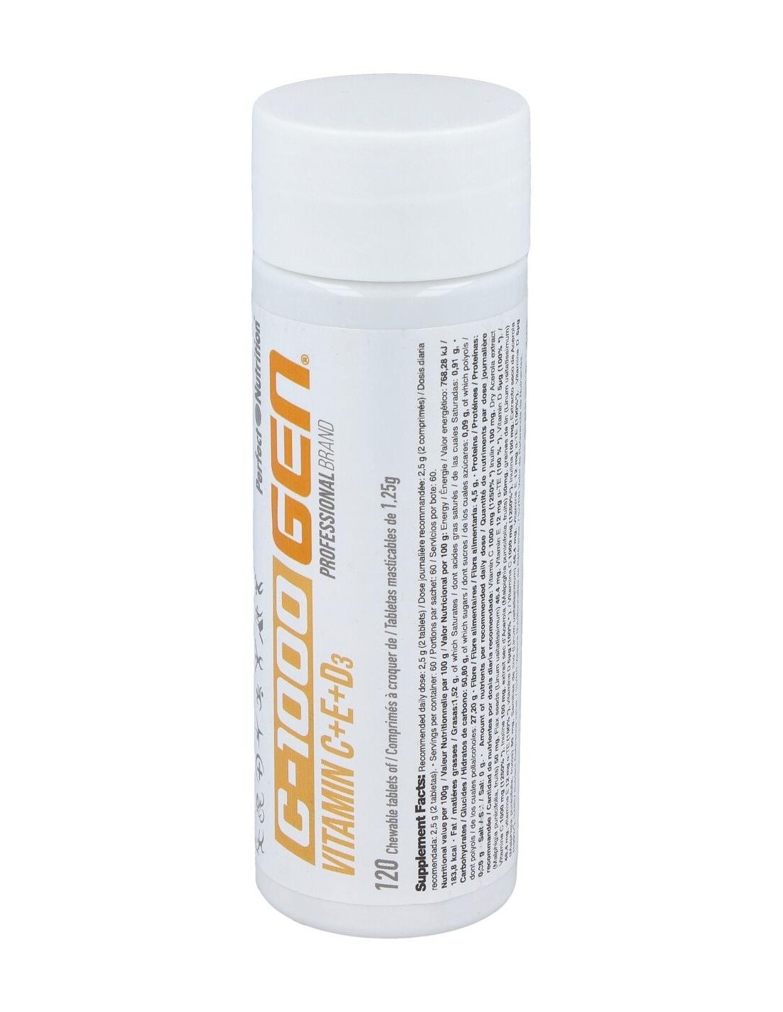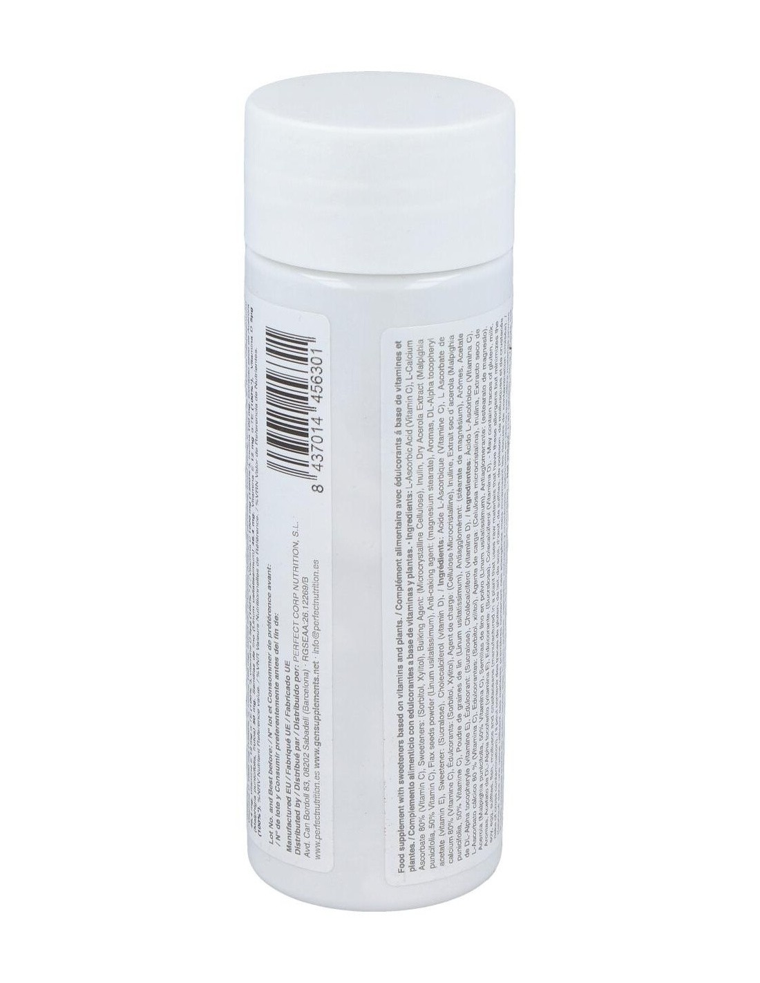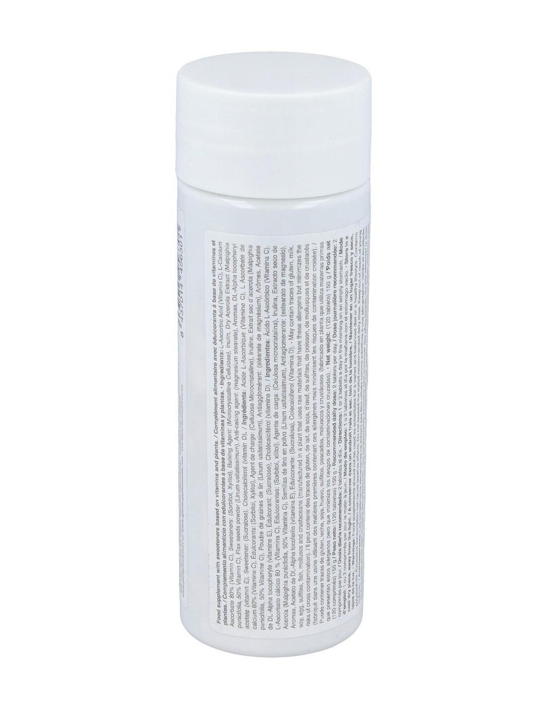 Ácido L-Ascórbico (Vitamina C), L-Ascorbato cálcico 80 % (Vitamina C), Edulcorantes: (Sorbitol, xilitol), Agente de carga: (Celulosa microcristalina), Inulina, Extracto seco de Acerola (Malpighia punicifolia, 50% Vitamina C), Semillas de lino en polvo (Linum usitatissimum), Antiaglomerante: (estearato de magnesio), Aromas, Acetato de DL-Alpha tocoferilo (vitamina E), Edulcorante: (Sucralosa), Colecalciferol (Vitamina D).