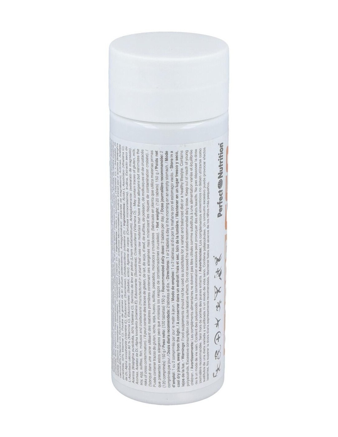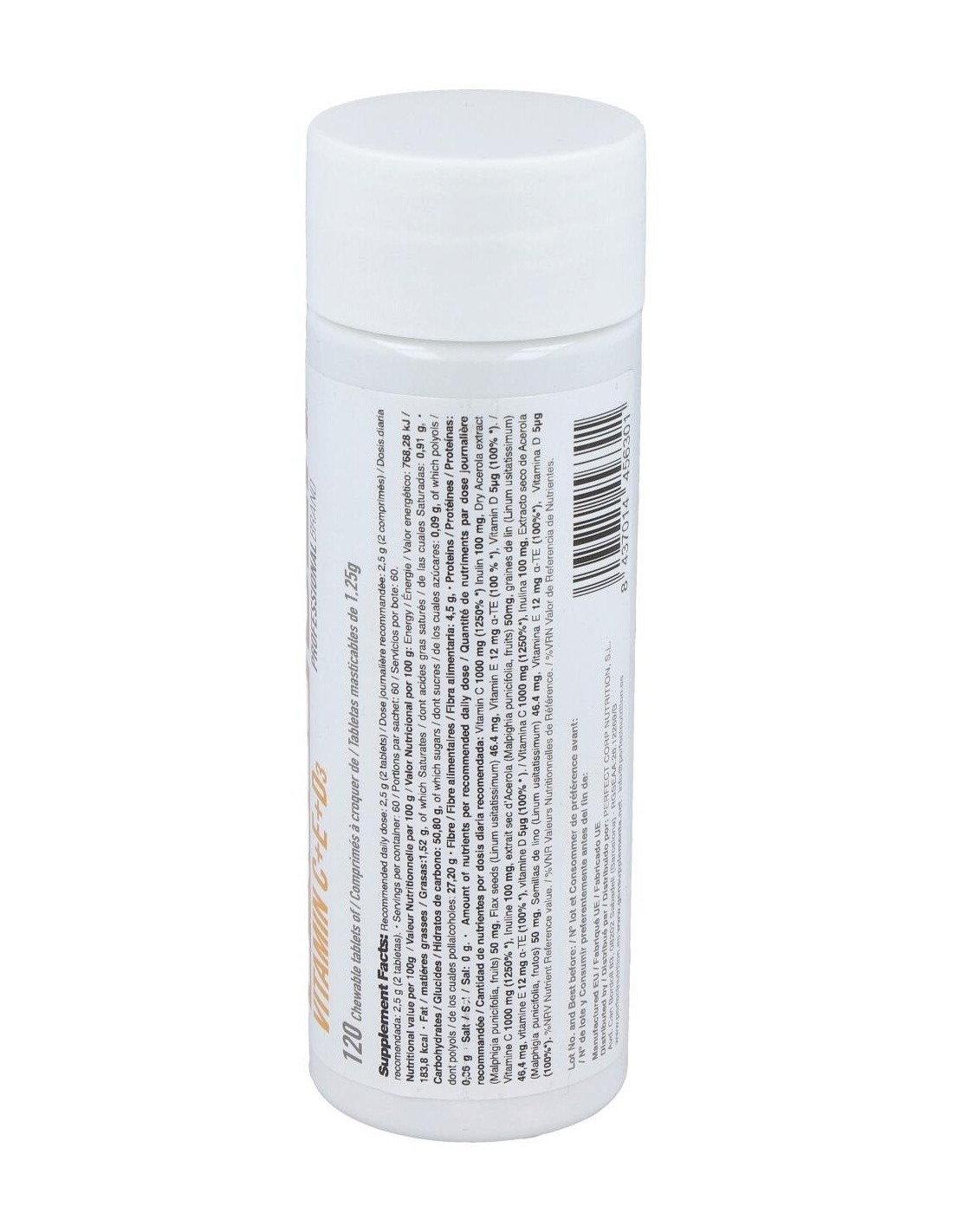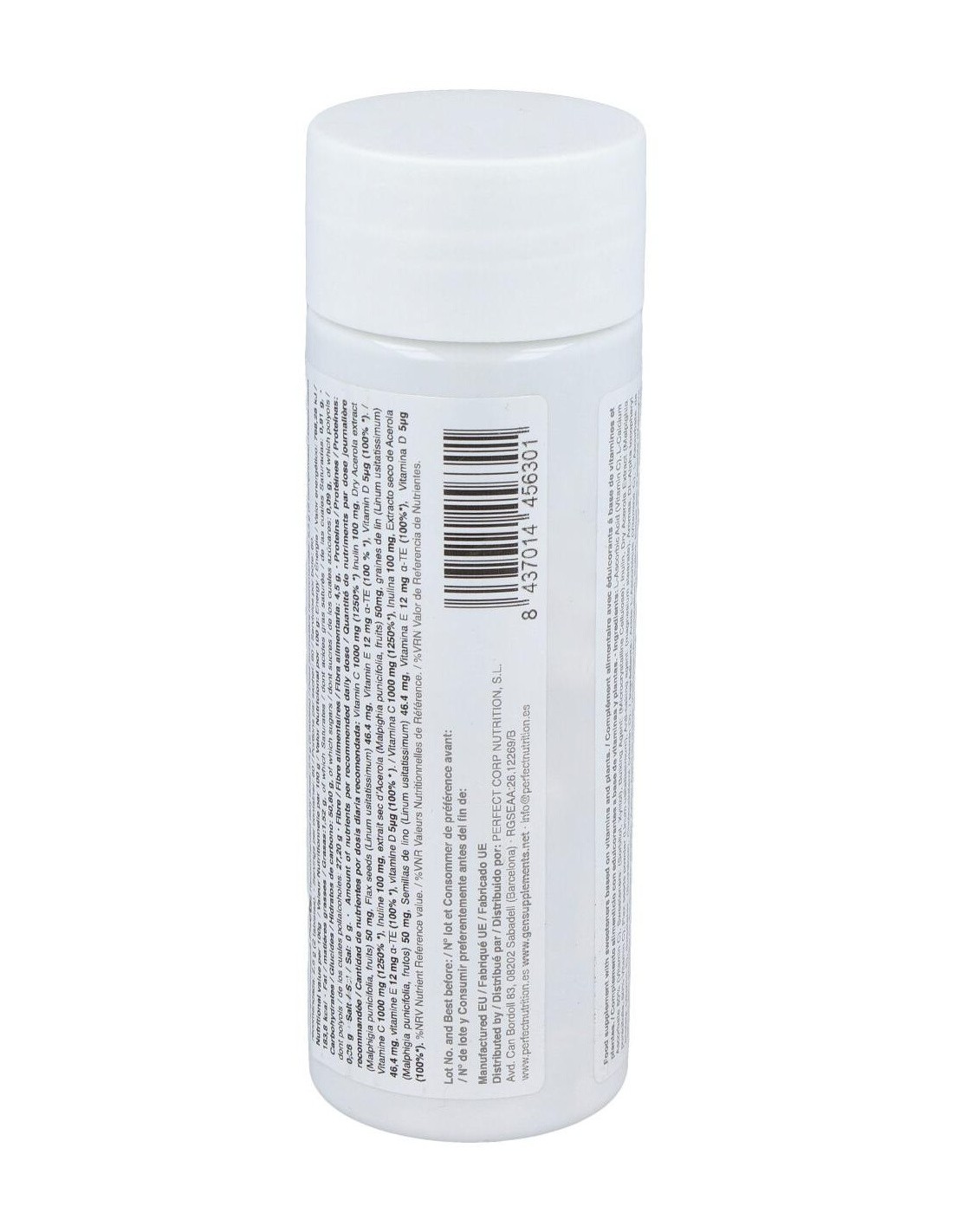Ácido L-Ascórbico (Vitamina C), L-Ascorbato cálcico 80 % (Vitamina C), Edulcorantes: (Sorbitol, xilitol), Agente de carga: (Celulosa microcristalina), Inulina, Extracto seco de Acerola (Malpighia punicifolia, 50% Vitamina C), Semillas de lino en polvo (Linum usitatissimum), Antiaglomerante: (estearato de magnesio), Aromas, Acetato de DL-Alpha tocoferilo (vitamina E), Edulcorante: (Sucralosa), Colecalciferol (Vitamina D).