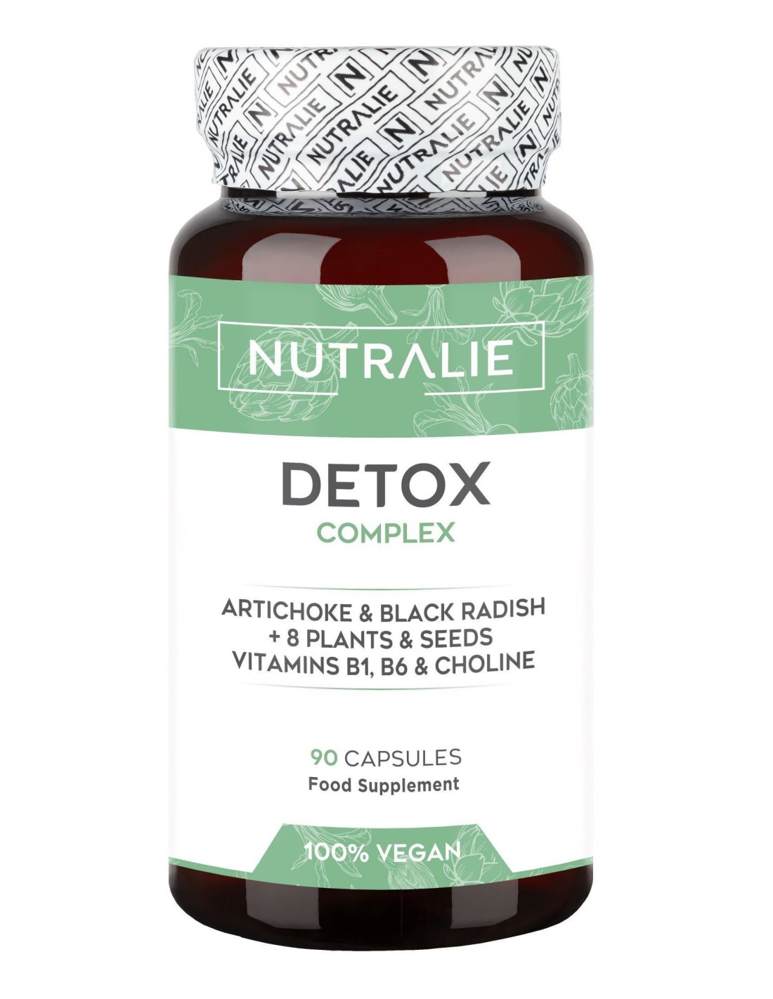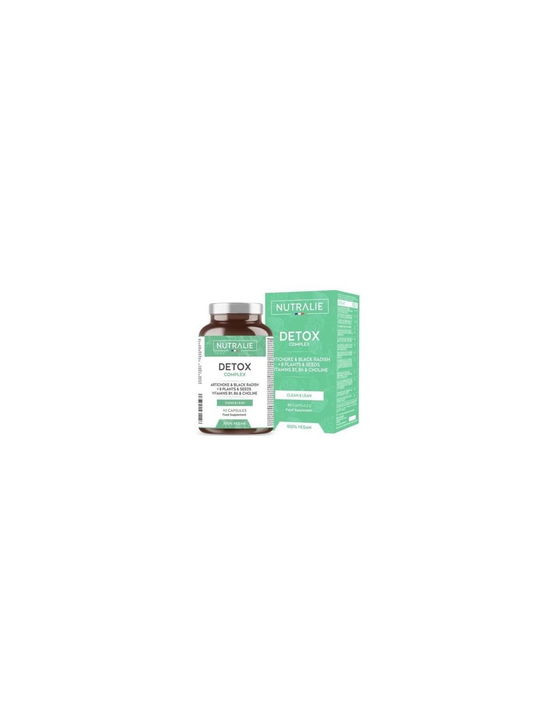 Detox Complex es 100% natural y vegano y está compuesto por diferentes plantas y semillas entre las cuáles destacan la alcachofa y el rábano negro. Además, en esta fórmula natural se incluyen también la colina y las vitaminas B1 y B6, esta última encargada de contribuir al metabolismo energético normal.Gracias a la colina presente el complemento Detox Complex de Nutralie contribuirás a regular el metabolismo normal de los lípidos. Este suplemento alimenticio para adelgazar cuenta con una formulación 100% natural y vegana.Gracias a las vitaminas B6 y B1 que contribuyen al metabolismo energético normal. La vitamina B6 a su vez, ayudará a disminuir el cansancio y la fatiga. La colina contenida en el complemento Detox de Nutralie contribuirá a mantener la función hepática normal.Composición activa por 3 cápsulas: