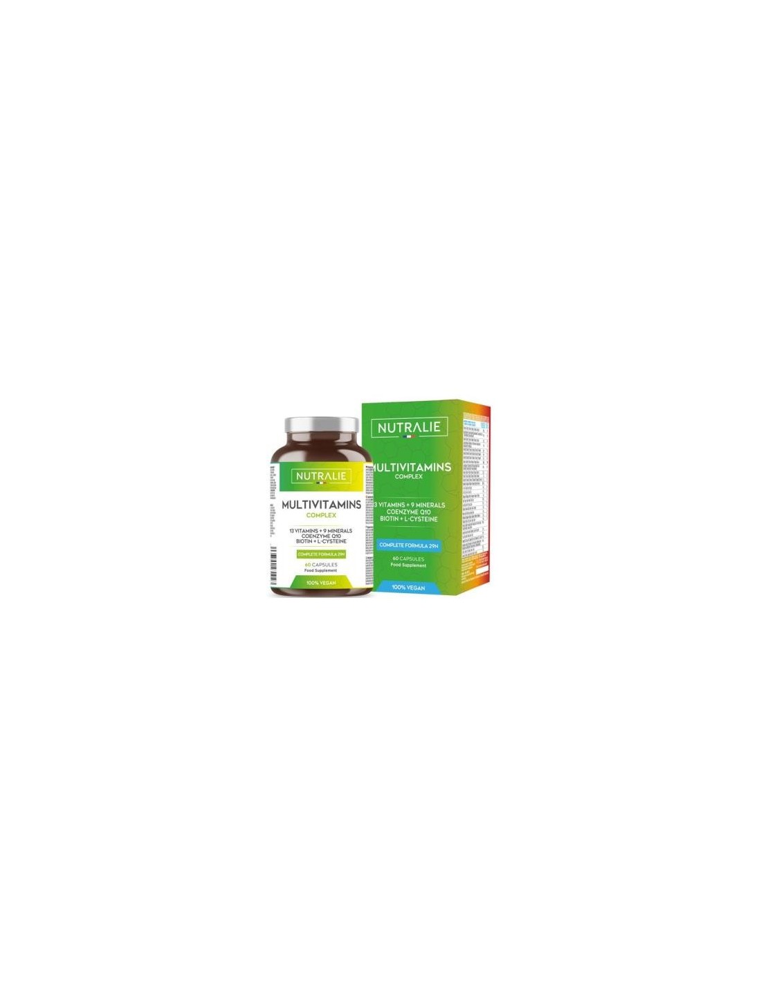 Multivitaminas Complex de Nutralie, de carácter 100% vegano, presenta una combinación de 29 ingredientes, detalladamente seleccionados para ofrecer una gran variedad de efectos beneficiosos al organismo. Con 13 vitaminas y 9 minerales, entre los que destacan el cobre, el magnesio o el zinc, junto con la biotina, la L-cisteína y la coenzima Q10, Multivitaminas Complex, se convierte en un complemento vitamínico diario, pensado para acompañar una dieta sana y equilibrada.Multivitaminas Complex, contribuyen al metabolismo energético normal, además el ácido pantoténico, el folato, el magnesio y el hierro, incluidos en la fórmula, ayudan a disminuir el cansancio y la fatiga. Contribuyen al funcionamiento normal del sistema inmunitario, además la vitamina C también contribuye al funcionamiento normal del sistema inmunitario durante y después del ejercicio físico intenso.Multivitaminas Complex, contribuye a la formación normal de colágeno para el funcionamiento normal de la piel, vasos sanguíneos, huesos, cartílagos, los dientes y las encías. También contribuye a la síntesis proteínica normal y al metabolismo normal de los macronutrientes. La vitamina B6 también presente, contribuye al metabolismo normal de las proteínas y del glucógeno.Composición activa por cápsula: