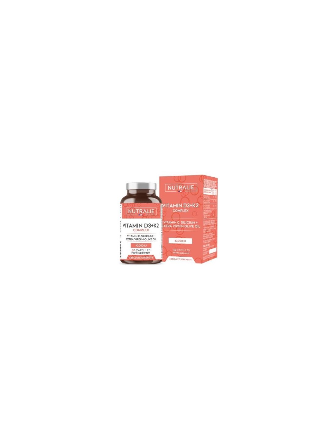 Vitamina D3 + K2 Complex es un producto que contiene vitamina D3 (colecalciferol) en 10.000 UI y vitamina K2 (menaquinona) del tipo MK-7, ambas en una