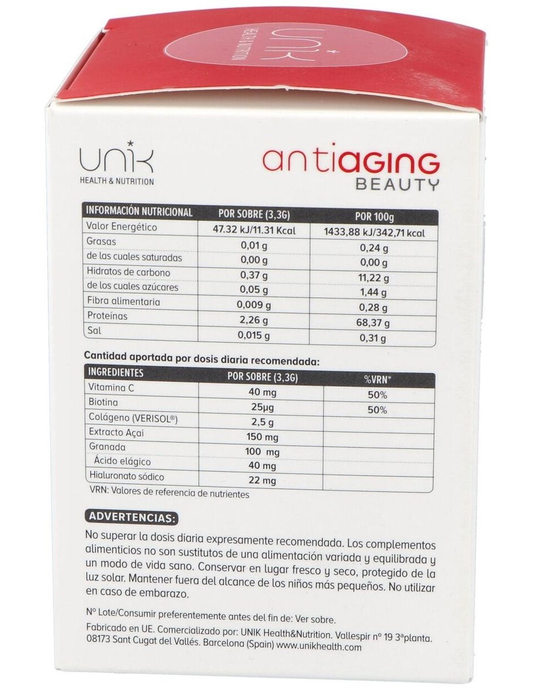 Colágeno hidrolizado (Verisol®) acidulante (Ácido cítrico) E.S Açai (Euterpe oleracea Mart., Fruto) E.S Granada (Punica Granatum L, fruto) colorante (rojo de remolacha), Aroma de frutos del bosque maltodextrina, Ácido L-ascórbico (vitamina C) Hialuronato sódico colorante (Betacaroteno) edulcorante (Sucralosa) D Biotina (Biotina) Por 1 sobre: Vitamina C......40 mg Biotina..........25 µg Colágeno (Verisol®) .....2,5 g Extracto Açai..............150 mg Granada .........100 mg Ácido elágico....40 mg Hialuronato sódico.....20 mg