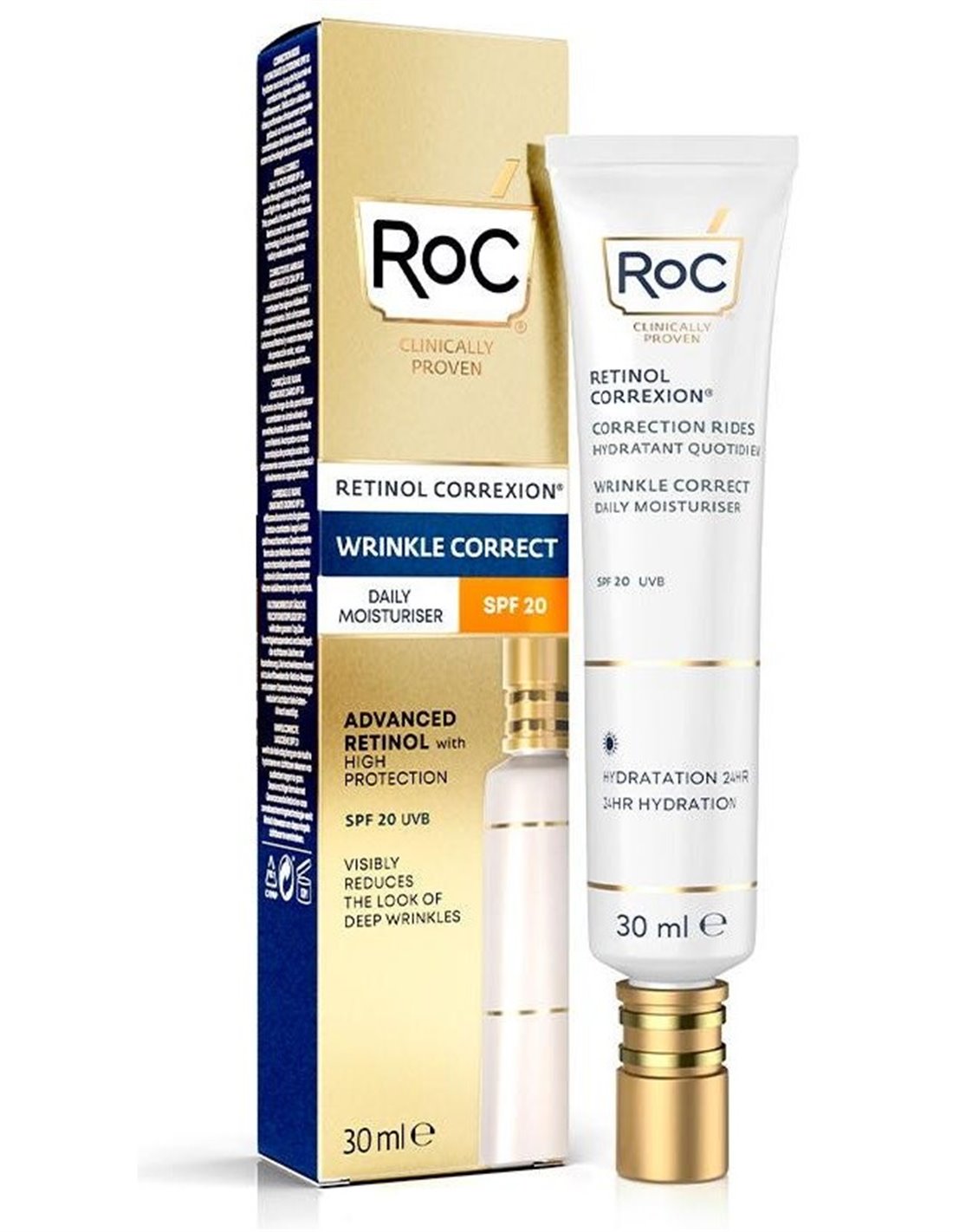 Ayuda a combatir los signos de la edad gracias a su combinación de RoC® Retinol y vitamina E. Una fórmula clínicamente probada para reducir arrugas notables en solo 12 semanas. Contiene SPF 20 que ayuda a proteger la piel de los rayos UVA/UVB, que pueden originar futuros daños y envejecimiento prematuro.
