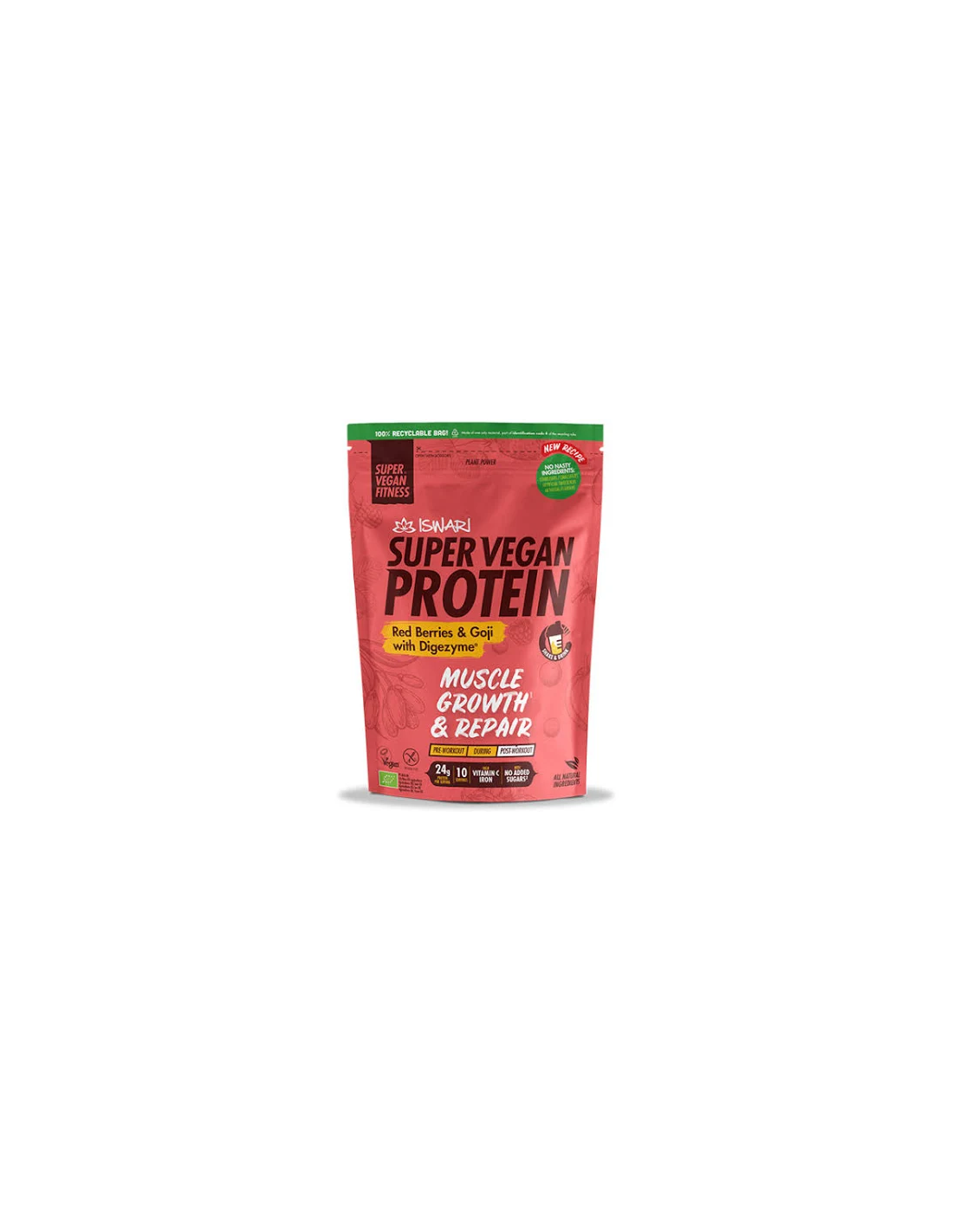 Una mezcla 100 % vegetal de proteínas vegetales, BCAA, semillas de goji y enzimas digestivas, con 24 g de proteína por ración. Super Vegan Protein Frutos rojos & Goji está diseñado para mejorar los resultados posteriores al entrenamiento, lo que contribuye a aumentar la masa muscular y favorece una recuperación más rápida.
