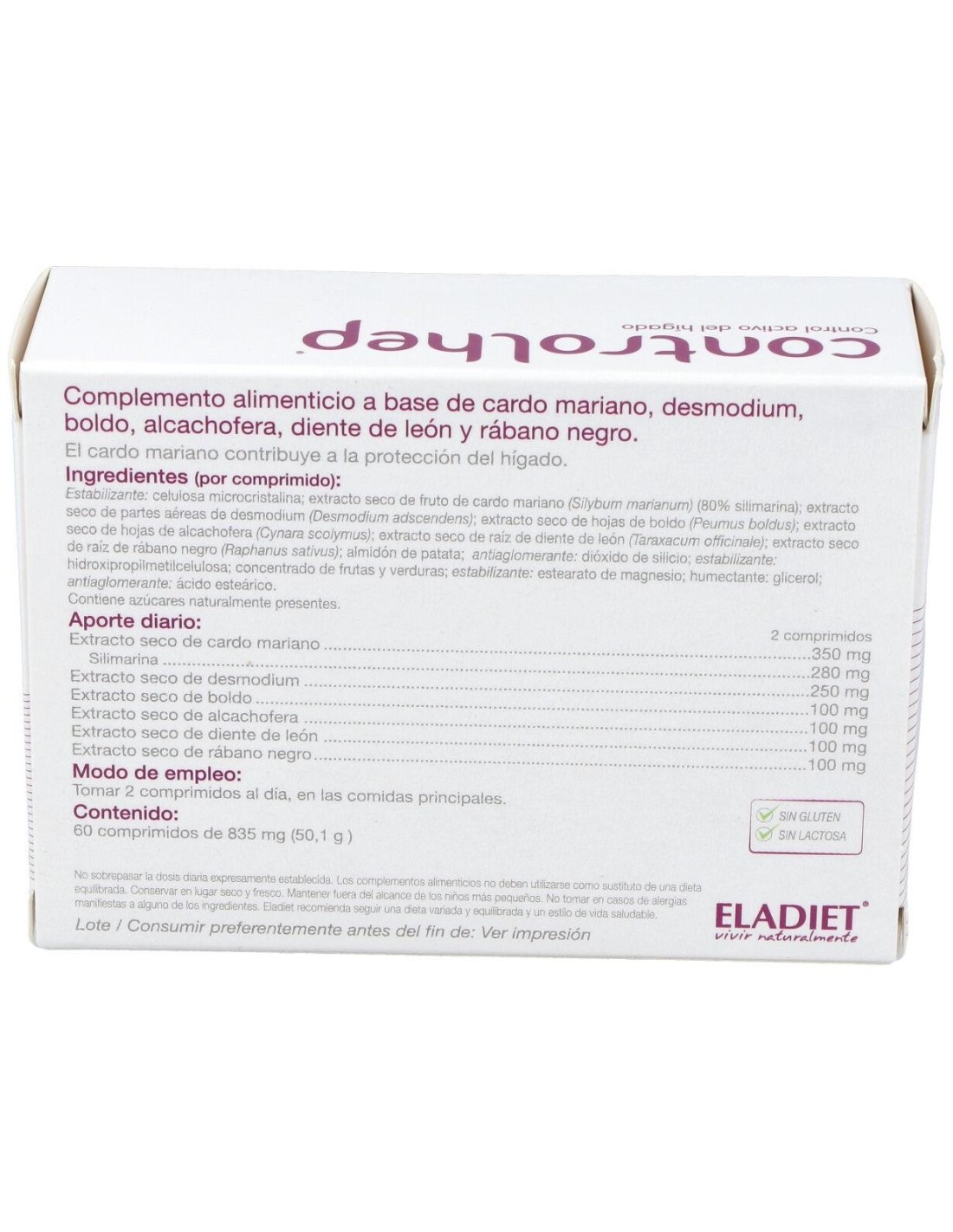 Controlhep favorece la protección, detoxificación y regeneración del hígado gracias a su contenido en cardo mariano, desmodium, boldo, diente de león, alcachofera y rábano negro. Ingredientes por dosis diaria recomendada (2 comprimidos):