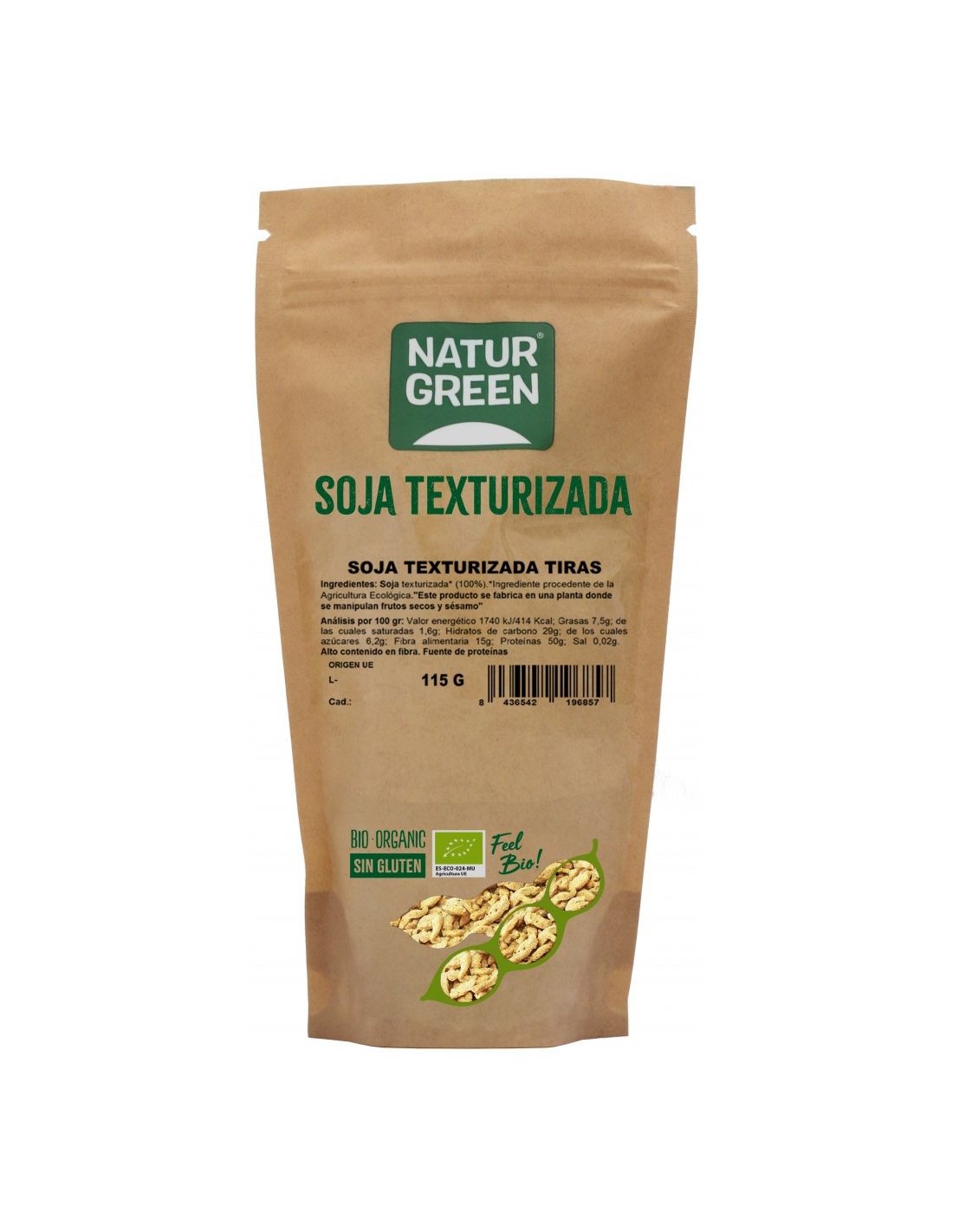 Ingredientes:Soja texturizada* (100%). (*) Ingredientes procedentes de la agricultura ecológica.Valor nutricional por 100 gramos:
