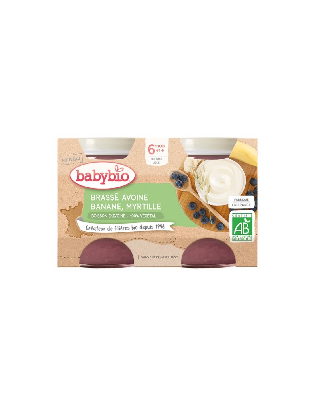 Babybio Avena Orgánica Plátano Arándano 6 Meses y + 2 Frascos de 130 g es una infusión de textura suave elaborada con bebida de avena, plátano y arándano.