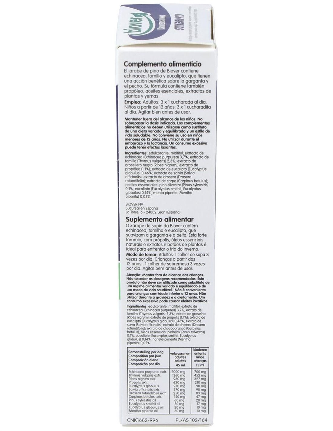 El jarabe de pino sin azúcar de Biover a base de echinacea, tomillo y eucalipto tiene una acción benéfica sobre la garganta y el pecho. Esta fórmula con propóleo, aceites esenciales y extractos de plantas y yemas es ideal para tomar en los días fríos de invierno.Ingredientes activos por dosis diaria recomendada (45 ml):