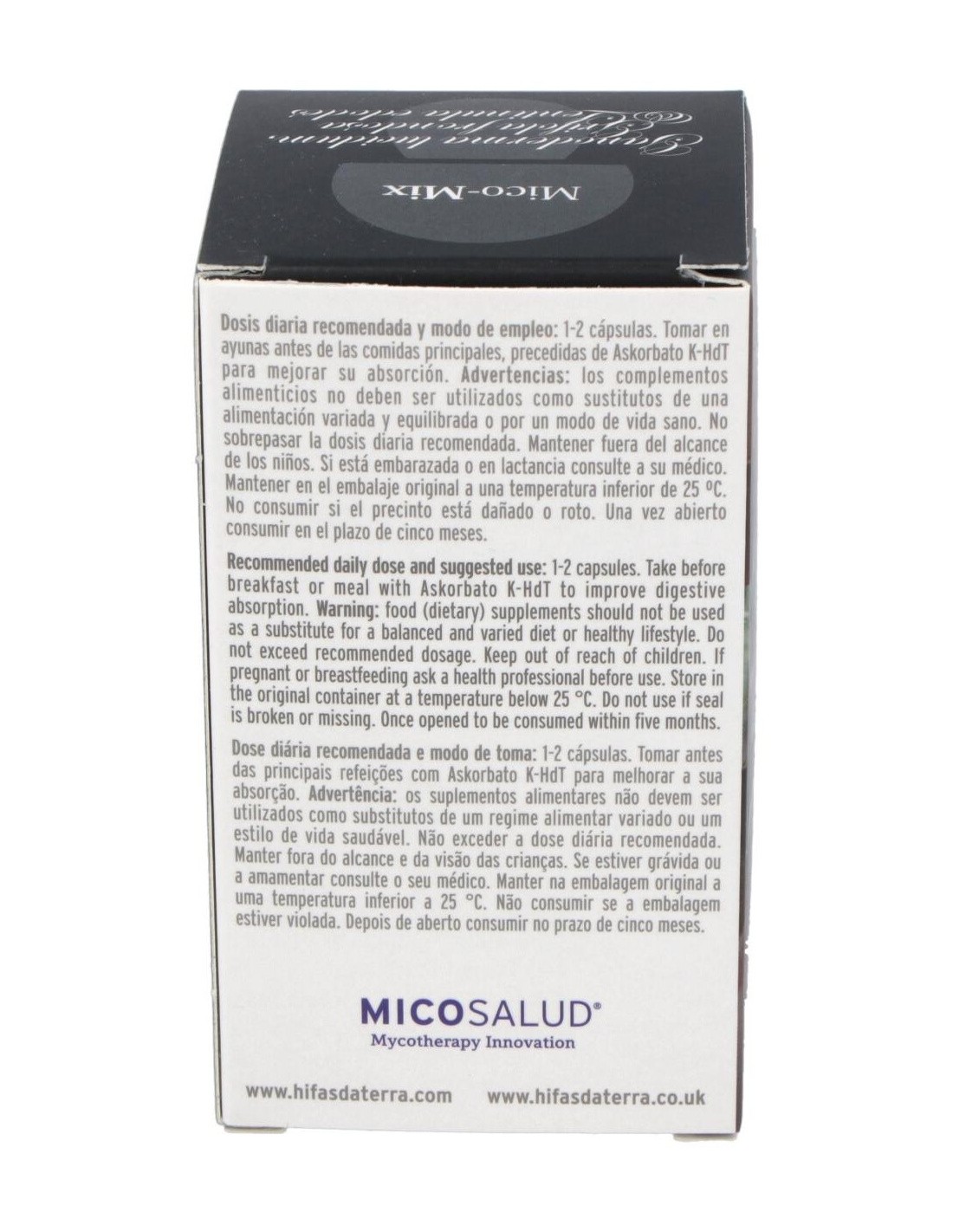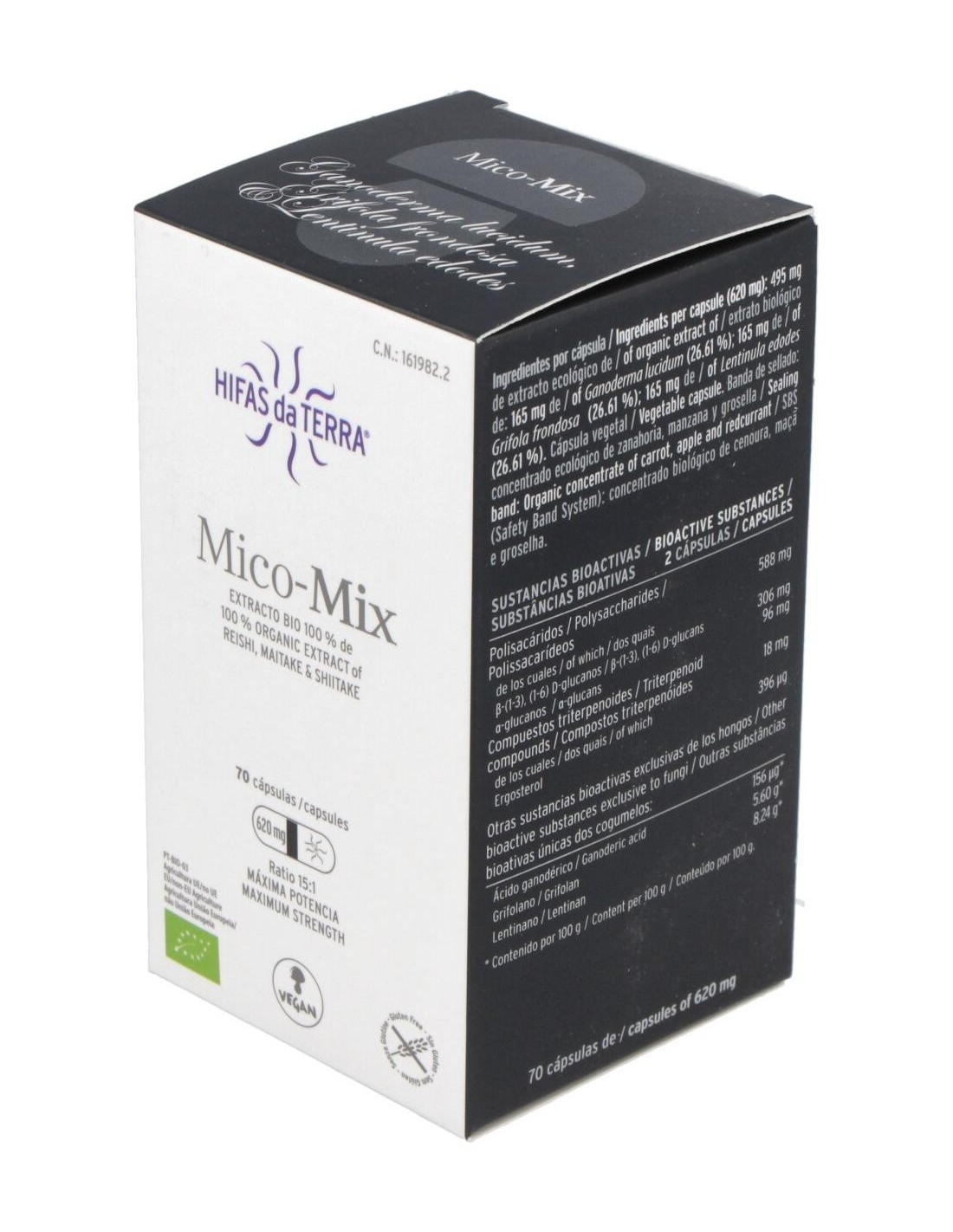 Mico Mix Extracto de 3 hongos medicinales es un complemento alimenticio de alta concentración en cápsulas. Solo contiene extracto puro y ecológico de Reishi, Maitake y Shiitake. Esta sinergia de extractos tiene un alto contenido de nutrientes como beta-glucanos, vitaminas, aminoácidos esenciales, etc. Con el fin de preservar las cualidades de nuestros extractos, sellamos cada cápsula con una banda antioxidación.Lentinula edodes Lentinula edodes, hongo nativo del Este del continente asiático. Esta especie ha sido cultivado en la antigua China e integrado desde hace siglos en la alimentación Japonesa. Su nombre deriva de Shii (una variedad de castaño) y Take (hongo) ya que crece de forma espontánea sobre troncos muertos de estos árboles. Se caracteriza por formar setas cuyo sombrero oscila entre tonos marrones y dorados. Sobre el sombrero suele tener un moteado de color gris oscuro. El pie es robusto y presenta un color más claro. Ganoderma lucidumReishi, Ganoderma lucidum, es uno de los hongos más empleados en la Medicina Tradicional China (MTC) junto con otras especies como Shiitake y Maitake. Este hongo, de la familia de las ganodermatáceas, se puede encontrar sobre troncos de madera de roble, pero precisamente no se considera un buen comestible por su sabor amargo y su consistencia leñosa. Su sombrero, de forma arriñonada y con tonos rojizos y negros, le otorgan un aspecto lúcido, característica definida en su nombre científico. En Oriente es conocido como hongo de la inmortalidad y de acuerdo con distintos documentos, empezó a emplearse en China hace más de 4.000 años. Además, ha sido reconocido entre las 10 Sustancias Terapéuticas más Eficaces. Se trata de una variedad adaptógena, esto es, posee la cualidad de ayudar a un organismo a adaptarse a su entorno. Grifola frondosaMaitake, Grifola frondosa, crece sobre todo en otoño sobre tocones de robles, castaños y hayas. Desarrolla un carpóforo poroso y ramificado en tonos grises-acastañados. Es un hongo cosmopolita pero principalmente conocido y utilizado en Japón.Según la tradición el nombre hongo danzante deriva del hecho que antiguamente el que encontraba este hongo bailaba alegremente por que lo podía cambiar por su peso en oro. Composición activa por cápsula: