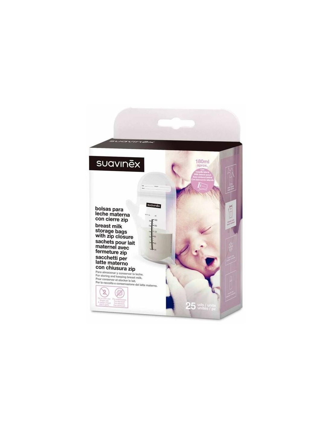 SUAVINEXEmbalagem de 25 sacos de armazenamento para leite materno com fecho de correr, com capacidade para 180ml. Os sacos de armazenamento permitem que o leite materno recém-extraído seja mantido hermeticamente fechado na geladeira ou no freezer e pronto para uso quando necessário. Seu fecho de correr permite que seja aberto e fechado facilmente, evitando vazamentos. Compatível com aquecedores de biberões específicos que permitem aquecer sacos de leite materno. Descartável e pré-esterilizado. Formato empilhável para que ocupem pouco espaço na geladeira ou no freezer.