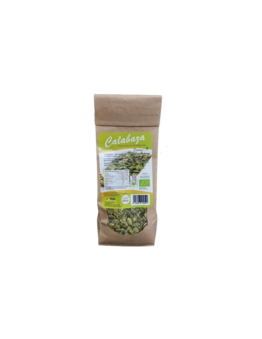 Sementes de abóbora provenientes da agricultura biológica. Valor nutricional por 100 g: Energia: 560 Kcal Gorduras: 49g Dos quais saturados: 8,8g Carboidratos: 4,7g Dos quais açúcares: 1,4g Fibra alimentar: 6g Proteínas: 29g Sal: 0,0007g *Pode conter nozes e gergelim.