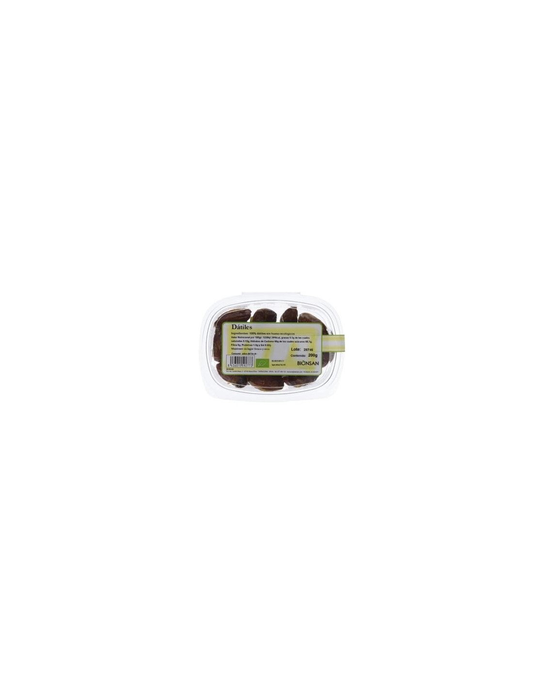 100% dátiles sin hueso ecológico.\ \ Valor nutricional por 100 g:\ Energía: 1220KJ/291Kcal\ Proteína: 1.9g.\ Grasa: 0.5g\ De las cuales saturadas: 0.13g\ Hidratos de carbono: 68g\ De los cuales azúcares: 66.7g.\ Fibra: 9g.\ Sal: 0.09g. \ \ *Puede contener trazas de gluten, soja, frutos secos, sésamo y apio.
