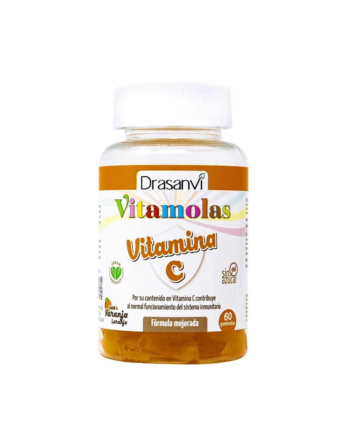 La Vitamina C es una vitamina soluble en agua. Con el fin conservar un estado de salud óptimo, se recomienda tomar unos 10 mg de esta vitamina al día. La dosis diaria aportada por las Vitamolas de Vitamina C de Drasanvi aporta el doble de los valores de referencia nutricionales para esta vitamina. La vitamina C contribuye al funcionamiento normal del sistema inmunitario.Composición activa por gominola:80 mg de vitamina C.Ingredientes:Edulcorante (Maltitol), Agua, Edulcorante (Sorbitol), Gelificante (Gelatina), Ácido L-ascórbico (Vitamina C) 160 mg, Acidulante (Ácido cítrico), Aroma (Aroma naranja), Colorante natural (Curcumina 0,4 mg), Agente de recubrimiento (Cera de abeja), Agente de recubrimiento (Cera carnauba).Modo de empleo:Tomar 2 gominolas en cualquier momento del día.Presentación:Envase de 60 gominolas sabor naranja.Recomendaciones y advertencias:No contiene gluten, azúcar ni alérgenos.
