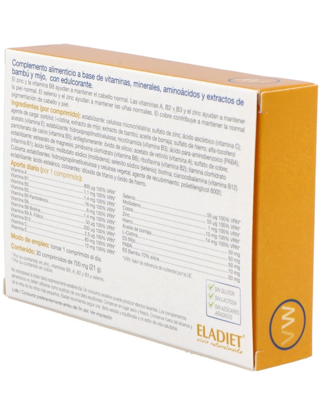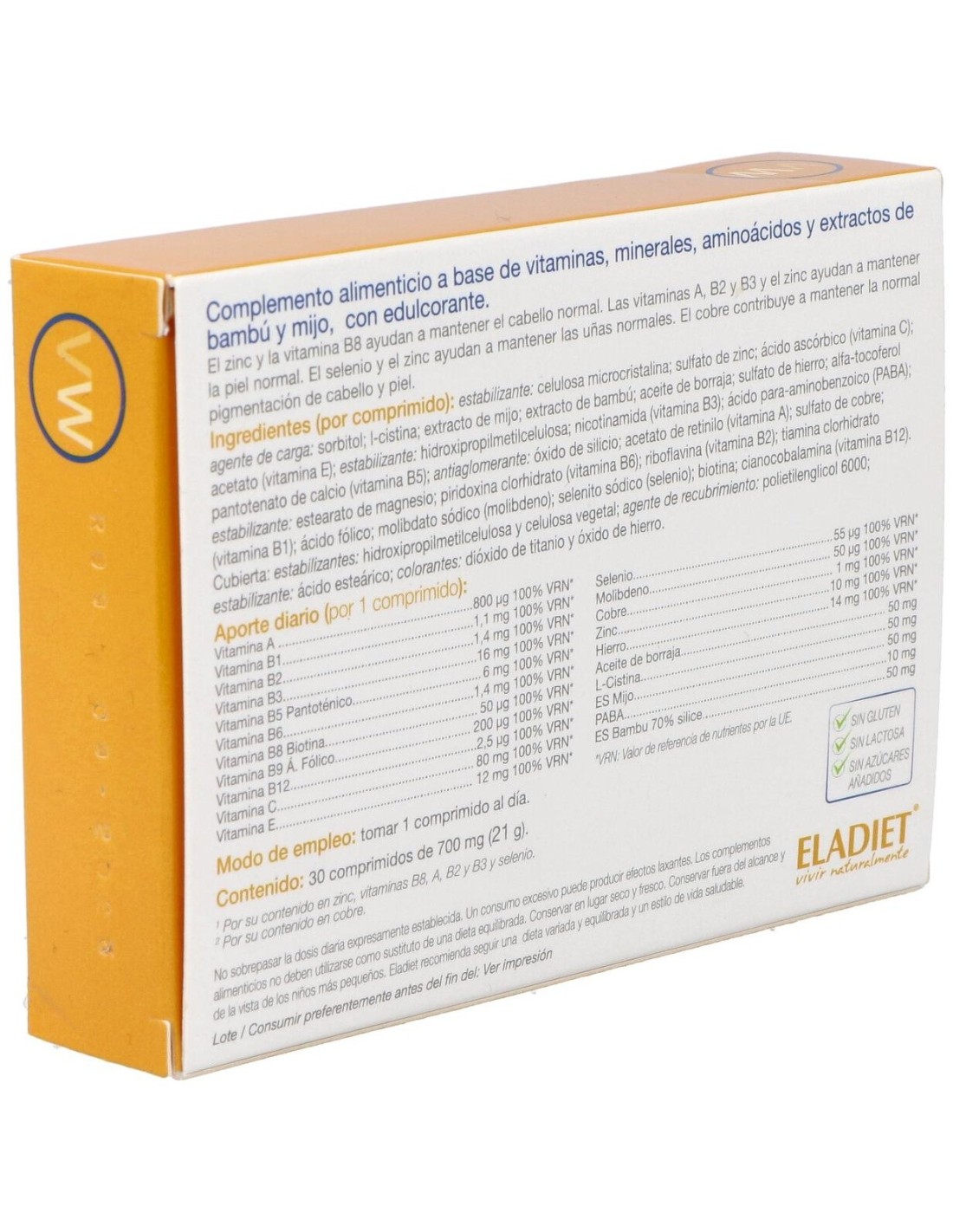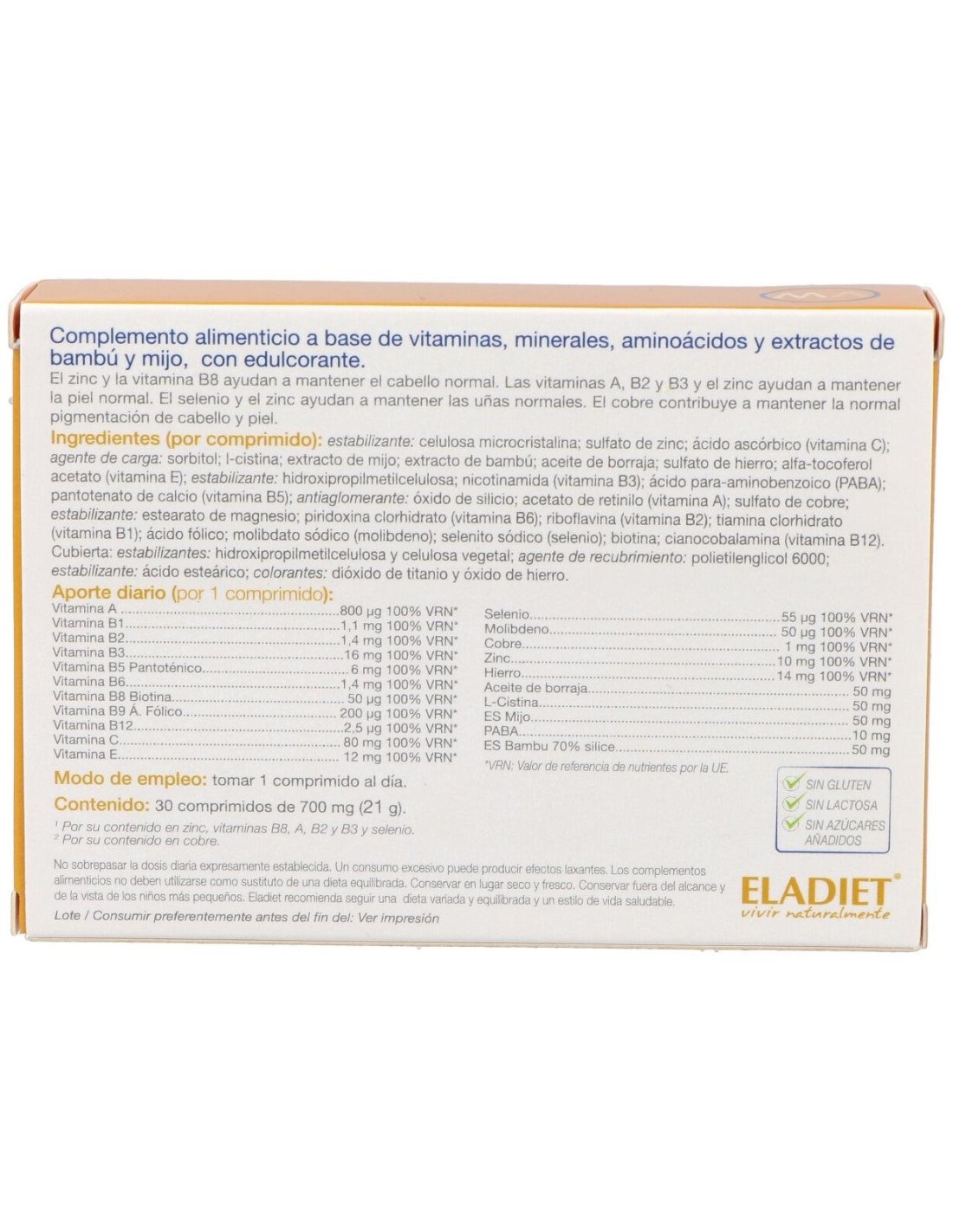 Complemento alimenticio a base de vitaminas, minerales, aminoácidos y extractos de bambú y mijo. Indicado para la salud de cabello, piel y uñas.