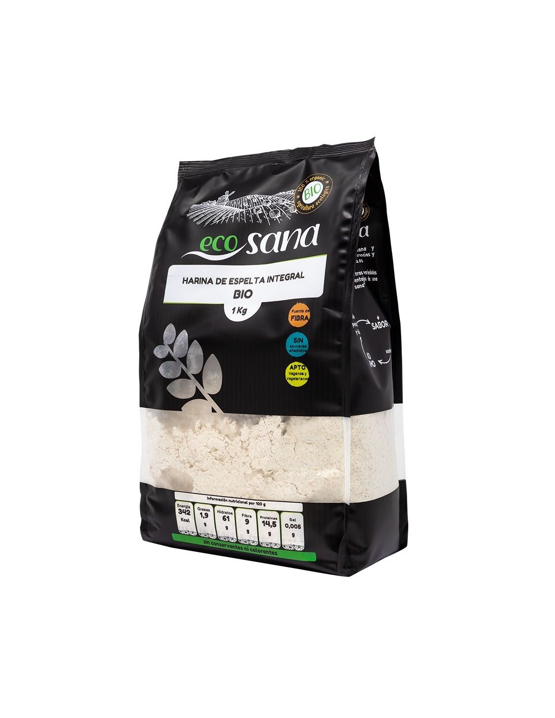 Ingredientes:Harina de espelta integral*. (*) Procedente de agricultura ecológica.Valor nutricional por 100 gramos:
