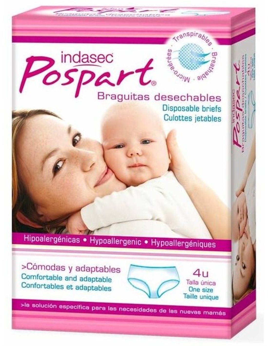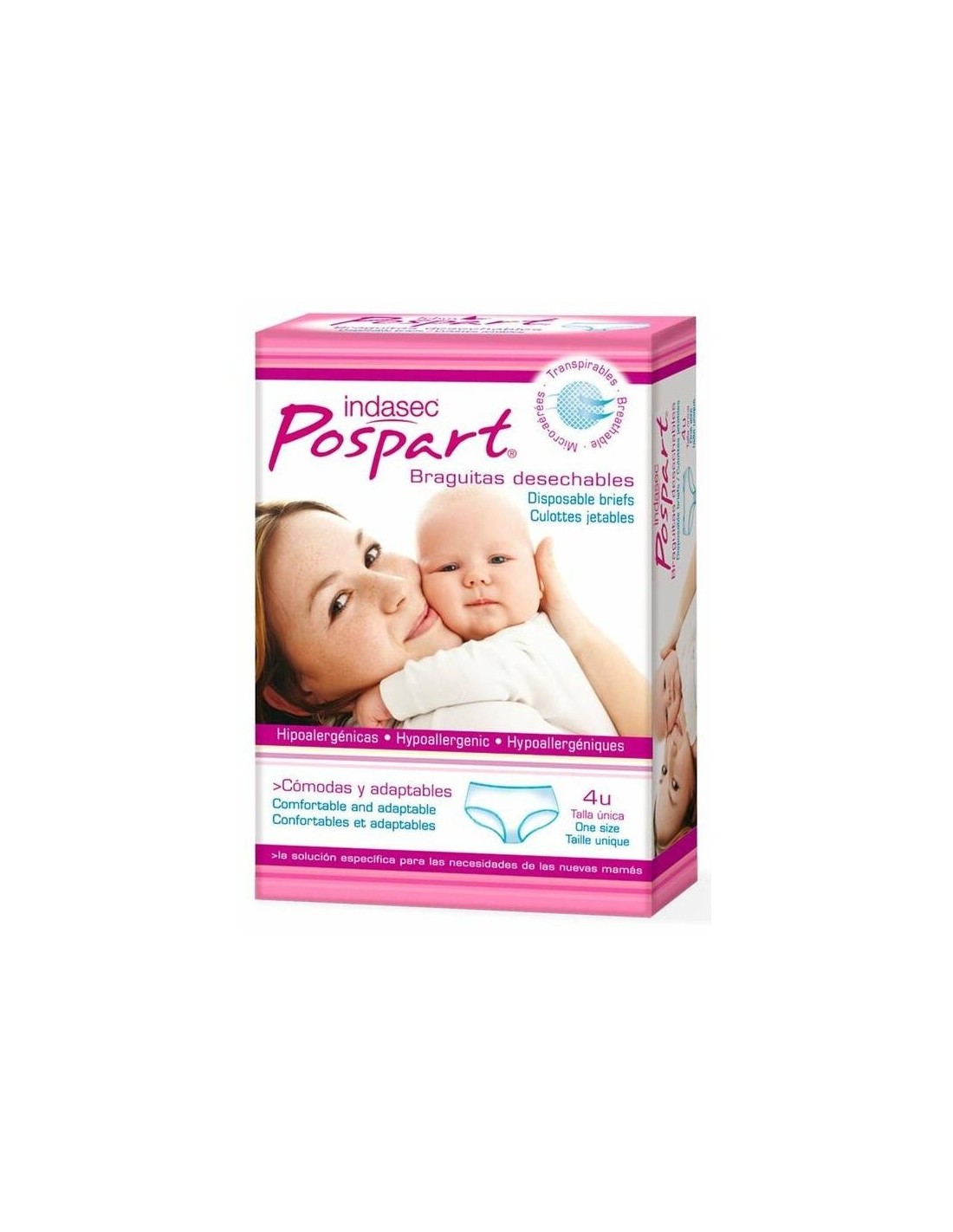 Braguitas Indasec® Pospart desechables han sido diseñadas para los días posteriores al parto, especialmente indicadas para sujetar las compresas Indasec® Pospart primero días. Estas braguitas son un producto higiénico desechable e hipoalergénicas.