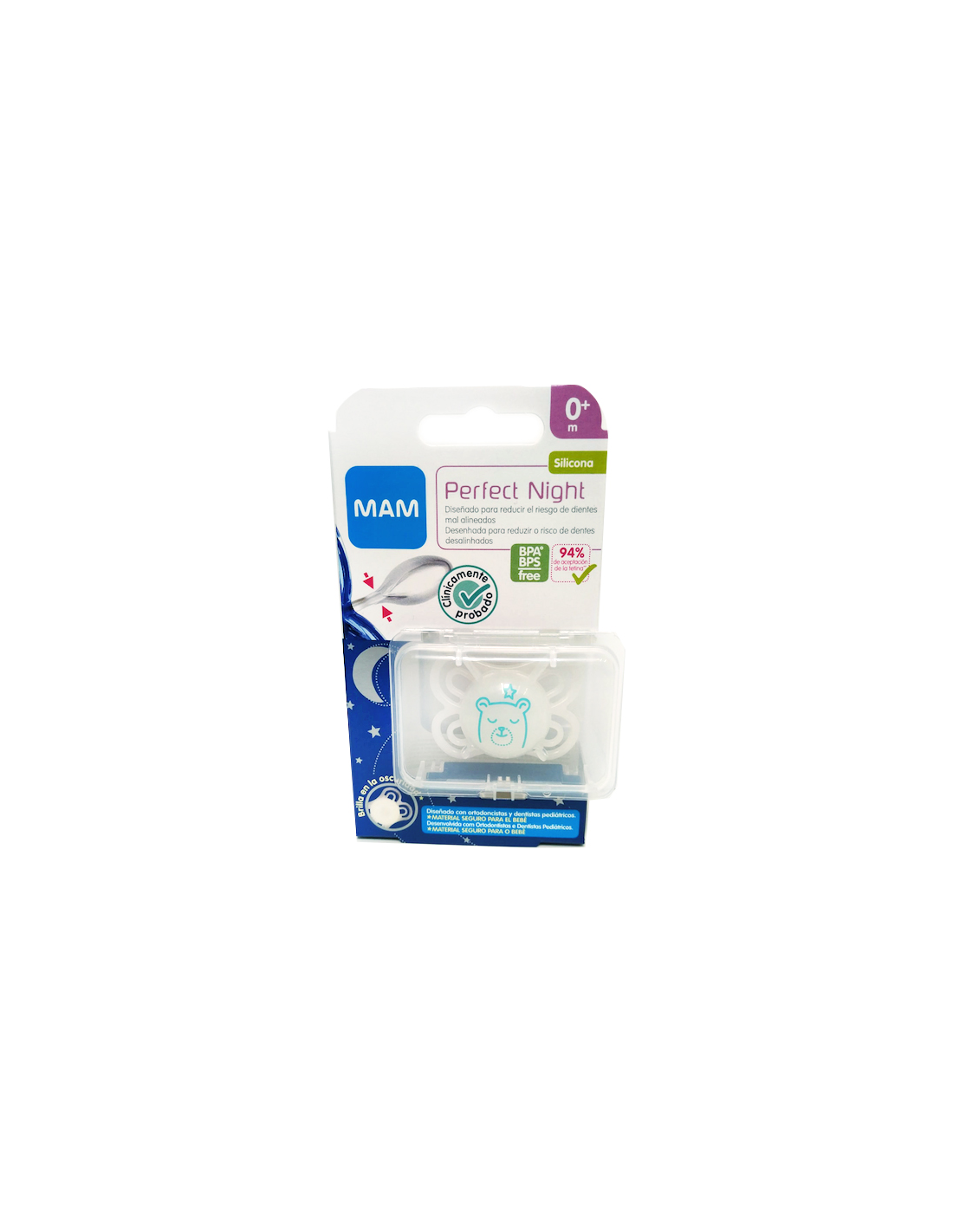 Chupeta Mam Baby Perfect Night Silicone 0+ 1pc N. *A cor ou desenho pode variar dependendo da disponibilidade.